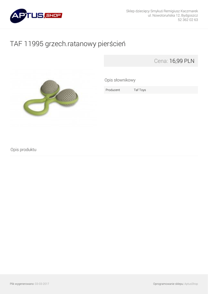 Sklep dziecięcy Smykuś Remigiusz Kaczmarek ul. Nowotoruńska 12, Bydgoszcz 52 362 02 63 TAF 11995 grzech.ratanowy pierścień Cena: 16,99 PLN Opis słownikowy Producent Taf Toys Opis produktu Plik wygenerowano: 03-03-2017 Powered by TCPDF (www.tcpdf.org) Oprogramowanie sklepu: AptusShop
