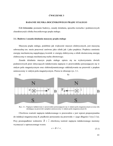 ĆWICZENIE 3 BADANIE SILNIKA BOCZNIKOWEGO PRĄDU STAŁEGO Cel ćwiczenia: poznanie budowy, zasady działania, sposobu rozruchu i podstawowych charakterystyk silnika bocznikowego prądu stałego. 3.1. Budowa i zasada działania maszyny prądu stałego Maszyna prądu stałego, podobnie jak większość maszyn elektrycznych, jest maszyną odwracalną tzn. może pracować zarówno jako silnik jak i jako prądnica. Prądnica zamienia energię mechaniczną napędzającą twornik w energię elektryczną a silnik dostarczoną energię elektryczną w energię mechaniczną ruchu obrotowego. Zasada działania maszyn prądu stałego opiera się na wykorzystaniu dwóch podstawowych praw dotyczących indukowania napięcia w przewodniku poruszającym się w stałym polu magnetycznym oraz elektrodynamicznego oddziaływania na przewód z prądem umieszczony w stałym polu magnetycznym. Prawa te obrazuje rys. 3.1. a) b) Rys. 3.1. Napięcie indukowane w przewodzie poruszającym się w stałym polu magnetycznym a) oraz siła działająca na przewód z prądem umieszczony w stałym polu magnetycznym b) Chwilowa wartość napięcia indukowanego w przewodzie e jest wprost proporcjonalna do indukcji magnetycznej B, prędkości poruszania się przewodu v i jego długości l (rys.3.1a). Przy prostopadłości wektorów B i v chwilową wartość napięcia indukowanego możemy wyznaczyć z uproszczonego wzoru e = B ⋅ l ⋅ν . (3.1) 41 Wybrane zagadnienia elektrotechniki i elektroniki Zwrot tego napięcia określa reguła prawej dłoni. Regułę tą możemy zdefiniować następująco, jeżeli prawą dłoń umieścimy w polu magnetycznym tak, że linie sił pola magnetycznego będą wchodziły w otwartą dłoń, a odgięty kciuk wskaże kierunek ruchu przewodu, to wyciągnięte palce wskażą zwrot indukowanego napięcia (rys.3.1a). Siła Fe działająca na przewód z prądem umieszczony w stałym polu magnetycznym jest proporcjonalna do indukcji B i długości przewodu l oraz do prądu w przewodzie I (rys.3.1b). Wartość tej siły w najprostszym przypadku określa zależność Fe = B ⋅ I ⋅ l , (3.2) a kierunek jej działania określa się regułą lewej dłoni. Regułę tą możemy zdefiniować następująco, jeżeli lewą dłoń umieścimy w polu magnetycznym tak, że linie sił pola będą wchodziły w otwartą dłoń, a wyciągnięte palce będą wskazywały kierunek prądu, to odgięty kciuk wskaże kierunek działania siły (rys.3.1b) a) 9 7 b) uzwojenie twornika 2 5 rdzeń bieguna głównego uzwojenie wzbudzenia komutator 1 6 rdzeń twornika wał łożysko 3 wentylator 10 jarzmo stojana 4 8 tarcza łożyskowa trzymadło szczotkowe i szczotka Rys. 3.2. Budowa maszyny prądu stałego: szkic przekroju poprzecznego a), widok wykroju rzeczywistej maszyny b). 1- twornik, 2 - jarzmo stojana, 3 - biegun główny, 4 - nabiegunnik, 5 - biegun pomocniczy (komutacyjny), 6 - uzwojenie wzbudzenia, 7 - uzwojenie biegunów pomocniczych, 8 - uzwojenie twornika, 9 komutator, 10 - szczotki. Przekrój poprzeczny szkicu budowy maszyny prądu stałego przedstawia rys.3.2a a widok wykroju rzeczywistej maszyny rys.3.2b. Maszyna prądu stałego składa się z części nieruchomych zwanych stojanem i części wirujących zwanych twornikiem. Do stojana należy jarzmo (wykonane z materiału ferromagnetycznego), do którego przytwierdzone są bieguny główne oraz bieguny pomocnicze (jeśli istnieją) wraz z uzwojeniami i tarcze łożyskowe. Bieguny główne mają za zadanie wytworzenie stałego pola magnetycznego, czyli wzbudzenia maszyny. Stały strumień magnetyczny może być wytworzony przez magnesy trwałe lub 42 Badanie silnika bocznikowego prądu stałego cewkę skupioną nawiniętą na biegunach głównych zasilaną prądem stałym (jak na rys.3.2). W maszynach większej mocy (zwykle powyżej 1kW) między biegunami głównymi umieszcza się bieguny pomocnicze. Bieguny te mają za zadanie ograniczenie oddziaływania twornika oraz poprawę warunków komutacji. Jarzmo stojana wykonuje się najczęściej z litego ferromagnetyka, a bieguny główne i pomocnicze z blach ze stali elektrotechnicznej w celu minimalizacji strat związanych z prądami wirowymi wywołanymi składową zmienną strumienia magnetycznego. Twornik maszyny składa się z wału, na który wprasowany jest rdzeń i komutator. Rdzeń twornika pakietuje się z blach ze stali elektrotechnicznej pokrytych cienką warstwą lakieru izolacyjnego. Blachy mają po obwodzie zewnętrznym wykrawane żłobki. W żłobkach rdzenia twornika znajdują się uzwojenia połączone odpowiednio z wycinkami komutatora tak, aby pod jednoimiennym biegunem przez wszystkie pręty uzwojenia płynął prąd tylko w jednym kierunku. Komutator ma odpowiednią liczbę wycinków wykonanych z miedzi z odpowiednimi domieszkami. Wycinki komutatora, do których przyłącza się początki i końce odpowiednich zezwojów są przedzielane przekładkami izolacyjnymi. Komutator wykonuje się w postaci walca, po którego powierzchni zewnętrznej ślizgają się przewodzące szczotki wykonane głównie z grafitu z domieszkami. Podstawowym elementem uzwojenia twornika jest zezwój, którego rozpiętość jest w przybliżeniu równa podziałce biegunowej. Przy takiej rozpiętości zezwoju jest on skojarzony z możliwie największym strumieniem magnetycznym. Zezwoje te łączone są ze sobą szeregowo (poprzez wycinki komutatora) i tworzą między szczotkami gałęzie równoległe. Liczba gałęzi jest zawsze parzysta i zależy od rodzaju zastosowanego uzwojenia. Dla uzwojeń falistych twornik ma zawsze dwie gałęzie równoległe (jedną parę), a dla uzwojeń pętlicowych liczba par gałęzi równoległych jest równa liczbie par biegunów. Uzwojenia tworników maszyn prądu stałego są więc uzwojeniami zamkniętymi. Do uzwojeń doprowadzany (lub odprowadzany) jest prąd za pomocą zestyku szczotka – komutator. W czasie wirowania twornika po komutatorze maszyny ślizgają się szczotki znajdujące s