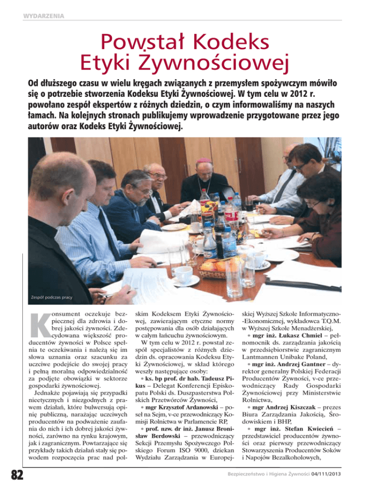 WYDARZENIA Powstał Kodeks Etyki Żywnościowej Od dłuższego czasu w wielu kręgach związanych z przemysłem spożywczym mówiło się o potrzebie stworzenia Kodeksu Etyki Żywnościowej. W tym celu w 2012 r. powołano zespół ekspertów z różnych dziedzin, o czym informowaliśmy na naszych łamach. Na kolejnych stronach publikujemy wprowadzenie przygotowane przez jego autorów oraz Kodeks Etyki Żywnościowej. Zespół podczas pracy K onsument oczekuje bezpiecznej dla zdrowia i dobrej jakości żywności. Zdecydowana większość producentów żywności w Polsce spełnia te oczekiwania i należą się im słowa uznania oraz szacunku za uczciwe podejście do swojej pracy i pełną moralną odpowiedzialność za podjęte obowiązki w sektorze gospodarki żywnościowej. Jednakże pojawiają się przypadki nieetycznych i niezgodnych z prawem działań, które bulwersują opinię publiczną, narażając uczciwych producentów na podważenie zaufania do nich i ich dobrej jakości żywności, zarówno na rynku krajowym, jak i zagranicznym. Powtarzające się przykłady takich działań stały się powodem rozpoczęcia prac nad pol- 82 skim Kodeksem Etyki Żywnościowej, zawierającym etyczne normy postępowania dla osób działających w całym łańcuchu żywnościowym. W tym celu w 2012 r. powstał zespół specjalistów z różnych dziedzin ds. opracowania Kodeksu Etyki Żywnościowej, w skład którego weszły następujące osoby: ● ks. bp prof. dr hab. Tadeusz Pikus – Delegat Konferencji Episkopatu Polski ds. Duszpasterstwa Polskich Przetwórców Żywności, ● mgr Krzysztof Ardanowski – poseł na Sejm, v-ce przewodniczący Komisji Rolnictwa w Parlamencie RP, ● prof. nzw. dr inż. Janusz Bronisław Berdowski – przewodniczący Sekcji Przemysłu Spożywczego Polskiego Forum ISO 9000, dziekan Wydziału Zarządzania w Europej- skiej Wyższej Szkole Informatyczno-Ekonomicznej, wykładowca T.Q.M. w Wyższej Szkole Menadżerskiej, ● mgr inż. Łukasz Chmiel – pełnomocnik ds. zarządzania jakością w przedsiębiorstwie zagranicznym Lantmannen Unibake Poland, ● mgr inż. Andrzej Gantner – dyrektor generalny Polskiej Federacji Producentów Żywności, v-ce przewodniczący Rady Gospodarki Żywnościowej przy Ministerstwie Rolnictwa, ● mgr Andrzej Kiszczak – prezes Biura Zarządzania Jakością, Środowiskiem i BHP, ● mgr inż. Stefan Kwiecień – przedstawiciel producentów żywności oraz pierwszy przewodniczący Stowarzyszenia Producentów Soków i Napojów Bezalkoholowych, Bezpieczeństwo i Higiena Żywności 04/111/2013 WYDARZENIA Od lewej: Stefan Kwiecień, Tadeusz Wojciechowski, Andrzej Kiszczak, prof. Janusz B. Berdowski, prof. Irena Ozimek, ks. bp prof. Tadeusz Pikus, Andrzej Gantner, ks. Michał Szwemin, ks. dr Artur Wysocki dr hab. Irena Ozimek, prof. SGGW – prodziekan ds. dydaktyki Wydziału Nauk o Żywieniu Człowieka i Konsumpcji SGGW, ● ks. mgr lic. Michał Szwemin – absolwent Papieskiego Instytutu Biblijnego w Rzymie; duszpasterz pomocniczy przedsiębiorców i organizatorów życia gospodarczego w Archidiecezji Warszawskiej; Kapelan Krajowej Izby Gospodarczej, ● mgr Grzegorz Trochimczuk – przedstawiciel producentów biznesu żywnościowego, ● mgr Tadeusz Wojciechowski – redaktor naczelny czasopisma „Bezpieczeństwo i Higiena Żywności”, ● ks. dr Artur Wysocki – wicedyrektor Instytutu Socjologii UKSW, diecezjalny duszpasterz producentów i przetwórców żywności, ● inż. Jan Tadeusz Woźniak – wiceprezes Spółdzielni Piekarsko-Ciastkarskiej w Warszawie. Formuła i treść Kodeksu Etyki Żywnościowej były przedmiotem dyskusji i uzgodnień z przedstawicielami organizacji zajmujących się produkcją i obrotem żywności oraz innymi specjalistami z zakresu etyki gospodarczej i żywnościowej. Z uwagi na fakt, że adresatem tego kodeksu mają być wszyscy pracownicy zatrudnieni w tej sferze, postanowiono, aby jego treść była zwięzła i ujmowała jedynie najważniejsze wskazania etyczne w tym zakresie. Wskazania te będą punktem odniesienia do właściwych konkret● nych wyborów i działań wszystkich producentów i przetwórców żywności, mających na względzie dobro i zdrowie konsumenta żywności. Uzgodniony projekt Kodeksu Etyki Żywnościowej zostaje obecnie poddany szerszej konsultacji w środowisku, do którego jest adresowany. Na- leży wyrazić nadzieję, że zostanie w nim życzliwie przyjęty, zaakceptowany i stosowany. Działania etyczne stają się obecnie także przedmiotem audytu i można sądzić, że kodeks ten będzie również pomocny w tym względzie, zwłaszcza dla mniejszych ■ producentów i przetwórców. Szanowni producenci żywności, W dobie rosnącej wymiany towarów spożywczych i działań na globalnym rynku oraz zwiększonego przemieszczania się ludzi rośnie znaczenie dziań etycznych w poszczególnych ogniwach łańcucha żywnościowego, podanego w Normie PN – EN – ISO 22000:2006 i F.S.S.C. (Food Safety System Certification). Polska to ważny producent żywności, która z powodu swojej jakości i naturalności cieszy się renomą, i choć zdarzają się nieprawidłowości, to należy pamiętać, że są one generowane przez ułamek nieuczciwych podmiotów. Niestety wpływa to na wizerunek całej naszej żywności w oczach krajowych i zagranicznych konsumentów oraz mediów. Żeby utrzymać i rozwijać pozytywne zjawiska w przemyśle i handlu, przedstawiciele sektora rolno-spożywczego podjęli inicjatywę stworzenia w Polsce Kodeksu Etyki Żywnościowej. Został on przygotowany w gronie uznanych ekspertów: przedstawicieli producentów i dystrybutorów żywności, naukowców i dziennikarzy. Jako koordynator zespołu pragnę podkreślić, że dużą rolę w szczęśliwym sfinalizowaniu prac nad Kodeksem odegrały osoby duchowne: ks. bp. prof. Tadeusz Pikus i ks. dr Artur Wysocki oraz ks. Michał Szwemin. Moje podziękowanie przekazuję członkom zespołu, którzy bardzo aktywni
