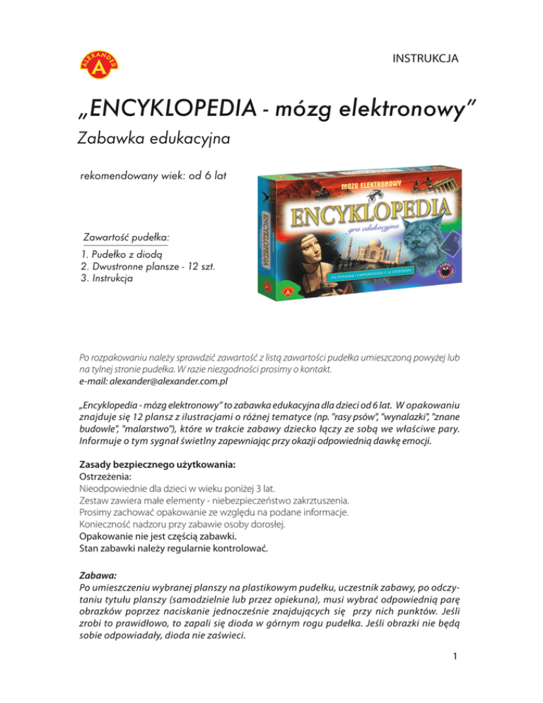 INSTRUKCJA „ENCYKLOPEDIA - mózg elektronowy” Zabawka edukacyjna rekomendowany wiek: od 6 lat Zawartość pudełka: 1. Pudełko z diodą 2. Dwustronne plansze - 12 szt. 3. Instrukcja Po rozpakowaniu należy sprawdzić zawartość z listą zawartości pudełka umieszczoną powyżej lub na tylnej stronie pudełka. W razie niezgodności prosimy o kontakt. e-mail: [email protected] „Encyklopedia - mózg elektronowy” to zabawka edukacyjna dla dzieci od 6 lat. W opakowaniu znajduje się 12 plansz z ilustracjami o różnej tematyce (np. "rasy psów", "wynalazki", "znane budowle", "malarstwo"), które w trakcie zabawy dziecko łączy ze sobą we właściwe pary. Informuje o tym sygnał świetlny zapewniając przy okazji odpowiednią dawkę emocji. Zasady bezpiecznego użytkowania: Ostrzeżenia: Nieodpowiednie dla dzieci w wieku poniżej 3 lat. Zestaw zawiera małe elementy - niebezpieczeństwo zakrztuszenia. Prosimy zachować opakowanie ze względu na podane informacje. Konieczność nadzoru przy zabawie osoby dorosłej. Opakowanie nie jest częścią zabawki. Stan zabawki należy regularnie kontrolować. Zabawa: Po umieszczeniu wybranej planszy na plastikowym pudełku, uczestnik zabawy, po odczytaniu tytułu planszy (samodzielnie lub przez opiekuna), musi wybrać odpowiednią parę obrazków poprzez naciskanie jednocześnie znajdujących się przy nich punktów. Jeśli zrobi to prawidłowo, to zapali się dioda w górnym rogu pudełka. Jeśli obrazki nie będą sobie odpowiadały, dioda nie zaświeci. 1