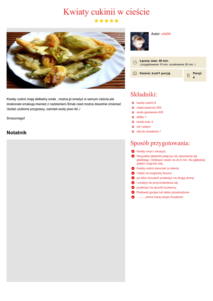Kwiaty cukinii w cieście Autor: cris04 Łączny czas: 40 min. ( przygotowanie 10 min. oczekiwanie 30 min. ) Kalorie: kcal/1 porcję Kwiaty cukinii mają delikatny smak , można je smażyć w samym cieście,ale doskonale smakują również z nadzieniem.Smak ciast można dowolnie zmieniać /dodać ulubione przyprawy, zamiast wody piwo itd../ Porcji: 4 Składniki: kwiaty cukinii 8 mąka pszenne 200 woda gazowana 400 Smacznego! żółtko 1 kostki lodu 4 sól i pieprz Notatnik olej do smażenia 1 Sposób przygotowania: Kwiaty umyć i osuszyć. Wszystkie składniki połączyć do utworzenia się gładkiego .Odstawić ciasto na ok.5 min. Na głębokiej patelni rozgrzać olej. Kwiaty cukinii zanurzać w cieście i kłaść na rozgrzany tłuszcz po kilku minutach przełożyć na drugą stronę i smażyć do przyrumienienia się przełożyć na ręcznik kuchenny. Podawać gorące lub lekko przestudzone ...........zimne tracą swoja chrupkość
