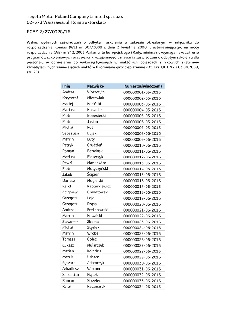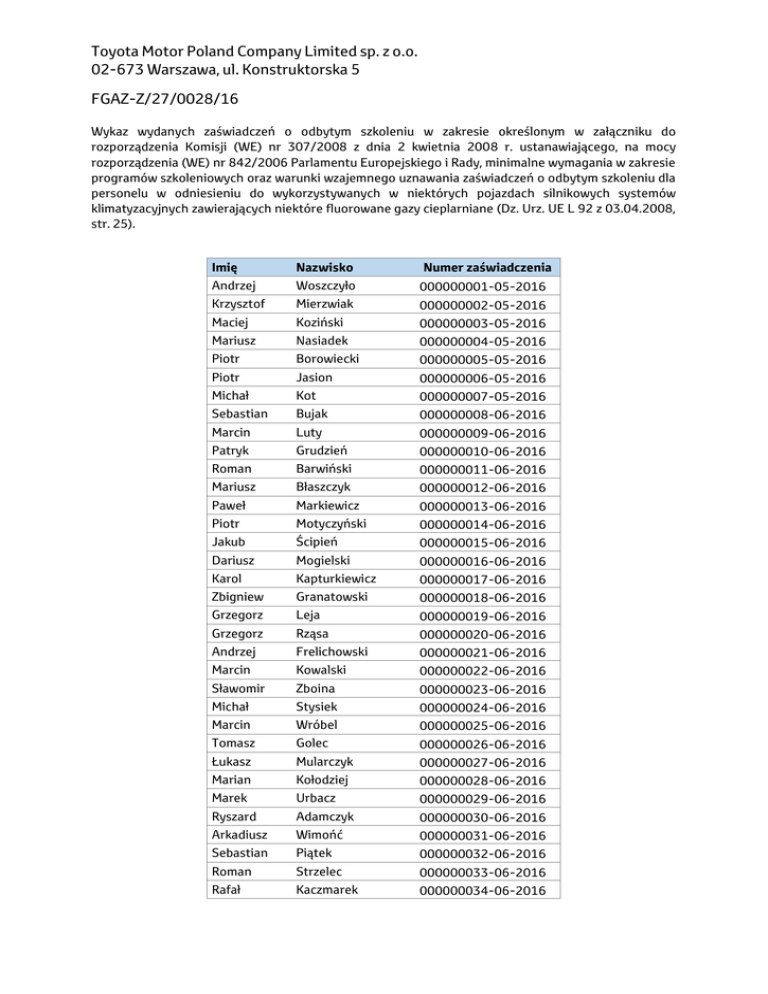 Toyota Motor Poland Company Limited sp. z o.o. 02-673 Warszawa, ul. Konstruktorska 5 FGAZ-Z/27/0028/16 Wykaz wydanych zaświadczeń o odbytym szkoleniu w zakresie określonym w załączniku do rozporządzenia Komisji (WE) nr 307/2008 z dnia 2 kwietnia 2008 r. ustanawiającego, na mocy rozporządzenia (WE) nr 842/2006 Parlamentu Europejskiego i Rady, minimalne wymagania w zakresie programów szkoleniowych oraz warunki wzajemnego uznawania zaświadczeń o odbytym szkoleniu dla personelu w odniesieniu do wykorzystywanych w niektórych pojazdach silnikowych systemów klimatyzacyjnych zawierających niektóre fluorowane gazy cieplarniane (Dz. Urz. UE L 92 z 03.04.2008, str. 25). Imię Nazwisko Numer zaświadczenia Andrzej Woszczyło 000000001-05-2016 Krzysztof Mierzwiak 000000002-05-2016 Maciej Koziński 000000003-05-2016 Mariusz Nasiadek 000000004-05-2016 Piotr Borowiecki 000000005-05-2016 Piotr Jasion 000000006-05-2016 Michał Kot 000000007-05-2016 Sebastian Bujak 000000008-06-2016 Marcin Luty 000000009-06-2016 Patryk Grudzień 000000010-06-2016 Roman Barwiński 000000011-06-2016 Mariusz Błaszczyk 000000012-06-2016 Paweł Markiewicz 000000013-06-2016 Piotr Motyczyński 000000014-06-2016 Jakub Ścipień 000000015-06-2016 Dariusz Mogielski 000000016-06-2016 Karol Kapturkiewicz 000000017-06-2016 Zbigniew Granatowski 000000018-06-2016 Grzegorz Leja 000000019-06-2016 Grzegorz Rząsa 000000020-06-2016 Andrzej Frelichowski 000000021-06-2016 Marcin Kowalski 000000022-06-2016 Sławomir Zboina 000000023-06-2016 Michał Stysiek 000000024-06-2016 Marcin Wróbel 000000025-06-2016 Tomasz Golec 000000026-06-2016 Łukasz Mularczyk 000000027-06-2016 Marian Kołodziej 000000028-06-2016 Marek Urbacz 000000029-06-2016 Ryszard Adamczyk 000000030-06-2016 Arkadiusz Wimońć 000000031-06-2016 Sebastian Piątek 000000032-06-2016 Roman Strzelec 000000033-06-2016 Rafał Kaczmarek 000000034-06-2016 Toyota Motor Poland Company Limited sp. z o.o. 02-673 Warszawa, ul. Konstruktorska 5 FGAZ-Z/27/0028/16 Imię Nazwisko Numer zaświadczenia Przemysław Serżysko 000000035-06-2016 Konrad Szewczyk 000000036-06-2016 Jacek Polkowski 000000037-06-2016 Kamil Ezman 000000038-06-2016 Zbigniew Sówka 000000039-06-2016 Ziemowit Streicher 000000040-06-2016 Zbigniew Wróbel 000000041-06-2016 Dariusz Wójcik 000000042-06-2016 Marcin Pikuła 000000043-06-2016 Maciej Półkownik 000000044-06-2016 Marcin Jędral 000000045-06-2016 Sebastian Kalinowski 000000046-06-2016 Cezary Rojek 000000047-06-2016 Adam Rzeppka 000000048-06-2016 Bartosz Staniuk 000000049-06-2016 Andrzej Krauza 000000050-06-2016 Andrzej Złotowski 000000051-06-2016 Marek Czypionka 000000052-06-2016 Damian Laskowski 000000053-06-2016 Dominik Poziemski 000000054-06-2016 Adam Kurzela-Konieczny 000000055-06-2016 Sebastian Męcner 000000056-06-2016 Łukasz Małysa 000000057-06-2016 Krzysztof Tabor 000000058-06-2016 Marcin Adamiak 000000059-06-2016 Kamil Nowalski 000000060-06-2016 Robert Wasilewski 000000061-06-2016 Krzysztof Masny 000000062-06-2016 Tomasz Podgórski 000000063-06-2016 Krzysztof Popczyk 000000064-06-2016 Artur Stromecki 000000065-06-2016 Mateusz Kępski 000000066-06-2016 Rafał Marczewski 000000067-06-2016 Arkadiusz Muras 000000068-06-2016 Jarosław Fisiak 000000069-06-2016 Przemysław Płoski 000000070-06-2016 Tadeusz Jesionek 000000071-06-2016 Daniel Czarnecki 000000072-06-2016 Michał Rojek 000000073-06-2016 Damian Kwidziński 000000074-06-2016 Krzysztof Sieczkowski 000000075-06-2016 Toyota Motor Poland Company Limited sp. z o.o. 02-673 Warszawa, ul. Konstruktorska 5 FGAZ-Z/27/0028/16 Imię Nazwisko Numer zaświadczenia Dariusz Schutz 000000076-06-2016 Marcin Czubkowski 000000077-06-2016 Arkadiusz Karwowski 000000078-06-2016 Marek Kraśnicki 000000079-06-2016 Maciej Stefic 000000080-06-2016 Igor Adamoszek 000000081-06-2016 Sławomir Szczerba 000000082-06-2016 Piotr Urbanek 000000083-06-2016 Jarosław Piskorz 000000084-06-2016 Andrzej Wronowski 000000085-06-2016 Łukasz Gabara 000000086-06-2016 Paweł Szewczyk 000000087-06-2016 Sylwester Hallmann 000000088-06-2016 Sławomir Wojtaszek 000000089-06-2016 Marcin Nowak 000000090-06-2016 Robert Misztal 000000091-06-2016 Marcin Przybysz 000000092-06-2016 Marian Grudziński 000000093-06-2016 Apoloniusz Imiołek 000000094-06-2016 Krzysztof Pawlik 000000095-06-2016 Grzegorz Poradzisz 000000096-06-2016 Piotr Lewandowski 000000097-06-2016 Marcin Kluczek 000000098-06-2016 Dariusz Święch 000000099-06-2016 Piotr Dryja 000000100-06-2016 Michał Potacki 000000101-06-2016 Piotr Nowicki 000000102-06-2016 Michał Szczepanowski 000000103-06-2016 Paweł Boraca 000000104-06-2016 Rafał Szczepaniak 000000105-06-2016 Dawid Piekorz 000000106-06-2016 Krzysztof Badoń 000000107-06-2016 Jakub Banowicz 000000108-06-2016 Krystian Brząkała 000000109-06-2016 Marcin Domagała 000000110-06-2016 Marcin Walasek 000000111-06-2016 Radosław Ryba 000000112-06-2016 Dominik Iwaniuk 000000113-06-2016 Daniel Adamoszek 000000114-06-2016 Łukasz Błaszczyk 000000115-06-2016 Patryk Przetacki 000000116-06-2016 Toyota Motor Poland Company Limited sp. z o.o. 02-673 Warszawa, ul. Konstruktorska 5 FGAZ-Z/27/0028/16 Imię Nazwisko Numer zaświadczenia Marcin Woźniakowski 000000117-06-2016 Piotr Podeszwa 000000118-06-2016 Dariusz Marynowski 000000119-06-2016 Maciej Mącik 000000120-06-2016 Piotr Mazurek 000000121-06-2016 Piotr Osiński 000000122-06-2016 Marcin Jasiński 000000123-06-2016 Paweł Chmielewski 000000124-06-2016 Mateusz Kamiński 000000125-06-2016 Mirosław Kluska 000000126-06-2016 Paweł Książek 000000127-06-2016 Damian Obiegło 000000128-06-2016 Tomasz Rurzyński 000000129-06-2016 Roman Ryndak 000000130-06-2016 Rafał Waś 000000131-06-2016 Artur Żechowski 000000132-06-2016 Wiesław Budnicki 000000133-06-2016 Daniel Lach 000000134-06-2016