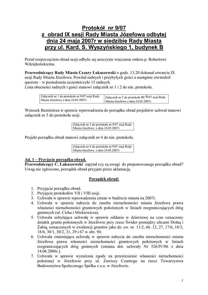 Protokół nr 9/07 z obrad IX sesji Rady Miasta Józefowa odbytej dnia 24 maja 2007r w siedzibie Rady Miasta przy ul. Kard. S. Wyszyńskiego 1, budynek B Przed rozpoczęciem obrad sesji odbyło się uroczyste wręczenie orderu p. Robertowi Wdziękońskiemu. Przewodniczący Rady Miasta Cezary Łukaszewski o godz. 13.20 dokonał otwarcia IX sesji Rady Miasta Józefowa. Powitał radnych i przybyłych gości a następnie stwierdził quorom – w posiedzeniu uczestniczyło 15 radnych. Lista obecności radnych i gości stanowi załącznik nr 1 i 2 do nin. protokołu. Załącznik nr 1 do protokołu nr 9/07 sesji Rady Miasta Józefowa z dnia 24.05.2007r Załącznik nr 2 do protokołu nr 9/07 sesji Rady Miasta Józefowa z dnia 24.05.2007r Wniosek Burmistrza w sprawie wprowadzenia do porządku obrad projektów uchwał stanowi załącznik nr 3 do protokołu sesji. Załącznik nr 3 do protokołu nr 9/07 sesji Rady Miasta Józefowa z dnia 24.05.2007r Projekt porządku obrad stanowi załącznik nr 4 do nin. protokołu. Załącznik nr 4 do protokołu nr 9/07 sesji Rady Miasta Józefowa z dnia 24.05.2007r Ad. 1 – Przyjęcie porządku obrad. Przewodniczący C. Łukaszewski zapytał czy są uwagi do proponowanego porządku obrad? Uwag nie zgłoszono, porządek obrad przyjęto przez aklamację. Porządek obrad: 1. 2. 3. 4. Przyjęcie porządku obrad. Przyjęcie protokołów VII i VIII sesji. Uchwała w sprawie wprowadzenia zmian w budżecie miasta na 2007r. Uchwała w sprawie nabycia do zasobu nieruchomości miasta Józefowa prawa własności nieruchomości gruntowych położonych w liniach rozgraniczających dróg gminnych (ul. Cicha i Mickiewicza). 5. Uchwała uchylająca uchwałę w sprawie oddania w dzierżawę na czas oznaczony działek gruntu położonych w Józefowie przy rzece Świder pomiędzy ulicami Dolną i Żabią, oznaczonych w ewidencji gruntów jako dz. ew. nr 11/2, 66. 12, 27, 17/6, 18/3, 18/6, 30/1, 30/2, 31, 29 i 67 w obr. 94. 6. Uchwała zmieniająca uchwałę w sprawie nabycia do zasobu nieruchomości miasta Józefowa prawa własności nieruchomości gruntowych położonych w liniach rozgraniczających dróg gminnych (zmiana dot. uchwały Nr 526/IV/06 z dnia 14.06.2006r.). 7. Uchwała w sprawie wyrażenia zgody na przeniesienie własności nieruchomości położonej w Józefowie przy ul. Zawiszy Czarnego na rzecz Towarzystwa Budownictwa Społecznego Spółka z o.o. w Józefowie. 1 8. Sprawozdanie z kontroli Komisji Rewizyjnej Rady Miasta Józefowa przeprowadzonych w dniach 21 lutego – 27 marca 2007r. 9. Informacja Przewodniczącego Rady Miasta o działaniach w okresie od ostatniej sesji. 10. Informacja Burmistrza Miasta o podejmowaniu działań w okresie j. w. 11. Interpelacje i zapytania radnych. 12. Wolne wnioski. Do Komisji Skrutacyjnej zaproponowano radnych: Izabelę Lasocką i Mirosława Wójcika. Rada Miasta skład Komisji Skrutacyjnej zaakceptowała przez aklamację. Ad. 2 - Przyjęcie protokołu z obrad VII i VIII sesji Rady Miasta Józefowa. Rada Miasta w obecności 14 radnych - 14 głosami „za” (jeden z radnych był nieobecny przy głosowaniu) przyjęła protokół nr 7/07 z VII sesji Rady Miasta Józefowa. Protokół nr 8/07 został przyjęty jednogłośnie w obecności wszystkich radnych. Ad. 3 - Uchwała w sprawie wprowadzenia zmian w budżecie miasta na 2007r. Przewodniczący C. Łukaszewski przedstawił projekt uchwały w sprawie wprowadzenia zmian w budżecie miasta na 2007r. Skarbnik Miasta H. Siwek na pytanie radnego D. Podolskiego odnośnie zwiększenia wydatków o 30 tys. zł z przeznaczeniem na budowę ul. Cichej poinformowała, że zmiana dotyczyła wstawienia słupów energetycznych i komunikacyjnych na odcinku od. ul. Piłsudskiego do ul. 3 Maja. Przewodniczący C. Łukaszewski zwrócił się do Komisji Skrutacyjnej o przeprowadzenie głosowania imiennego. Po głosowaniu przewodnicząca Komisji Skrutacyjnej radna I. Lasocka odczytała protokół, który stanowi załącznik nr 5 do nin. protokołu. Załącznik nr 5 do protokołu nr 9/07 sesji Rady Miasta Józefowa z dnia 24.05.2007r Rada Miasta w obecności 15 radnych – jednogłośnie podjęła Uchwałę Nr 55/V/2007 w sprawie wprowadzenia zmian w budżecie miasta na 2007r, która stanowi załącznik nr 6 do protokołu. Załącznik nr 6 do protokołu nr 9/07 sesji Rady Miasta Józefowa z dnia 24.05.2007r Ad. 4 - Uchwała w sprawie nabycia do zasobu nieruchomości miasta Józefowa prawa własności nieruchomości gruntowych położonych w liniach rozgraniczających dróg gminnych (ul. Cicha i Mickiewicza). Przewodniczący C. Łukaszewski przedstawił i poddał pod głosowanie projekt uchwały w sprawie nabycia do zasobu nieruchomości miasta Józefowa prawa własności nieruchomości gruntowych położonych w liniach rozgraniczających dróg gminnych (ul. Cicha i Mickiewicza). Rada Miasta w obecności 15 radnych – jednogłośnie podjęła Uchwałę Nr 56/V/2007 w sprawie nabycia do zasobu nieruchomości miasta Józefowa prawa własności 2 nieruchomości gruntowych położonych w liniach rozgraniczających dróg gminnych (ul. Cicha i Mickiewicza), która stanowi załącznik nr 7 do protokołu. Załącznik nr 7 do protokołu nr 9/07 sesji Rady Miasta Józefowa z dnia 24.05.2007r Ad. 5 - Uchwała uchylająca uchwałę w sprawie oddania w dzierżawę na czas oznaczony działek gruntu położonych w Józefowie przy rzece Świder pomiędzy ulicami Dolną i Żabią, oznaczonych w ewidencji gruntów jako dz. ew. nr 11/2, 66. 12, 27, 17/6, 18/3, 18/6, 30/1, 30/2, 31, 29 i 67 w obr. 94. Przewodniczący C. Łukaszewski przedstawił projekt uchwały w sprawie oddania w dzierżawę na czas oznaczony działek gruntu położonych w Józefowie przy rzece Świder pomiędzy ulicami Dolną i Żabią, oznaczonych w ewidencji gruntów jako dz. ew. nr 11/2, 66. 12, 27, 17/6, 18/3, 18/6, 30/1, 30/2, 31, 29 i 67 w obr. 94. Radny P. Rupniewski zgłosił dwie sprawy odnoszące się do ww. projektu uchwały i poprosił o ich wy