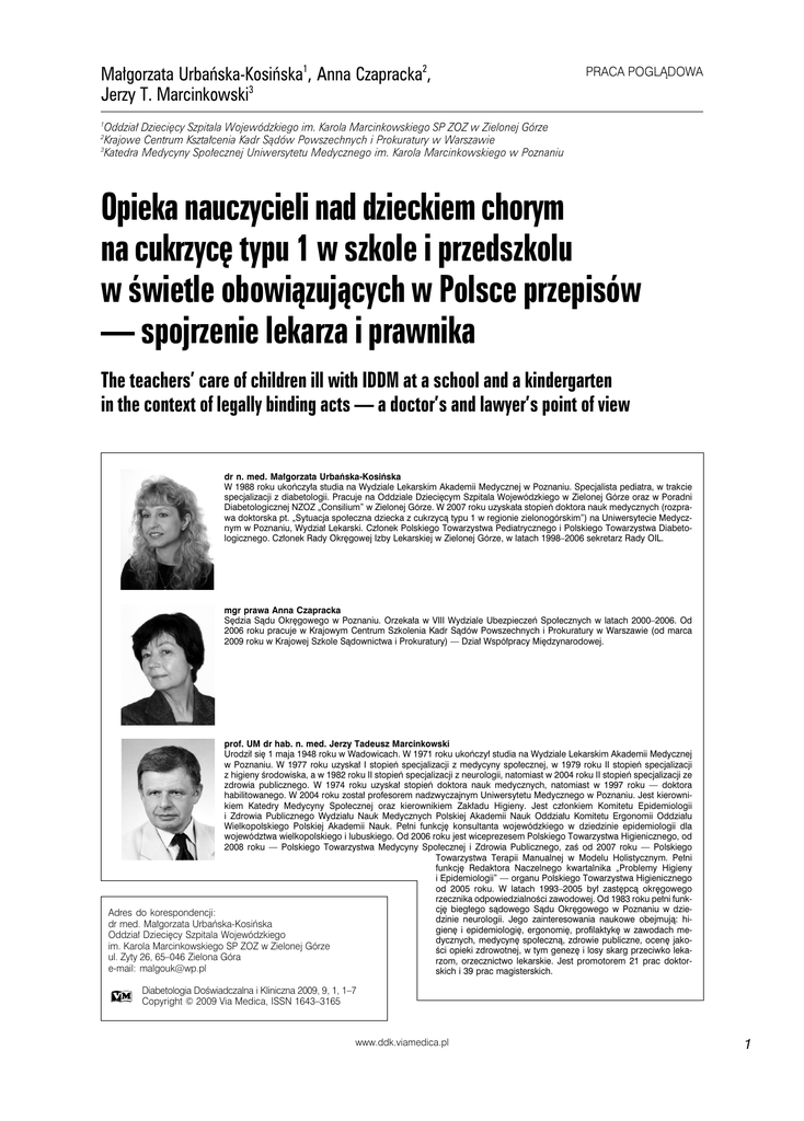 Małgorzata Urbańska-Kosińska1, Anna Czapracka2, Jerzy T. Marcinkowski3 PRACA POGLĄDOWA 1 Oddział Dziecięcy Szpitala Wojewódzkiego im. Karola Marcinkowskiego SP ZOZ w Zielonej Górze Krajowe Centrum Kształcenia Kadr Sądów Powszechnych i Prokuratury w Warszawie 3 Katedra Medycyny Społecznej Uniwersytetu Medycznego im. Karola Marcinkowskiego w Poznaniu 2 Opieka nauczycieli nad dzieckiem chorym na cukrzycę typu 1 w szkole i przedszkolu w świetle obowiązujących w Polsce przepisów — spojrzenie lekarza i prawnika The teachers’ care of children ill with IDDM at a school and a kindergarten in the context of legally binding acts — a doctor’s and lawyer’s point of view dr n. med. Małgorzata Urbańska-Kosińska W 1988 roku ukończyła studia na Wydziale Lekarskim Akademii Medycznej w Poznaniu. Specjalista pediatra, w trakcie specjalizacji z diabetologii. Pracuje na Oddziale Dziecięcym Szpitala Wojewódzkiego w Zielonej Górze oraz w Poradni Diabetologicznej NZOZ „Consilium” w Zielonej Górze. W 2007 roku uzyskała stopień doktora nauk medycznych (rozprawa doktorska pt. „Sytuacja społeczna dziecka z cukrzycą typu 1 w regionie zielonogórskim”) na Uniwersytecie Medycznym w Poznaniu, Wydział Lekarski. Członek Polskiego Towarzystwa Pediatrycznego i Polskiego Towarzystwa Diabetologicznego. Członek Rady Okręgowej Izby Lekarskiej w Zielonej Górze, w latach 1998–2006 sekretarz Rady OIL. mgr prawa Anna Czapracka Sędzia Sądu Okręgowego w Poznaniu. Orzekała w VIII Wydziale Ubezpieczeń Społecznych w latach 2000–2006. Od 2006 roku pracuje w Krajowym Centrum Szkolenia Kadr Sądów Powszechnych i Prokuratury w Warszawie (od marca 2009 roku w Krajowej Szkole Sądownictwa i Prokuratury) — Dział Współpracy Międzynarodowej. prof. UM dr hab. n. med. Jerzy Tadeusz Marcinkowski Urodził się 1 maja 1948 roku w Wadowicach. W 1971 roku ukończył studia na Wydziale Lekarskim Akademii Medycznej w Poznaniu. W 1977 roku uzyskał I stopień specjalizacji z medycyny społecznej, w 1979 roku II stopień specjalizacji z higieny środowiska, a w 1982 roku II stopień specjalizacji z neurologii, natomiast w 2004 roku II stopień specjalizacji ze zdrowia publicznego. W 1974 roku uzyskał stopień doktora nauk medycznych, natomiast w 1997 roku — doktora habilitowanego. W 2004 roku został profesorem nadzwyczajnym Uniwersytetu Medycznego w Poznaniu. Jest kierownikiem Katedry Medycyny Społecznej oraz kierownikiem Zakładu Higieny. Jest członkiem Komitetu Epidemiologii i Zdrowia Publicznego Wydziału Nauk Medycznych Polskiej Akademii Nauk Oddziału Komitetu Ergonomii Oddziału Wielkopolskiego Polskiej Akademii Nauk. Pełni funkcję konsultanta wojewódzkiego w dziedzinie epidemiologii dla województwa wielkopolskiego i lubuskiego. Od 2006 roku jest wiceprezesem Polskiego Towarzystwa Higienicznego, od 2008 roku — Polskiego Towarzystwa Medycyny Społecznej i Zdrowia Publicznego, zaś od 2007 roku — Polskiego Towarzystwa Terapii Manualnej w Modelu Holistycznym. Pełni funkcję Redaktora Naczelnego kwartalnika „Problemy Higieny i Epidemiologii” — organu Polskiego Towarzystwa Higienicznego od 2005 roku. W latach 1993–2005 był zastępcą okręgowego rzecznika odpowiedzialności zawodowej. Od 1983 roku pełni funkcję biegłego sądowego Sądu Okręgowego w Poznaniu w dzieAdres do korespondencji: dzinie neurologii. Jego zainteresowania naukowe obejmują: hidr med. Małgorzata Urbańska-Kosińska gienę i epidemiologię, ergonomię, profilaktykę w zawodach meOddział Dziecięcy Szpitala Wojewódzkiego dycznych, medycynę społeczną, zdrowie publiczne, ocenę jakoim. Karola Marcinkowskiego SP ZOZ w Zielonej Górze ści opieki zdrowotnej, w tym genezę i losy skarg przeciwko lekaul. Zyty 26, 65–046 Zielona Góra rzom, orzecznictwo lekarskie. Jest promotorem 21 prac doktore-mail: [email protected] skich i 39 prac magisterskich. Diabetologia Doświadczalna i Kliniczna 2009, 9, 1, 1–7 Copyright © 2009 Via Medica, ISSN 1643–3165 www.ddk.viamedica.pl 1 Diabetologia Doświadczalna i Kliniczna 2009, Vol. 9, No. 1 Abstract Taking care of children with IDDM at school and kindergarten in Poland makes some problems. A caregiver’s knowledge about diabetes is necessary to provide them with a proper care. Moreover, there is a need of performing medical interventions. Parents and doctors expect co-operation of teachers. The range of care depends on teacher’s approach, and may be different, mainly because of unclear questions in legal acts. The aim of the study was to analysis of legally binding acts connected with taking care of children ill with IDDM in educational institutions and indication of the range of teachers’ duties that result from those regulations. General duty of providing care by teachers of all pupils results mainly from acts like: System of Education Act and Act “Teacher’s Card” but these regulations don’t indicate any concrete duties of teacher connected with “care”. Wstęp W Polsce jest około 16 000 dzieci poniżej 18. roku życia z cukrzycą typu 1, a w ciągu ostatnich lat obserwuje się tendencję wzrostową wskaźnika chorobowości [1]. Narastają zatem problemy związane z opieką nad tymi dziećmi w szkole i przedszkolu, gdyż dziecko z cukrzycą typu 1 wymaga szczególnej, dodatkowej opieki. Z jednej strony wiąże się ona z koniecznością codziennego, wielokrotnego wykonywania wielu zabiegów medycznych, takich jak pobranie krwi w celu oznaczenia glikemii, interpretacja tego wyniku, ustalenie dawki insuliny i jej podanie w iniekcji czy wreszcie wykonanie zastrzyku glukagonu w sytuacji ciężkiego niedocukrzenia. Z drugiej strony dziecko z cukrzycą typu 1 wymaga pewnych dodatkowych działań opiekuńczych, takich jak dopilnowanie, czy zjadło posiłek w odpowiedniej ilości i czy jakość tego posiłku jest właściwa, zwrócenie uwagi na aktywność fizyczną dziecka oraz odniesienie jej do poziomu glikemii i spożywanego posił