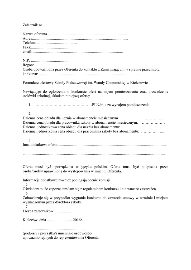 Załącznik nr 1 Nazwa oferenta................................................................................... Adres.................................................................................................... Telefon: .......................................... Faks:......................................... email: ............................................................................................. . NIP: .......................................... Regon:............................................ Osoba upoważniona przez Oferenta do kontaktu z Zamawiającym w sprawie przedmiotu konkursu: ........................................................................................................ Formularz ofertowy Szkoły Podstawowej im. Wandy Chotomskiej w Kiełczowie Nawiązując do ogłoszenia o konkursie ofert na najem pomieszczenia oraz prowadzenie stołówki szkolnej, składam niniejszą ofertę: 1. ………………………………………PLN/m-c za wynajem pomieszczenia. 2. Dzienna cena obiadu dla ucznia w abonamencie miesięcznym Dzienna cena obiadu dla pracownika szkoły w abonamencie miesięcznym: Dzienna, jednostkowa cena obiadu dla ucznia bez abonamentu: Dzienna, jednostkowa cena obiadu dla pracownika szkoły bez abonamentu: …………….. ……………… ……..……….. …………..….. 3. Inna dodatkowa oferta................................................................................................................. ..................................................................................................................................................... .................................................................................................................................................... Oferta musi być sporządzona w języku polskim. Oferta musi być podpisana przez osobę/osoby/ uprawnioną do występowania w imieniu Oferenta. 4. Informacje dodatkowe również podlegają ocenie komisji. 5. Oświadczam, że zapoznałem/łam się z regulaminem konkursu i nie wnoszę zastrzeżeń. 6. Zobowiązuję się w przypadku wygrania konkursu do zawarcia umowy w terminie i miejscu wyznaczonym przez dyrektora szkoły. 7. Liczba załączników:................................. Kiełczów, dnia ...........................2016r. .................................................................. (podpis/y i pieczątka/i imienna/e osoby/osób upoważnionej/nych do reprezentowania Oferenta