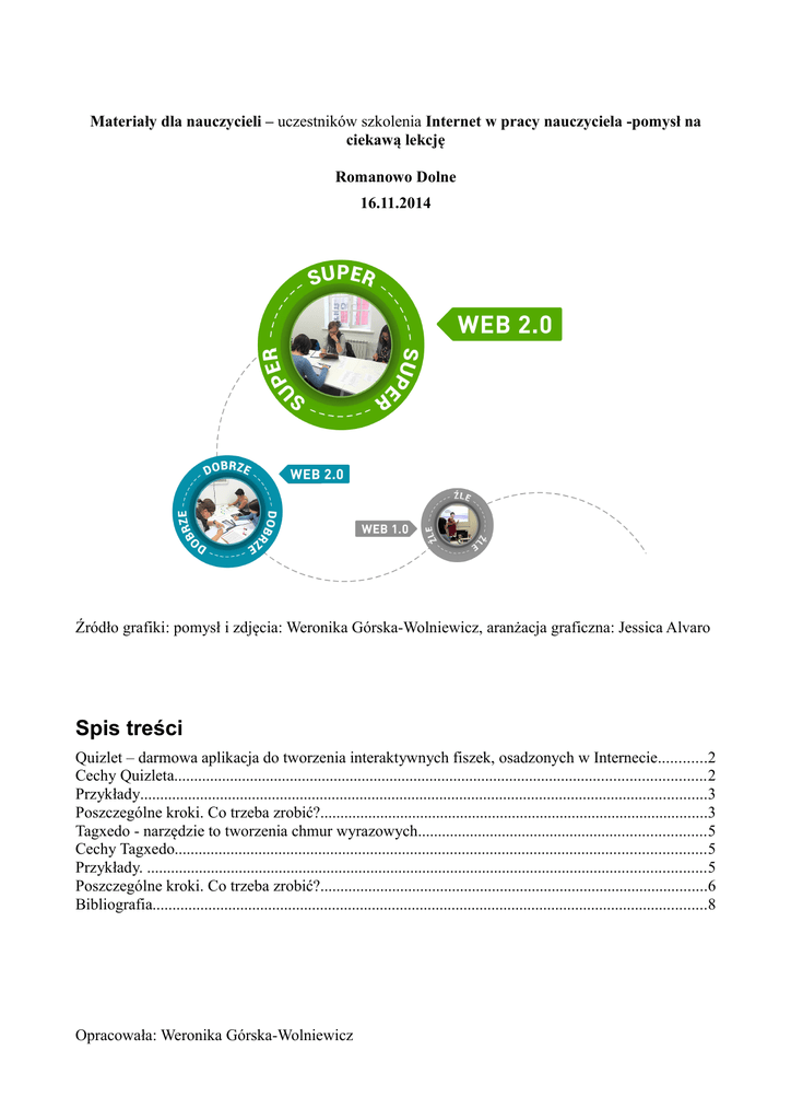 Materiały dla nauczycieli – uczestników szkolenia Internet w pracy nauczyciela -pomysł na ciekawą lekcję Romanowo Dolne 16.11.2014 Źródło grafiki: pomysł i zdjęcia: Weronika Górska-Wolniewicz, aranżacja graficzna: Jessica Alvaro Spis treści Quizlet – darmowa aplikacja do tworzenia interaktywnych fiszek, osadzonych w Internecie............2 Cechy Quizleta.....................................................................................................................................2 Przykłady..............................................................................................................................................3 Poszczególne kroki. Co trzeba zrobić?.................................................................................................3 Tagxedo - narzędzie to tworzenia chmur wyrazowych........................................................................5 Cechy Tagxedo.....................................................................................................................................5 Przykłady. ............................................................................................................................................5 Poszczególne kroki. Co trzeba zrobić?.................................................................................................6 Bibliografia...........................................................................................................................................8 Opracowała: Weronika Górska-Wolniewicz Quizlet – darmowa aplikacja do tworzenia interaktywnych fiszek, osadzonych w Internecie Dzięki tradycyjnym fiszkom można uczyć się słówek, przekładając je z kieszeni do kieszeni. Quizlet daje nam o wiele większe możliwości, omówione poniżej. Portal ten posiada pewne cechy społecznościowe. Pozwala on na tworzenie zbioru fiszek i dzielenie się nimi z wszystkimi użytkownikami Internetu. Dzięki możliwości kopiowania cudzych fiszek i ich edycji możemy też oszczędzić dużo czasu. Prosty interfejs pozwoli na szybkie zapoznanie uczniów z aplikacją. Dzięki temu będą oni mogli tworzyć własne zbiory fiszek, nawet podczas zajęć. Film wyjaśniający funkcje Quizleta w języku angielskim znajduje się na stronie https://www.youtube.com/watch?v=Ewa15i0OEIw&noredirect=1 Po jego obejrzeniu uczniowie będą wiedzieli, na czym polega działanie tej aplikacji. Cechy Quizleta prosty w obsłudze oferuje trzy różne sposoby nauki (tradycyjne fiszki - Flashcards, wpisywanie definicji Learn, pisanie definicji ze słuchu - Speller) ma wbudowane cztery typy testów (wpisywanie definicji - Written, dopasowywanie definicji do słowa - Matching, test wielokrotnego wyboru – Multiple choice oraz prawda/fałsz - True/False ) Warto pamiętać, że testy są generowane automatycznie i można określić liczbę słówek z danego zbioru, które chcemy przetestować. Tworzymy tym samym w bardzo szybki sposób wiele zupełnie różnych zestawów. Cztery różne rodzaje testów pozwalają bez nakładu dodatkowej pracy przygotować wiele wersji, nawet dla każdego z uczniów z osobna. ma wbudowane dwie gry, dzięki którym łatwiej zapamiętuje się treści z danego zbioru. Uczeń może rywalizować o najlepszy czas w obu grach z kolegami z klasy, z innymi użytkownikami Quizleta, lub próbować pobić swój własny rekord. Opracowała: Weronika Górska-Wolniewicz • • Scatter – nasuwając termin na odpowiednią definicję spowodujemy ich zniknięcie. Space Race – trzeba obserwując termin przesuwający się poziomo po ekranie wpisać prawidłową definicję, zanim dotrze on do końca ekranu. Przy tworzeniu zbioru fiszek warto pamiętać, że zbyt długie definicje mogą utrudnić, a nawet uniemożliwić grę. ma wbudowany syntezator głosu w różnych językach umożliwia tworzenie zbiorów fiszek ze zdjęciami umożliwia tworzenie grup oraz wymianę zbiorów fiszek (ang. set) w grupie istnieje aplikacja na urządzenia mobilne. Możliwości jej są ograniczone w porównaniu z wersją dla przeglądarek internetowych. Pozwala jednak na indywidualną pracę uczniów z danym zbiorem fiszek. Ma także wbudowaną grę typu Memory. Przykłady Wyszukiwarka zbiorów fiszek, podzielonych na kategorie - http://quizlet.com/browse-sets Przykładowe zbiory fiszek na temat Pisma Św. - http://quizlet.com/subject/bible/ Przykładowe zbiory fiszek z geometrii - http://quizlet.com/subject/geometry/ Przykładowy zbiór fiszek z przyrody - http://quizlet.com/52280063/nasze-ptaki-flash-cards/ Przykładowy zbiór fiszek z malarstwa - http://quizlet.com/52283750/malarstwo-flash-cards/ Przykładowy zbiór fiszek z medycyny - http://quizlet.com/44618169/miesnie-ramieniaflash-cards/ Przykładowy zbiór fiszek z biologii - http://quizlet.com/17318636/fotosyntezaoddychanieflash-cards/ Strona ze zbiorami fiszek z języka hiszpańskiego,. Zostały stworzone przez uczniów Akademii językowej EMPIK w latach 2008-2010 i sprawdzone przez nauczyciela http://repasos.wikispaces.com/home Pomysły na zastosowanie aplikacji Quizlet w praktyce szkolnej, wypracowane na warsztatach wraz z nauczycielami - http://mind42.com/mindmap/cd1ee1fe-5f67-4fe6-a27cce10349a2acc Poszczególne kroki. Co trzeba zrobić? 1. Wejść na stronę www.quizlet.com 2. Zarejestrować się (zapisać nazwę użytkownika i hasło). Dla osób posiadających konto na portalu Facebook istnieje możliwość zalogowania się poprzez Facebooka. 3. Stworzyć twój pierwszy zbiór fiszek (Create a Set). Opracowała: Weronika Górska-Wolniewicz Ważne uwagi przy tworzeniu fiszek: Dobrą praktyką jest pamiętanie o wpisaniu poza tytułem zbioru (Set title) także krótkiego opisu (Description). Poniżej tych pól decydujemy dla kogo nasze fiszki mają być widoczne (Visible to) oraz kto je może edytować (Editors). Nie trzeba tworzyć od nowa całego zbioru, można wykorzystać coś, co już ktoś inny stworzył. W tym celu wykorzy