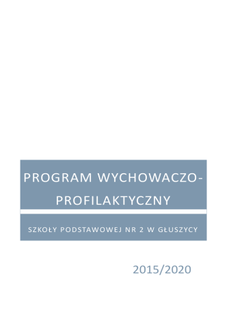 PROGRAM WYCHOWACZOPROFILAKTYCZNY SZ KOŁ Y PO D STAWOWE J N R 2 W GŁ U SZ YC Y 2015/2020 SPIS TREŚCI Spis tresci Wstęp __________________________________________________________________________________________________________ 1 Podstawy prawne programu wychowawczo- profilaktycznego _____________________________________________ 3 Misja szkoły i sylwetka absolwenta __________________________________________________________________________ 4 Zadania nauczycieli, wspołpraca rodzicow i srodowiska lokalnego ze szkołą _____________________________ 5 Cel strategiczny i cele szczegołowe___________________________________________________________________________ 9 Wartosci i ich realizacja w procesie wychowawczym ______________________________________________________ 13 Diagnoza potrzeb i zasobow oraz analiza wynikow diagnozy _____________________________________________ 15 Priorytety ____________________________________________________________________________________________________ 16 Powinnosci wychowawcze będące wymiarem pracy edukacyjnej kazdego nauczyciela __________________ 26 Powinnosci wychowawcow klasy ___________________________________________________________________________ 28 Zadania wychowawcze dla uczniow poszczegolnych klas__________________________________________________ 30 WSTĘP Wstęp Program wychowawczo-profilaktyczny Szkoły Podstawowej nr 2 w Głuszycy uwzględnia potrzeby rozwojowe uczniow oraz potrzeby wynikające ze specyfiki srodowiska szkoły. Nauczyciele powinni dązyc do wszechstronnego rozwoju ucznia jako nadrzędnego celu pracy edukacyjnej. Edukacja szkolna polega na harmonijnej realizacji przez nauczycieli zadan w zakresie nauczania, kształcenia umiejętnosci i wychowania. Profilaktyka jest procesem wspierania zdrowia i poczucia własnej wartosci oraz przeciwdziałania czynnikom destrukcyjnym. Zadania te tworzą wzajemnie uzupełniające się i rownowazne wymiary pracy kazdego nauczyciela. Nauczyciel w swojej pracy wychowawczej i profilaktycznej, wspierając w tym zakresie obowiązki rodzicow, powinni zmierzac do tego aby uczniowie w szczegolnosci: znajdowali w szkole srodowisko wszechstronnego rozwoju osobowego w kazdym wymiarze: intelektualnym, psychicznym, społecznym, zdrowotnym, estetycznym, moralnym i duchowym, rozwijali w sobie dociekliwosc poznawczą, ktora ukierunkowana jest na poszukiwanie prawdy, dobra i piękna, mieli swiadomosc zyciowej uzytecznosci zarowno poszczegolnych przedmiotow szkolnych, jak i całej edukacji na całym etapie, stawali się coraz bardziej samodzielni w dązeniu do dobra jego wymiarze indywidualnym i społecznym, godząc umiejętnie dązenie do dobra własnego z dobrem innych, odpowiedzialnosc za siebie i odpowiedzialnosc za innych, wolnosc własną z wolnoscią innych, poszukiwali, odkrywali i dązyli na drodze rzetelnej pracy do osiągnięcia wielkich celow zyciowych i wartosci waznych dla odnalezienia własnego miejsca w swiecie, Strona 1 WSTĘP uczyli się szacunku dla dobra wspolnego jako podstawy zycia społecznego oraz przygotowywali się do zycia w rodzinie, w społecznosci lokalnej i w panstwie w duchu przekazu dziedzictwa kulturowego i kształtowania postaw patriotycznych, przygotowywali się so rozpoznawania wartosci moralnych, dokonywania wyborow i hierarchizacji wartosci oraz mieli mozliwosc doskonalenia się kształtowali w sobie postawę dialogu, umiejętnosc słuchania innych i rozumienia ich poglądow, umieli wspołdziałac i wspołtworzyc w szkole wspolnotę nauczycieli i uczniow Zadanie realizacji programu, po zaopiniowaniu przez Radę Pedagogiczną i Radę Rodzicow, spoczywa na wszystkich nauczycielach, przy wspołpracy ze specjalistami z Poradni Psychologiczno-Pedagogicznej i instytucji działających na rzecz dzieci i rodziny. Programem wychowawczo-profilaktycznym została objęta cała społecznosc uczniowska, tj. uczniowie, nauczyciele oraz rodzice. Strona 2 PODSTAWY PRAWNE PROGRAMU WYCHOWAWCZO- PROFILAKTYCZNEGO Podstawy prawne programu wychowawczo- profilaktycznego PODSTAWY PRAWNE: Konstytucja Rzeczpospolitej Polskiej, Rozporządzenie Ministra Edukacji Narodowej i Sportu z dnia 5 lutego 2004 r. w sprawie dopuszczenia do uzytku szkolnego programow wychowania przedszkolnego, programow nauczania i podręcznikow oraz ich cofania, Ustaw o systemie oswiaty z dnia 7 z 1991 z pozniejszymi zmianami, Rozporządzenie Ministra Edukacji Narodowej z dnia 23.12.2008 w sprawie podstawy programowej wychowania przedszkolnego oraz kształcenia ogolnego w poszczegolnych typach szkoł (Dzienniku Ustaw Nr 4, poz. 17 z dnia 15 stycznia 2009 r.), Powszechna Deklaracja Praw Człowieka, Konwencja o Prawach Dziecka, Ustawa z dnia 9 listopada 1995 r. o ochronie zdrowia przed następstwami uzywania tytoniu i wyrobow Tytoniowych (Dz. U. 1996 nr 10 poz.55 ,z pozn. zm.), Strona 3 Statut Szkoły, Rządowy program na lata 2015- 2018 „Bezpieczna +”, Narodowy Program Profilaktyki i Rozwiązywania Problemow Alkoholowych, Krajowy Program Przeciwdziałania Przemocy w Rodzinie 2006-2016. MISJA SZKOŁY I SYLWETKA ABSOLWENTA Misja szkoły i sylwetka absolwenta MISJA SZKOŁY: „Moja szkoła- moj drugi dom” SYLWETKA ABSOLWENTA Absolwent szkoły: Strona 4 zna swoje mocne i słabe strony, potrafi nad nimi pracowac, potrafi dokonywac własciwych, społecznie akceptowanych wyborow, jest odpowiedzialny za podjęte decyzje i wybory, umie porozumiewac się z innymi, szanuje dziedzictwo kulturowe, zna i stosuje normy dobrego zachowania, dba o swoje zdrowie i otoczenie, odroznia dobro od zła w oparciu o uniwersalne wartosci, jest przygotowany do następnego etapu nauki. ZADANIA NAUCZYCIELI, WSPÓŁPRACA RODZICÓW I ŚRODOWISKA LOKALNEGO ZE SZKOŁĄ Zadania nauczycieli, wspołpraca rodzicow i srodowiska lokalnego ze szkołą ZADANIA NAUCZYCIELA WYCHOWUJĄCEGO: Niewątpliwie istotny wpływ na proces rozwoju, wychowania i socjalizacji ma szkoła, ktora stanowi nie tylko zrodło wiedzy naukowej, ale rowniez daje mozliwosc nabycia umiejętnosc