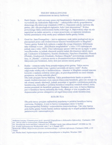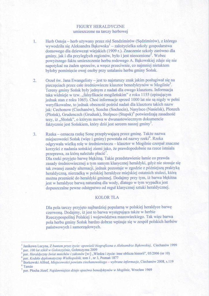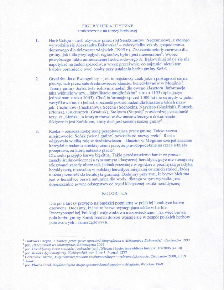 FIGURY }TERALDYCZNE umieszczonena tarczy helbowęj 1. (sedfimiró\^).7klóręgo przel ród Send7imiró\Ą Herb ostoja- herbuŻ}.\łan) _ 7a]oż1cieILa uf \,\odfiIa Bąko\^ska' szkolygo.podarstrła sięAleksandra domowegodla dziewcząt wiejskich ( 1909 I .). znaczę e sfkoł! zarówno dla gminy' jak i dla przylegĘch regionów, byłoi jęst nieocenione'. wobec powyższegofaktu umieszczenieherburodowegoA. Bąkowskiej zdaje się nię napotykaćna żadensprzeciw' a wręcz plzeciwnie, co najmnie.inietaktem byłobypominięcie owej osoby przy ustalaniuherbu gminy Sońsk. 2. orzeł św.Jana Ewangęlisty _jest to najstarszyznak jakim posfugiwałsię.na pieczęciachprzez całeśredniowiecze klasztor benedyktynóww Mogilnie.. jednym z nadandla owegoklasforu. lnformacja Terenygminy Sońskbyły takawidnięjęw tzw. ',falsyfikaciemogileńskim''z rcku l 155(opisującym jednakstanz roku 1065).Choćinformacjesprz€ d 1000lat nie sąnigdyw pełni pośIódnadańdla klasztolu 1akichnazw werydkowahe, to jednak obecność jak: Cechonow(Ciechanów),Scecbn(Sochocin),Nasylsco(NasielsĘ.Plonzch (Płońsk),Grudenczch(Cnudusk),Stolpsco (stupsk)" potwierdzajązasadność tęzy. iż ',słońsk,,,o którym mowa w dwunastowiecznymdokumencie je5|SońsLiem. sercemnas/ejgminy'' któq dziśjesl raktycznie l. Rzeka ozlaczarzęl(ę sonę pźępb'wającąpftez gminę.Takie nazwa miejscowościSońsk (więc i gnriny) powstałaod nazwy rzekio.Rzeka _ klasztor w Mogihie czelpałznaczne odgr}.wała wielką rolę w średniowieczu korzyściz nadaniasońskiej ziemi jako. ze prawdopodobniena żece istniała płacić,' pŹeprawa, za któIą na]'eż'aŁo Dla żeki przyjętobarwębłękitną.Takie prz€dstawienie łamieco prawda zasadyśredńowiecznęja tym sanym klasycznej helaldyki, gdyżnie stosujesię tak z\ł'anejZasadyalternacji'jednak pozoslajew zgodzie z późniejsząpralaykq heraldyczną,nierzadkąw polskiej heraldycemiejskiej ostatnichstuleci, którą do heraldyki grninnej.Dodajmy pŹy rym, iż barwabłękitna możraprzenieść jęst w heraldycebarwąnatuTalnądla wody. dlatęgow tym w}padkujest dopuszczalneperłneodstępstwood ręgułklasycznej sztuki heraldycznej. KoLoR TŁA Dla pola tarczy Fzyjęto najbardziejpopulamąw polskiej heraldycebarwę takzew herbie czerwoną.Dodajmy,iżjestto balwawystępująca RzęczypospolitejPolskiej i województwa mazowieckiego.Tak więc barwa pola herbu gminy Sońsk bardzo dobrze wpisuje się w zespółpolskich herbów panstwowychi samolządowych' l Janikowa Luc},na,Z ó'n |en p|ze2 biagralczna o Aleksa (rlzeBqkołlskiej, Ciecharlów 1999 łcie: opo||ieść 2 po|. 100 la! szkół y, Gołotczyźnie'Cołorczyzna2ijg 3 ior. HefuIdycznyświatnnichó1|,i zako oy, [w:] ',wiedfa i życie:inne ob]icza historii''' 05/2006(nr l0) a poL ^adeL\dyp|Undl)c:nyWi"llopo|sĄi'rc,n | ' ff .]. Poziai |877 . BorkowskiA |]ied'Mlglscowaści . wbrane fuhtnacje,ciechanów2008,s.1]9 poi\ulu ciechan.Ąrskie4o 6 Tamfe 1 po|' P1ochaJózef' NajdMniejsze dzieje opac|1łabeneąktrnói) w Mogilnie, wrocław |969