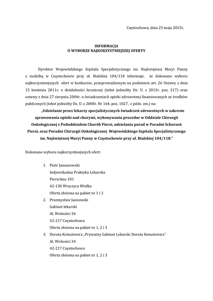 Częstochowa, dnia 25 maja 2015r. INFORMACJA O WYBORZE NAJKORZYSTNIEJSZEJ OFERTY Dyrektor Wojewódzkiego Szpitala Specjalistycznego im. Najświętszej Maryi Panny z siedzibą w Częstochowie przy ul. Bialskiej 104/118 informuje, że dokonano wyboru najkorzystniejszych ofert w konkursie, przeprowadzonym na podstawie art. 26 Ustawy z dnia 15 kwietnia 2011r. o działalności leczniczej (tekst jednolity Dz. U. z 2013r. poz. 217) oraz ustawy z dnia 27 sierpnia 2004r. o świadczeniach opieki zdrowotnej finansowanych ze środków publicznych (tekst jednolity Dz. U. z 2008r. Nr 164, poz. 1027, z późn. zm.) na: „Udzielanie przez lekarzy specjalistycznych świadczeń zdrowotnych w zakresie sprawowania opieki nad chorymi, wykonywania procedur w Oddziale Chirurgii Onkologicznej z Pododdziałem Chorób Piersi, udzielania porad w Poradni Schorzeń Piersi, oraz Poradni Chirurgii Onkologicznej Wojewódzkiego Szpitala Specjalistycznego im. Najświętszej Maryi Panny w Częstochowie przy ul. Bialskiej 104/118.” Dokonano wyboru najkorzystniejszych ofert: 1. Piotr Januszewski Indywidualna Praktyka Lekarska Pierzchno 101 42-130 Wręczyca Wielka Oferta złożona na pakiet nr 1 i 2 2. Przemysław Jasnowski Gabinet lekarski Al. Wolności 34 42-217 Częstochowa Oferta złożona na pakiet nr 1, 2 i 3 3. Dorota Kotusiewicz „Prywatny Gabinet Lekarski Dorota Kotusiewicz” Al. Wolności 34 42-217 Częstochowa Oferta złożona na pakiet nr 1, 2 i 3 4. Specjalistyczna Praktyka Lekarska Chirurgia Ogólna Karolina Donocik ul. Storczyków 16 42-400 Zawiercie Oferta złożona na pakiet nr 1 5. Indywidualna Praktyka Lekarska lek. med. Małgorzata Bigosz-Kubica ul. Krynicka 1/3 42-221 Częstochowa Oferta złożona na pakiet nr 1 i 2 6. Paweł Pius Gabinet Lekarski ul. Obrońców Poczty Gdańskiej 3 42-218 Częstochowa Oferta złożona na pakiet nr 1 i 2 7. Indywidualna Specjalistyczna Praktyka Lekarska „Gabinet Chirurgii Onkologicznej” Grzegorz Celban ul. Kilińskiego 21 42-202 Częstochowa Oferta złożona na pakiet nr 1, 2 i 3 Uzasadnienie wyboru: Oferty spełniają wszystkie warunki zawarte w Regulaminie Konkursu Ofert i zawierają najniższe zaoferowane stawki procentowe (Pakiet nr 1) oraz najniższą zaoferowana cenę (Pakiet nr 2 i 3). Udzielający zamówienia dokonał wyboru wszystkich ważnych ofert złożonych w postępowaniu, dla zapewnienia wykonania całości zamówienia, zgodnie z poniższym zestawieniem ofert. W postępowaniu zostało złożonych siedem ofert. Nie została odrzucona żadna oferta. Ogłoszenie zostało zamieszczone na stronie internetowej www.szpitalparkitka.com.pl oraz na tablicy ogłoszeń szpitala. ZESTAWIENIE OFERT Lp. Pakiet nr 1 Oddział Chirurgii Onkologicznej z Pododdziałem Chorób Piersi Nazwa podmiotu (Oferent) Ilość godzin tygodniowo 1. Indywidualna Praktyka Lekarska Piotr Januszewski Pierzchno 101 42-130 Wręczyca Wielka 23 godz. 2. Gabinet Lekarski lek. med. Przemysław Jasnowski Al. Wolności 34 42-217 Częstochowa 23 godz. 3. Dorota Kotusiewicz „Prywatny Gabinet Lekarski Dorota Kotusiewicz” Al. Wolności 34 42-217 Częstochowa 23 godz. 4. Specjalistyczna Praktyka Lekarska Chirurgia Ogólna Karolina Donocik ul. Storczyków 16 42-400 Zawiercie 2 godz. 5. Indywidualna Praktyka Lekarska lek. med. Małgorzata Bigosz-Kubica ul. Krynicka 1/3 42-221 Częstochowa 23 godz. 6. Paweł Pius Gabinet Lekarski ul. Obrońców Poczty Gdańskiej 3 42-218 Częstochowa 21 godz. 7. Indywidualna Specjalistyczna Praktyka Lekarska „Gabinet Chirurgii Onkologicznej” Grzegorz Celban ul. Kilińskiego 21 42-202 Częstochowa 31 godz. Razem Chir. Onkolog.79 godz. Chir. Ogólni 67 godz. Stawki % wynagrodzenia 1. 20% 2. 14% 3. 14% 4. 6% 5. 3% 1. 20% 2. 14% 3. 14% 4. 6% 5. 3% 1. 20% 2. 14% 3. 14% 4. 6% 5. 3% 1. 20% 2. 14% 3. 14% 4. 6% 5. 3% 1. 20% 2. 14% 3. 14% 4. 6% 5. 3% 1. 20% 2. 14% 3. 14% 4. 6% 5. 3% 1. 20% 2. 14% 3. 14% 4. 6% 5. 3% Pakiet nr 2 Poradnia Schorzeń Piersi Pakiet nr 3 Poradnia Chirurgii Onkologicznej Ilość godzin tygodniowo 7 godz. Cena brutto za punkt 3,00 zł Ilość godzin tygodniowo Nie złożono Cena brutto za punkt Nie złożono 4,5 godz. 3,00 zł 3 godz. 3,50 zł 5,5 godz. 3,00 zł 2 godz. 3,50 zł Nie złożono Nie złożono Nie złożono Nie złożono 7 godz. 3,00 zł Nie złożono Nie złożono 3 godz. 3,00 zł Nie złożono Nie złożono 5 godz. 3,00 zł 2 godz. 3,50 zł 32 godz. 7 godz.