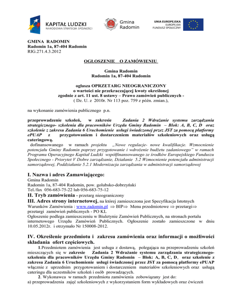 GMINA RADOMIN Radomin 1a, 87-404 Radomin RIG.271.4.3.2012 OGŁOSZENIE O ZAMÓWIENIU Gmina Radomin Radomin 1a, 87-404 Radomin ogłasza OPRZETARG NIEOGRANICZONY o wartości nie przekraczającej kwoty określonej zgodnie z art. 11 ust. 8 ustawy – Prawo zamówień publicznych ( Dz. U. z 2010r. Nr 113 poz. 759 z późn. zmian.), na wykonanie zamówienia publicznego p.n. przeprowadzenie szkoleń, w zakresie Zadania 2 Wdrażanie systemu zarządzania strategicznego- szkolenia dla pracowników Urzędu Gminy Radomin – Blok: A, B, C, D oraz szkolenie z zakresu Zadania 6 Uruchomienie usługi świadczonej przez JST za pomocą platformy ePUAP z przygotowaniem i dostarczeniem materiałów szkoleniowych oraz usługą cateringową. dofinansowanego w ramach projektu „Nowe regulacje- nowe kwalifikacje. Wzmocnienie potencjału Gminy Radomin poprzez przygotowanie i wdrożenie budżetu zadaniowego” w ramach Programu Operacyjnego Kapitał Ludzki współfinansowanego ze środków Europejskiego Funduszu Społecznego - Priorytet V Dobre zarządzanie, Działanie 5.2 Wzmocnienie potencjału administracji samorządowej, Poddziałanie 5.2.1 Modernizacja zarządzania w administracji samorządowej I. Nazwa i adres Zamawiającego: Gmina Radomin Radomin 1a, 87-404 Radomin, pow. golubsko-dobrzyński Tel./fax 056-683-75-22 lub 056-683-75-12 II. Tryb zamówienia - przetarg nieograniczony III. Adres strony internetowej, na której zamieszczona jest Specyfikacja Istotnych Warunków Zamówienia : www.radomin.pl ⇒ BIP⇒ Menu przedmiotowe ⇒ przetargi⇒ przetargi zamówień publicznych - PO KL Ogłoszenie podlega zamieszczeniu w Biuletynie Zamówień Publicznych, na stronach portalu internetowego Urzędu Zamówień Publicznych. Ogłoszenie zostało zamieszczone w dniu 10.05.2012r. i otrzymało Nr 150008-2012. IV. Określenie przedmiotu i zakresu zamówienia oraz informacji o możliwości składania ofert częściowych. 1.Przedmiotem zamówienia jest usługa z dostawą, polegająca na przeprowadzeniu szkoleń mieszczących się w zakresie Zadania 2 Wdrażanie systemu zarządzania strategicznegoszkolenia dla pracowników Urzędu Gminy Radomin – Blok: A, B, C, D, oraz szkolenie z zakresu Zadania 6 Uruchomienie usługi świadczonej przez JST za pomocą platformy ePUAP włącznie z uprzednim przygotowaniem i dostarczeniem materiałów szkoleniowych oraz usługą cateringu dla uczestników szkoleń i osób prowadzących. 2. Wykonawca w ramach przedmiotu zamówienia zobowiązany jest do: a) przeprowadzenia zajęć szkoleniowych z wykorzystaniem form wykładowych oraz ćwiczeń praktycznych, z użyciem odpowiednich materiałów zgodnych z tematyką szkolenia; b) przygotowania po 1 egzemplarzu materiałów szkoleniowych dla każdego uczestnika danego szkolenia i dostarczenie biorącym udział, co najmniej na 7 dni przed terminem każdego szkolenia. c) Zapewnienia kadry o odpowiednim wykształceniu i doświadczeniu w prowadzeniu szkoleń; d) Zapewnienia ciągłości prowadzenia szkoleń w terminach wskazanych przez Zamawiającego; e) Zapewnienia zastępstwa w przypadkach kiedy wybrany trener/szkoleniowiec nie może z przyczyn obiektywnych poprowadzić szkolenia; f) Wyznaczenia osoby do kontaktu z Zamawiającym, odpowiedzialnej za dbałość o wysoką jakość zajęć i upoważnionej do podejmowania wiążących decyzji w kwestiach związanych z realizowanymi szkoleniami; g) Przygotowania i prowadzenia dokumentacji ze szkoleń, w tym list obecności, dzienników szkoleń, ankiet audytoryjnych po zakończeniu szkolenia ( w każdym dniu ), sprawozdań z przeprowadzonych szkoleń; h) Szkolenia będą odbywały się zgodnie z Harmonogramem szkoleń ustalonym przez Zamawiającego; i) wydania zaświadczeń o ukończeniu szkoleń wszystkim uczestnikom, na druku z umieszczonymi oznaczeniami: logo Unii Europejskiej i Programu Operacyjnego Kapitał Ludzki zgodnych z Wytycznymi dotyczącym oznaczania projektów, wraz z zamieszczeniem herbu Gminy Radomin. k) Zapewnienia zakwaterowania dla osób prowadzących dwudniowe szkolenia według harmonogramu szkoleń - pokój jednoosobowy z łazienką, w hotelu lub gospodarstwie agroturystycznym o porównywalnym standardzie oraz zapewnienie usług gastronomicznychkolacji i śniadania. 3.Wykonawca szkoleń obowiązany jest do zapewnienia usługi cateringowej dla uczestników każdego szkolenia i prowadzących osób, w postaci podawanych w przerwach w trakcie trwania zajęć: kawy, herbaty, mleka do kawy, cukru, wody mineralnej, ciastek oraz obiadu składającego się z jednego dania (drugie danie). 4. Liczba osób do przeszkolenia i ilość godzin, metody, tematyka- program i zakres szkolenia, termin przeprowadzenia, wymagania uzupełniające, catering dla uczestników szkolenia: 4.1) Szkolenie w ramach Bloku A: „Planowanie strategiczne w zarządzaniu jednostką samorządu terytorialnego” a) liczba osób do przeszkolenia - 5 osób - 1 grupa; b) ilość godzin - szkolenie jednodniowe 8 godzin lekcyjnych ( 45 min.) z zastosowaniem przerw. c) metody - wykład, ćwiczenia, dyskusja po uprzednim zapewnieniu materiałów szkoleniowych osobom objętym szkoleniem; d) tematyka- program i zakres szkolenia : d.1) wprowadzenie do planowania strategicznego: - główne pojęcia, - system planowania w organizacji, - cele i zasady planowania strategicznego, - metody i etapy planowania strategicznego, - rola zespołu pracowników w planowaniu strategicznym. d.2) proces planowania strategicznego: - przebieg procesu planowania, - powiązania planowania strategicznego z funkcjami organizacji, - planowanie strategiczne a działalność operacyjna, - błędy procesu planowania strategicznego. e) termin przeprowadzenia szkolenia - 14 czerwiec 2012r. 4.2) Szkolenie w ramach Bloku B: „Stosowanie przepisów Kodeksu Postępowania Administracyjnego” a) liczba osób do przeszkolenia - 17 osób - podzielone na 2 grupy na 2 dni: I grupa - 9 osób, II grupa – 8 osób b) ilość godzin - szkolenie dwudniowe 2 x 8 godzin