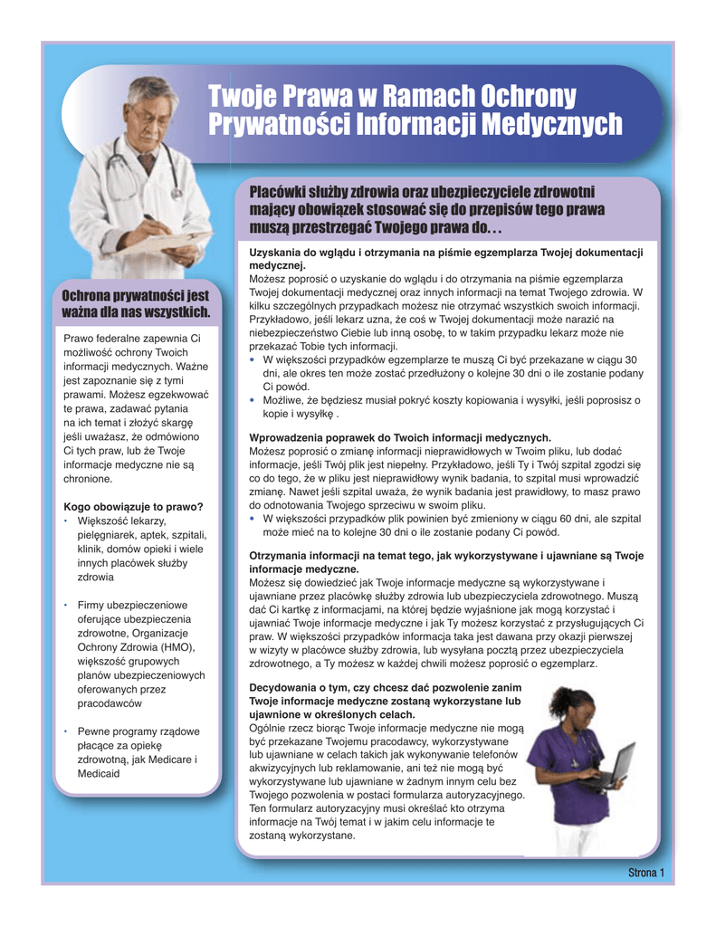 Twoje Prawa w Ramach Ochrony Prywatności Informacji Medycznych Placówki służby zdrowia oraz ubezpieczyciele zdrowotni mający obowiązek stosować się do przepisów tego prawa muszą przestrzegać Twojego prawa do. . . Ochrona prywatności jest ważna dla nas wszystkich. Prawo federalne zapewnia Ci możliwość ochrony Twoich informacji medycznych. Ważne jest zapoznanie się z tymi prawami. Możesz egzekwować te prawa, zadawać pytania na ich temat i złożyć skargę jeśli uważasz, że odmówiono Ci tych praw, lub że Twoje informacje medyczne nie są chronione. Kogo obowiązuje to prawo? • Większość lekarzy, pielęgniarek, aptek, szpitali, klinik, domów opieki i wiele innych placówek służby zdrowia • Firmy ubezpieczeniowe oferujące ubezpieczenia zdrowotne, Organizacje Ochrony Zdrowia (HMO), większość grupowych planów ubezpieczeniowych oferowanych przez pracodawców • Pewne programy rządowe płacące za opiekę zdrowotną, jak Medicare i Medicaid Uzyskania do wglądu i otrzymania na piśmie egzemplarza Twojej dokumentacji medycznej. Możesz poprosić o uzyskanie do wglądu i do otrzymania na piśmie egzemplarza Twojej dokumentacji medycznej oraz innych informacji na temat Twojego zdrowia. W kilku szczególnych przypadkach możesz nie otrzymać wszystkich swoich informacji. Przykładowo, jeśli lekarz uzna, że coś w Twojej dokumentacji może narazić na niebezpieczeństwo Ciebie lub inną osobę, to w takim przypadku lekarz może nie przekazać Tobie tych informacji. • W większości przypadków egzemplarze te muszą Ci być przekazane w ciągu 30 dni, ale okres ten może zostać przedłużony o kolejne 30 dni o ile zostanie podany Ci powód. • Możliwe, że będziesz musiał pokryć koszty kopiowania i wysyłki, jeśli poprosisz o kopie i wysyłkę . Wprowadzenia poprawek do Twoich informacji medycznych. Możesz poprosić o zmianę informacji nieprawidłowych w Twoim pliku, lub dodać informacje, jeśli Twój plik jest niepełny. Przykładowo, jeśli Ty i Twój szpital zgodzi się co do tego, że w pliku jest nieprawidłowy wynik badania, to szpital musi wprowadzić zmianę. Nawet jeśli szpital uważa, że wynik badania jest prawidłowy, to masz prawo do odnotowania Twojego sprzeciwu w swoim pliku. • W większości przypadków plik powinien być zmieniony w ciągu 60 dni, ale szpital może mieć na to kolejne 30 dni o ile zostanie podany Ci powód. Otrzymania informacji na temat tego, jak wykorzystywane i ujawniane są Twoje informacje medyczne. Możesz się dowiedzieć jak Twoje informacje medyczne są wykorzystywane i ujawniane przez placówkę służby zdrowia lub ubezpieczyciela zdrowotnego. Muszą dać Ci kartkę z informacjami, na której będzie wyjaśnione jak mogą korzystać i ujawniać Twoje informacje medyczne i jak Ty możesz korzystać z przysługujących Ci praw. W większości przypadków informacja taka jest dawana przy okazji pierwszej w wizyty w placówce służby zdrowia, lub wysyłana pocztą przez ubezpieczyciela zdrowotnego, a Ty możesz w każdej chwili możesz poprosić o egzemplarz. Decydowania o tym, czy chcesz dać pozwolenie zanim Twoje informacje medyczne zostaną wykorzystane lub ujawnione w określonych celach. Ogólnie rzecz biorąc Twoje informacje medyczne nie mogą być przekazane Twojemu pracodawcy, wykorzystywane lub ujawniane w celach takich jak wykonywanie telefonów akwizycyjnych lub reklamowanie, ani też nie mogą być wykorzystywane lub ujawniane w żadnym innym celu bez Twojego pozwolenia w postaci formularza autoryzacyjnego. Ten formularz autoryzacyjny musi określać kto otrzyma informacje na Twój temat i w jakim celu informacje te zostaną wykorzystane. Strona 1 Twoje Prawa w Ramach Ochrony Prywatności Informacji Medycznych Placówki służby zdrowia oraz ubezpieczyciele zdrowotni mający obowiązek stosować się do przepisów tego prawa muszą przestrzegać Twojego prawa do. . . Ochrona prywatności jest ważna dla nas wszystkich. Inne prawa związane z prywatnością. W ramach ustaw stanowych mogą Ci przysługiwać inne prawa o prywatności informacji. Jeśli te prawa mają wpływ na to, jak można wykorzystywać lub ujawniać Twoje informacje medyczne, to musi to być wyjaśnione na kartce, którą otrzymasz. Aby uzyskać więcej informacji. To jest jedynie krótkie podsumowanie informacji na temat przysługujących Ci praw i ochrony w ramach federalnego prawa o ochronie prywatności informacji medycznych. Możesz też zadawać pytania w placówce służby zdrowia i u ubezpieczyciela zdrowotnego na temat sposobów wykorzystywania lub ujawniania Twoich informacji medycznych oraz na temat przysługujących Ci praw. Możesz uzyskać więcej informacji, w tym również informacji na temat składania skarg w rządzie USA na stronie internetowej: www.hhs.gov/ocr/hipaa/. Opublikowane przez: U.S. Department of Health & Human Services Office for Civil Rights Otrzymania raportu na temat tego, kiedy i dlaczego ujawniono Twoje informacje medyczne. W ramach przepisów prawnych można wykorzystać i ujawnić Twoje informacje medyczne z określonych powodów, jak w celu upewnienia się, że lekarze oferują dobrą opiekę a domy opieki są czyste i bezpieczne, w przypadku zgłoszenia, że w Twojej okolicy pojawiła się grypa, lub składania wymaganych raportów policji, czyli na przykład informowanie o ranach postrzałowych. W wielu przypadkach możesz poprosić i otrzymać listę osób, którym ujawniono Twoje informacje medyczne z tych właśnie powodów. • Możesz raz w roku otrzymać taki raport bezpłatnie. • W większości przypadków raport otrzymasz w ciągu 60 dni, ale może też upłynąć dodatkowe 30 dni o ile zostanie podany Ci powód. Skontaktowania się z Tobą w innym miejscu niż w domu. Możesz złożyć rozsądne prośby o to, aby kontaktować się z Tobą w innych miejscach lub w inny sposób. Przykładowo, możesz poprosić żeby pielęgniarka zadzwoniła do Ciebie do biura zamiast do