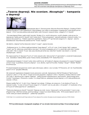powiat_klodzki http://powiat.klodzko.pl/zdrowie/promocja-zdrowia/twarze-depr esji-nie-oceniam-akceptuje-kampania-o-depresji.html „Twarze depresji. Nie oceniam. Akceptuję” - kampania o depresji Organizatorami akcji s?: Stowarzyszenie Aktywnie Przeciwko Depresji i Fundacja ITAKA Centrum Poszukiwa? Ludzi Zaginionych. Celem kampanii jest walka ze stereotypami i stygmatyzacj? osób choruj?cych na depresj?. S?u?y? ma temu pokazywanie przyk?adów osób s?awnych i znanych, którzy zmagali si? z t? chorob?. - Na temat depresji Polacy nadal wiedz? niewiele. Wydaje si? to zwyk?e dziwactwo, zwyk?a chandra, a tak nie jest, bo depresja jest bardzo powa?n? chorob?, któr? trzeba leczy?. Warto przypomnie? statystyki policyjne, z których wynika, ?e w tamtym roku ponad 6 tys. Polaków pope?ni?o samobójstwo. Spora cz??? spo?ród nich zmaga?a si? z depresj? - mówi?a dziennikarzom Anna Morawska autorka ksi??ki "Twarze depresji". Jak doda?a, z depresj? mo?na skutecznie walczy? i wygra? - poprzez leczenie. - Problemem jest to, ?e w Polsce nadal powiedzenie ''mam depresj?'' wi??e si? z tym, ?e kto? dostaje ?atk? z napisem ''wariat'', jest ?le traktowany, przyk?adowo traci prac?. Po to jest ta kampania, po to s? te przyk?ady osób, które ?wietnie sobie radz?, ?eby to zmieni?. To jest taka sama choroba jak ka?da inna. Jedni bior? insulin?, inni chemi?, a inni leki antydepresyjne - mówi?a. Do rozpoczynaj?cej si? akcji przy??czy?o si? wiele znanych osób, które nie boj? si? opowiedzie? o swoich do?wiadczeniach, m.in. dziennikarz Andrzej Bober, pisarz Tomasz Jastrun, dziennikarka TVP Joanna Racewicz. Ambasadorami kampanii s? równie? osoby, które osobi?cie nie do?wiadczy?y depresji, ale postanowi?y wesprze? kampani? i zwróci? uwag? na problemy chorych na depresj? - m.in. aktorka, wspó?za?o?ycielka Fundacji "Akogo?" i Kliniki "Budzik" Ewa B?aszczyk. W ramach kampanii przygotowane zosta?y spoty telewizyjne, radiowe oraz wywiady. W Warszawie, od 1 do 14 pa?dziernika pojawi? si? te? specjalne bilboardy. Jak zaznaczaj? organizatorzy kampanii, koszty ponoszone z powodu depresji przez Zak?ad Ubezpiecze? Spo?ecznych, wynios?y w 2013 r. a? 762 mln z?. Z kolei na leczenie pacjentów z depresj? w 2013 r. Narodowy Fundusz Zdrowia wyda? 163,5 mln z?. Równocze?nie z raportu "Depresja - analiza kosztów ekonomicznych i spo?ecznych", opracowanego przez Uczelni? ?azarskiego w Warszawie, wynika, ?e co drugi Polak nie podejmuje leczenia depresji, a wi?c skala problemu jest znacznie wi?ksza. Eksperci podkre?laj? te?, ?e cho? s?owo "depresja" jest rodzaju ?e?skiego, nie oznacza to, ?e nie dotyka m??czyzn. Ze statystyk wynika, ?e coraz wi?cej m??czyzn zmaga si? z t? chorob? i nie wie, jak sobie z ni? poradzi?. A? trzykrotnie wi?cej m??czyzn ni? kobiet pope?nia te? samobójstwo. "Nieleczona depresja jest chorob? ?mierteln?. Depresja ma wiele twarzy. Upraszczaj?c, mo?na powiedzie?, ?e jest to stan d?ugotrwa?ego obni?enia nastroju, porównywalnego z rozpacz? po stracie bliskiej osoby. St?d czasami depresj? myli si? z ?a?ob?, która jest stanem naturalnym" - podkre?laj? specjali?ci. (?ród?o:http://www.rynekzdrowia.pl/Uslugi-medyczne/Twarze-depresji-Nie-oceniam-Akceptuje-ruszyla-kampania-spoleczna,155481,8.html) Wi?cej informacji o kampanii znajduje si? na stronie internetowej http://twarzedepresji.pl/ Data publikacji 2017-03-03 14:51:36, Strona: 1/2 powiat_klodzki http://powiat.klodzko.pl/zdrowie/promocja-zdrowia/twarze-depr esji-nie-oceniam-akceptuje-kampania-o-depresji.html Podejrzewasz, ?e masz depresj?? Wiesz, ?e chorujesz na depresj?, lecz nadal masz opory przed pój?ciem do specjalisty? Mo?e obawiasz si? reakcji otoczenia na wiadomo??, ?e leczysz si? u psychiatry? Jeste? w trakcie leczenia, ale leki nie dzia?aj?? Masz pytania, których nie zada?e? lekarzowi prowadz?cemu? Twój bliski jest chory na depresj?, a Ty nie wiesz jak mo?esz mu pomóc? Antydepresyjny Telefon Zaufania Fundacji ITAKA 22 654 40 41 Czynny w poniedzia?ki w godz. 17.00-20.00 Data publikacji 2017-03-03 14:51:36, Strona: 2/2