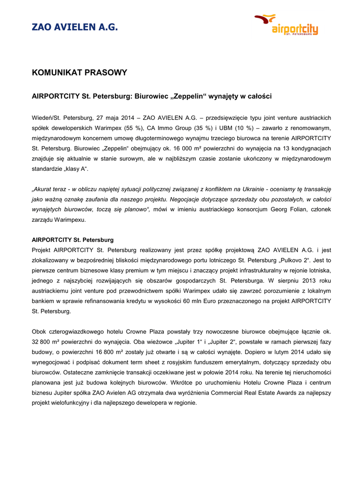 ZАО АVIELEN A.G. KOMUNIKAT PRASOWY AIRPORTCITY St. Petersburg: Biurowiec „Zeppelin“ wynajęty w całości Wiedeń/St. Petersburg, 27 maja 2014 – ZAO AVIELEN A.G. – przedsięwzięcie typu joint venture austriackich spółek deweloperskich Warimpex (55 %), CA Immo Group (35 %) i UBM (10 %) – zawarło z renomowanym, międzynarodowym koncernem umowę długoterminowego wynajmu trzeciego biurowca na terenie AIRPORTCITY St. Petersburg. Biurowiec „Zeppelin“ obejmujący ok. 16 000 m² powierzchni do wynajęcia na 13 kondygnacjach znajduje się aktualnie w stanie surowym, ale w najbliższym czasie zostanie ukończony w międzynarodowym standardzie „klasy A“. „Akurat teraz - w obliczu napiętej sytuacji politycznej związanej z konfliktem na Ukrainie - oceniamy tę transakcję jako ważną oznakę zaufania dla naszego projektu. Negocjacje dotyczące sprzedaży obu pozostałych, w całości wynajętych biurowców, toczą się planowo“, mówi w imieniu austriackiego konsorcjum Georg Folian, członek zarządu Warimpexu. AIRPORTCITY St. Petersburg Projekt AIRPORTCITY St. Petersburg realizowany jest przez spółkę projektową ZAO AVIELEN A.G. i jest zlokalizowany w bezpośredniej bliskości międzynarodowego portu lotniczego St. Petersburg „Pulkovo 2“. Jest to pierwsze centrum biznesowe klasy premium w tym miejscu i znaczący projekt infrastrukturalny w rejonie lotniska, jednego z najszybciej rozwijających się obszarów gospodarczych St. Petersburga. W sierpniu 2013 roku austriackiemu joint venture pod przewodnictwem spółki Warimpex udało się zawrzeć porozumienie z lokalnym bankiem w sprawie refinansowania kredytu w wysokości 60 mln Euro przeznaczonego na projekt AIRPORTCITY St. Petersburg. Obok czterogwiazdkowego hotelu Crowne Plaza powstały trzy nowoczesne biurowce obejmujące łącznie ok. 32 800 m² powierzchni do wynajęcia. Oba wieżowce „Jupiter 1“ i „Jupiter 2“, powstałe w ramach pierwszej fazy budowy, o powierzchni 16 800 m² zostały już otwarte i są w całości wynajęte. Dopiero w lutym 2014 udało się wynegocjować i podpisać dokument term sheet z rosyjskim funduszem emerytalnym, dotyczący sprzedaży obu biurowców. Ostateczne zamknięcie transakcji oczekiwane jest w połowie 2014 roku. Na terenie tej nieruchomości planowana jest już budowa kolejnych biurowców. Wkrótce po uruchomieniu Hotelu Crowne Plaza i centrum biznesu Jupiter spółka ZAO Avielen AG otrzymała dwa wyróżnienia Commercial Real Estate Awards za najlepszy projekt wielofunkcyjny i dla najlepszego dewelopera w regionie. ZАО АVIELEN A.G. ZAO AVIELEN A.G. Spółka projektowa ZAO AVIELEN A.G. zajmuje się rozwojem i prowadzeniem czterogwiazdkowego Hotelu Crowne Plaza, oferującego 294 pokoje i obszerne pomieszczenia konferencyjne, oraz trzech biurowców (32.800 m²) na terenie business district “Pulkovo 2” w AIRPORTCITY St. Petersburg. www.avielen.net Struktura udziałowców ZAO AVIELEN A.G.: 55 % Warimpex Finanz- und Beteiligungs AG 35 % CA Immo Group 10 % UBM Realitätenentwicklung AG Warimpex Finanz- und Beteiligungs AG Warimpex Finanz- und Beteiligungs AG to spółka inwestycyjno-deweloperska z siedzibą w Wiedniu, notowana na giełdach w Wiedniu i w Warszawie (WXF). Jako jeden z największych inwestorów na rynku hotelarskim w Europie Środkowej i Wschodniej Warimpex jest obecnie właścicielem, współwłaścicielem lub podmiotem prowadzącym 19 hoteli biznesowych i luksusowych o łącznej liczbie ok. 4 700 pokoi oraz pięciu budynków komercyjnych i biurowych o łącznej powierzchni użytkowej ok. 43 000 m². W ciągu ostatnich 25 lat Warimpex zrealizował projekty rozwojowe w sektorze nieruchomości o łącznej wartości ponad 1 mld Euro. Jednoznaczna koncentracja na jakości i długotrwałości stwarza Warimpexowi duży potencjał wzrostu także na przyszłość. Do najbardziej spektakularnych nieruchomości Warimpexu należą hotele andel’s w Berlinie i Łodzi, hotele marki angelo w Pradze, Pilźnie, Katowicach, Bukareszcie i Jekaterynburgu, hotel Kempinski w Wiedniu oraz sprzedany w 2012 roku, a następnie przejęty w dzierżawę hotel InterContinental w Warszawie. Kontakt: Warimpex Finanz- und Beteiligungs AG Bridge Sp. z o.o. Christoph Salzer, [email protected] Magdalena Wróbel Daniel Folian, [email protected] [email protected] Tel. +43 1 310 55 00 Tel. +48 662 003 559 www.warimpex.com CA Immo CA Immo należy do wiodących spółek deweloperskich w Europie Środkowej i jest notowana w ramach głównego indeksu ATX Giełdy Wiedeńskiej. Zasadniczym przedmiotem jej działalności jest wynajem i rozwój nieruchomości komercyjnych, szczególnie w segmencie powierzchni biurowych. Firma powstała w 1987 roku i dysponuje nieruchomościami o wartości ok. 4 mld € (stan: 31.12.2013) w Niemczech, Austrii i Europie Wschodniej. Kontakt: CA Immo Susanne Steinböck, [email protected] Tel. +43 1 532 59 07 533 www.caimmo.com ZАО АVIELEN A.G. UBM Realitätenentwicklung AG UBM Realitätenentwicklung AG zajmuje się rozwojem, wynajmem i sprzedażą nieruchomości w całej Europie. Spółka założona w 1873 roku prowadzi szeroko zakrojoną działalność i posiada swoje oddziały w Bułgarii, Niemczech, Francji, Chorwacji, Holandii, Polsce, Rumunii, Rosji, Szwajcarii, na Słowacji, w Czechach i na Węgrzech. Akcje UBM są notowane na Giełdzie Papierów Wartościowych w Wiedniu, a jej głównymi akcjonariuszami są Porr (41%) i CA Immo (25%). Koncepcja sukcesu zakłada politykę ostrożnego ryzyka i konkretnych wartości - Profit is an Opinion, Cash is a Fact. Na dzień 31.12.2013 UBM posiadała działki o powierzchni 2,5 mln m² i nieruchomości o powierzchni użytkowej 460.000 m². W portfolio firmy znajdują się także udziały w 14 hotelach z ponad 3.660 pokojami. Kontakt: UBM Realitätenentwicklung AG Roman Rusy Informationsmanagement, [email protected] Tel. +43 2625 37 164 www.ubm.at