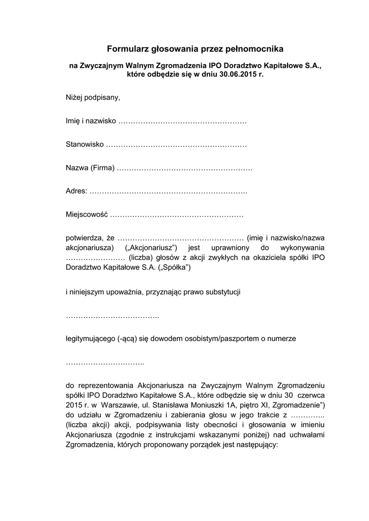 Formularz głosowania przez pełnomocnika na Zwyczajnym Walnym Zgromadzenia IPO Doradztwo Kapitałowe S.A., które odbędzie się w dniu 30.06.2015 r. Niżej podpisany, Imię i nazwisko ……………………………………………. Stanowisko ………………………………………………… Nazwa (Firma) ………………………………………………. Adres: ………………………………………………………. Miejscowość ……………………………………………… potwierdza, że …………………………………………… (imię i nazwisko/nazwa akcjonariusza) („Akcjonariusz”) jest uprawniony do wykonywania …………………… (liczba) głosów z akcji zwykłych na okaziciela spółki IPO Doradztwo Kapitałowe S.A. („Spółka”) i niniejszym upoważnia, przyznając prawo substytucji ……………………………….. legitymującego (-ącą) się dowodem osobistym/paszportem o numerze ………………………….. do reprezentowania Akcjonariusza na Zwyczajnym Walnym Zgromadzeniu spółki IPO Doradztwo Kapitałowe S.A., które odbędzie się w dniu 30 czerwca 2015 r. w Warszawie, ul. Stanisława Moniuszki 1A, piętro XI, Zgromadzenie”) do udziału w Zgromadzeniu i zabierania głosu w jego trakcie z ………….. (liczba akcji) akcji, podpisywania listy obecności i głosowania w imieniu Akcjonariusza (zgodnie z instrukcjami wskazanymi poniżej) nad uchwałami Zgromadzenia, których proponowany porządek jest następujący: INSTRUKCJA GŁOSOWANIA PEŁNOMOCNIKA Na Zwyczajnym Walnym Zgromadzeniu Spółki IPO Doradztwo Kapitałowe S.A. które odbędzie się w dniu 30.06.2015 r. w Warszawie, ul. Stanisława Moniuszki 1A, piętro XI Pkt porz./ nr uchw. Uchwała/Punkt porządku obrad 2/1 Wybór przewodniczącego Nadzwyczajnego Walnego Zgromadzenia 4/2 Przyjęcie porządku obrad 5/3 Rozpatrzenie i zatwierdzenie sprawozdania Zarządu z działalności Spółki w 2014 roku oraz sprawozdania finansowego Spółki za 2014 rok 6/4 Podjęcie uchwały w sprawie pokrycia straty netto Spółki za rok obrotowy 2014 7 / 5-9 Podjęcie uchwał w sprawie udzielenia członkom Zarządu absolutorium z wykonania obowiązków za 2014 rok 8 / 10-16 Podjęcie uchwał w sprawie udzielenia członkom Rady Nadzorczej absolutorium z wykonania obowiązków za 2014 rok 9 / 17-18 Podjęcie uchwał w sprawie zmian w składzie Rady Nadzorczej 10 / 19 Podjęcie uchwały w sprawie przyjęcia programu motywacyjnego 11 / 20 Podjęcie uchwały w sprawie emisji Warrantów Subskrypcyjnych 12 / 21 Podjęcie uchwały w sprawie warunkowego podwyższenia kapitału zakładowego Spółki poprzez emisję Akcji serii F, pozbawienia prawa poboru dotychczasowych akcjonariuszy, dematerializacji i wprowadzenia akcji serii F do obrotu na rynku NewConnect prowadzonego jako alternatywny system obrotu przez Giełdę Papierów Wartościowych w Warszawie S.A. Głosuję za Głosuję przeciw Wstrzymuję się od głosu Żądanie zaprotokołowa nia sprzeciwu do uchwały Prosimy o zaznaczenie odpowiedniej rubryki krzyżykiem („X”) Inne uwagi: Inne Załącznik: oryginał imiennego zaświadczenia o prawie uczestnictwa w walnym zgromadzeniu Imię i Nazwisko Mocodawcy: …………………………………… Stanowisko: ………………………………………………………. Data: ………………………………. Podpis: …………………………………………………………….. UWAGA: NINIEJSZE PEŁNOMOCNICTWO JEST NIESKUTECZNE, GDY NAZWISKO/NAZWA AKCJONARIUSZA WSKAZANE W PEŁNOMOCNICTWIE NIE JEST TAKIE SAMO JAK NAZWISKO /NAZWA AKCJONARIUSZA ZNAJDUJACEJ SIĘ NA WYKAZIE AKCJONARIUSZY SPORZĄDZONYM I PRZEKAZANYM SPÓŁCE PRZEZ KRAJOWY DEPOZYT PAPIERÓW WARTOŚCIOWYCH S.A., O KTÓRYM MOWA 3 W ART. 406 § 6 KODEKSU SPÓŁEK HANDLOWYCH.