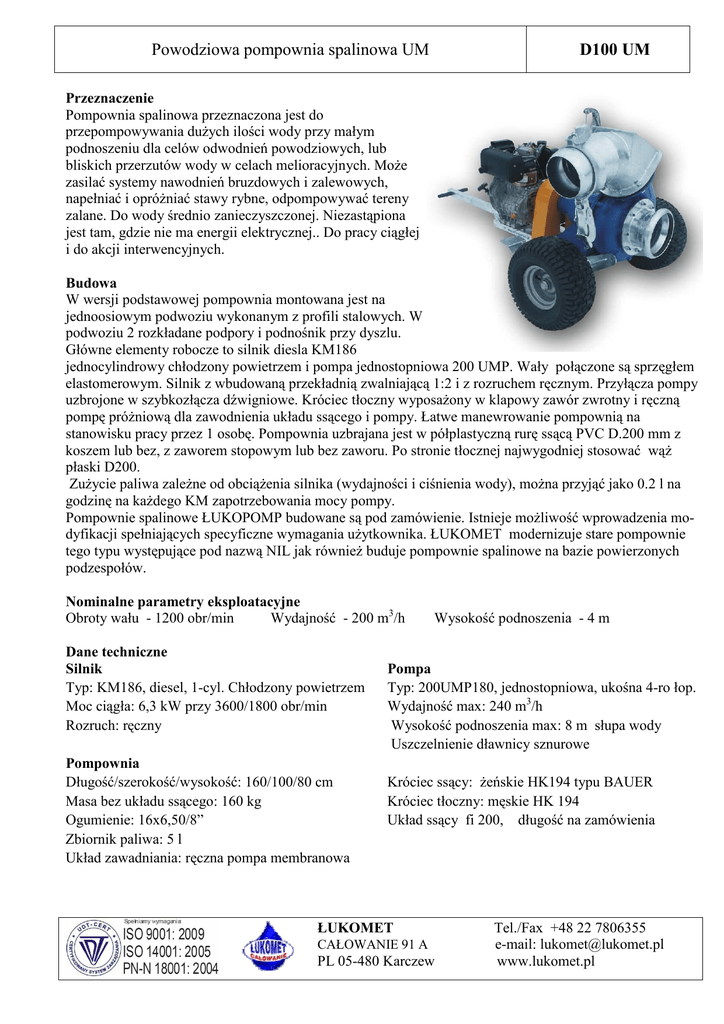 Powodziowa pompownia spalinowa UM D100 UM Przeznaczenie Pompownia spalinowa przeznaczona jest do przepompowywania dużych ilości wody przy małym podnoszeniu dla celów odwodnień powodziowych, lub bliskich przerzutów wody w celach melioracyjnych. Może zasilać systemy nawodnień bruzdowych i zalewowych, napełniać i opróżniać stawy rybne, odpompowywać tereny zalane. Do wody średnio zanieczyszczonej. Niezastąpiona jest tam, gdzie nie ma energii elektrycznej.. Do pracy ciągłej i do akcji interwencyjnych. Budowa W wersji podstawowej pompownia montowana jest na jednoosiowym podwoziu wykonanym z profili stalowych. W podwoziu 2 rozkładane podpory i podnośnik przy dyszlu. Główne elementy robocze to silnik diesla KM186 jednocylindrowy chłodzony powietrzem i pompa jednostopniowa 200 UMP. Wały połączone są sprzęgłem elastomerowym. Silnik z wbudowaną przekładnią zwalniającą 1:2 i z rozruchem ręcznym. Przyłącza pompy uzbrojone w szybkozłącza dźwigniowe. Króciec tłoczny wyposażony w klapowy zawór zwrotny i ręczną pompę próżniową dla zawodnienia układu ssącego i pompy. Łatwe manewrowanie pompownią na stanowisku pracy przez 1 osobę. Pompownia uzbrajana jest w półplastyczną rurę ssącą PVC D.200 mm z koszem lub bez, z zaworem stopowym lub bez zaworu. Po stronie tłocznej najwygodniej stosować wąż płaski D200. Zużycie paliwa zależne od obciążenia silnika (wydajności i ciśnienia wody), można przyjąć jako 0.2 l na godzinę na każdego KM zapotrzebowania mocy pompy. Pompownie spalinowe ŁUKOPOMP budowane są pod zamówienie. Istnieje możliwość wprowadzenia modyfikacji spełniających specyficzne wymagania użytkownika. ŁUKOMET modernizuje stare pompownie tego typu występujące pod nazwą NIL jak również buduje pompownie spalinowe na bazie powierzonych podzespołów. Nominalne parametry eksploatacyjne Obroty wału - 1200 obr/min Wydajność - 200 m3/h Dane techniczne Silnik Typ: KM186, diesel, 1-cyl. Chłodzony powietrzem Moc ciągła: 6,3 kW przy 3600/1800 obr/min Rozruch: ręczny Pompownia Długość/szerokość/wysokość: 160/100/80 cm Masa bez układu ssącego: 160 kg Ogumienie: 16x6,50/8” Zbiornik paliwa: 5 l Układ zawadniania: ręczna pompa membranowa Wysokość podnoszenia - 4 m Pompa Typ: 200UMP180, jednostopniowa, ukośna 4-ro łop. Wydajność max: 240 m3/h Wysokość podnoszenia max: 8 m słupa wody Uszczelnienie dławnicy sznurowe Króciec ssący: żeńskie HK194 typu BAUER Króciec tłoczny: męskie HK 194 Układ ssący fi 200, długość na zamówienia ŁUKOMET CAŁOWANIE 91 A PL 05-480 Karczew Tel./Fax +48 22 7806355 e-mail: [email protected] www.lukomet.pl