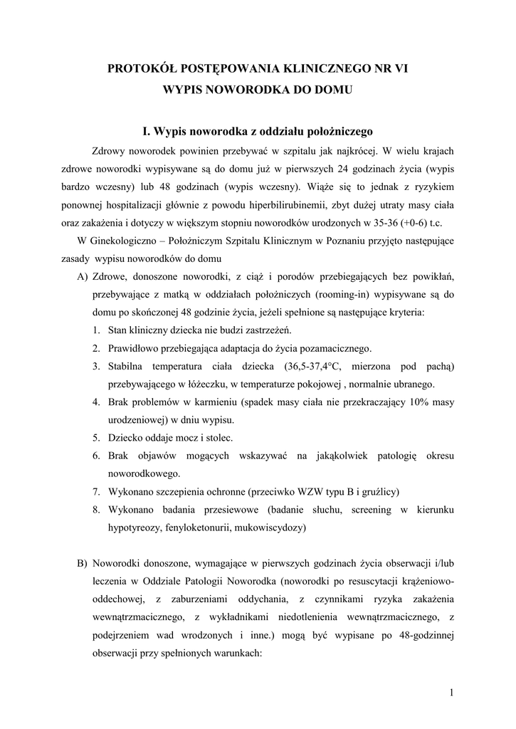 PROTOKÓŁ POSTĘPOWANIA KLINICZNEGO NR VI WYPIS NOWORODKA DO DOMU I. Wypis noworodka z oddziału położniczego Zdrowy noworodek powinien przebywać w szpitalu jak najkrócej. W wielu krajach zdrowe noworodki wypisywane są do domu już w pierwszych 24 godzinach życia (wypis bardzo wczesny) lub 48 godzinach (wypis wczesny). Wiąże się to jednak z ryzykiem ponownej hospitalizacji głównie z powodu hiperbilirubinemii, zbyt dużej utraty masy ciała oraz zakażenia i dotyczy w większym stopniu noworodków urodzonych w 35-36 (+0-6) t.c. W Ginekologiczno – Położniczym Szpitalu Klinicznym w Poznaniu przyjęto następujące zasady wypisu noworodków do domu A) Zdrowe, donoszone noworodki, z ciąż i porodów przebiegających bez powikłań, przebywające z matką w oddziałach położniczych (rooming-in) wypisywane są do domu po skończonej 48 godzinie życia, jeżeli spełnione są następujące kryteria: 1. Stan kliniczny dziecka nie budzi zastrzeżeń. 2. Prawidłowo przebiegająca adaptacja do życia pozamacicznego. 3. Stabilna temperatura ciała dziecka (36,5-37,4°C, mierzona pod pachą) przebywającego w łóżeczku, w temperaturze pokojowej , normalnie ubranego. 4. Brak problemów w karmieniu (spadek masy ciała nie przekraczający 10% masy urodzeniowej) w dniu wypisu. 5. Dziecko oddaje mocz i stolec. 6. Brak objawów mogących wskazywać na jakąkolwiek patologię okresu noworodkowego. 7. Wykonano szczepienia ochronne (przeciwko WZW typu B i gruźlicy) 8. Wykonano badania przesiewowe (badanie słuchu, screening w kierunku hypotyreozy, fenyloketonurii, mukowiscydozy) B) Noworodki donoszone, wymagające w pierwszych godzinach życia obserwacji i/lub leczenia w Oddziale Patologii Noworodka (noworodki po resuscytacji krążeniowooddechowej, z zaburzeniami oddychania, z czynnikami ryzyka zakażenia wewnątrzmacicznego, z wykładnikami niedotlenienia wewnątrzmacicznego, z podejrzeniem wad wrodzonych i inne.) mogą być wypisane po 48-godzinnej obserwacji przy spełnionych warunkach: 1 1. W chwili wypisu stan kliniczny dziecka nie budzi zastrzeżeń. 2. Nie stwierdza się odchyleń w badaniach dodatkowych (zgodnie z obowiązującymi normami) 3. Stabilna temperatura ciała dziecka (36,5-37,4°C, mierzona pod pachą) przebywającego w łóżeczku, w temperaturze pokojowej , normalnie ubranego 4. Brak problemów w karmieniu (spadek masy ciała nie przekraczający 10% masy urodzeniowej) w dniu wypisu 5. Dziecko oddaje mocz i stolec 6. Wykonano szczepienia ochronne (przeciwko WZW typu B i gruźlicy) 7. Wykonano badania przesiewowe (badanie słuchu, screening w kierunku: hypotyreozy, fenyloketonurii, mukowiscydozy) 8. W ocenie personelu opiekunowie potrafią zapewnić dziecku prawidłową opiekę (są poinformowani o problemach jakie mogą pojawić się u dziecka; w razie wystąpienia niepokojących objawów wiedzą gdzie mogą uzyskać pomoc lekarza rodzinnego lub specjalisty) C) Noworodki urodzone przedwcześnie między 35 a 36 t.c (+ 0-6dni) mogą być wypisane ze szpitala po skończonej 72 godzinie życia jeżeli są spełnione następujące warunki 1. W chwili wypisu stan kliniczny dziecka nie budzi zastrzeżeń. 2. Noworodek w łóżeczku utrzymuje prawidłową temperaturę ciała (36,5-37,4°C, mierzona pod pachą), w temperaturze pokojowej, normalnie ubranego. 3. Prawidłowe karmienie noworodka (naturalne lub sztuczne) 24 godziny przed wypisem, prawidłowa koordynacja odruchu ssania , połykania i oddychania. 4. Utrata masy ciała nie przekraczająca 10% urodzeniowej masy ciała w dniu wypisu. 5. Prawidłowe wyniki badań dodatkowych. 6. Wykonano szczepienia ochronne (przeciwko WZW typu B i gruźlicy). 7. Wykonano badania przesiewowe (badanie słuchu, screening w kierunku: hypotyreozy, fenyloketonurii, mukowiscydozy). 8. W ocenie personelu opiekunowie potrafią zapewnić dziecku prawidłową opiekę (są poinformowani o problemach, jakie mogą pojawić się u dziecka; w razie wystąpienia niepokojących objawów wiedzą gdzie mogą uzyskać pomoc lekarza rodzinnego lub specjalisty. 2 UWAGA: Noworodka do wypisu kwalifikuje i przygotowuje dokumentację wypisową lekarz wizytujący w danym dniu oddział położniczy. Noworodki wypisywane po godzinie 16.00 wymagają dodatkowego badania przez lekarza dyżurnego oraz zatwierdzenia dokumentacji wypisowej. W Ginekologiczno – Położniczym Szpitalu Klinicznym w Poznaniu wypisy z oddziałów położniczych odbywają się do godziny 19.00. II. Wypis noworodka z Oddziału Patologii Noworodka Wypis noworodka z Oddziału Patologii Noworodka może nastąpić po spełnieniu następujących warunków: 1) Masa ciała ≥ 1900g. W określonych warunkach, możliwy jest wypis noworodka z niższą masą ciała (>1800g), przy pełnej współpracy i akceptacji przez opiekunów. 2) Noworodek w łóżeczku utrzymuje prawidłową temperaturę ciała (36,5-37,4°C, mierzona pod pachą), w temperaturze pokojowej i normalnym ubraniu. 3) Noworodek systematycznie przybiera na masie ciała (15-20g/kg/dobę), chętnie pije z piersi lub butelki. 4) U dziecka w ciągu 3 dni przed wypisem nie obserwowano epizodów bezdechów bez stosowania leków stymulujących układ oddechowy. 5) W dniu wypisu stan kliniczny dziecka nie budzi zastrzeżeń. 6) Prawidłowe wyniki badań dodatkowych. 7) Wykonano szczepienia ochronne (przeciwko WZW typu B i gruźlicy). Przy braku kwalifikacji do szczepienia w dniu wypisu szczepienie przeciwko gruźlicy można wykonać w Poradni Lekarza Rodzinnego lub w określonym punkcie szczepień (w Poznaniu ul. Sporna). 8) Wykonano badania przesiewowe ( badanie słuchu, badanie ultrasonograficzne OUN u dzieci < 32t.c, screening w kierunku hypotyreozy, fenyloketonurii, mukowiscydozy oraz badanie okulistyczne zgodne z wytycznymi Ministerstwa Zdrowia). 9) W ocenie personelu opiekunowie potrafią zapewnić dziecku prawidłową opiekę (są poinformowani o problemach jakie mogą pojawić się u dziecka; w razie wystąpienia niepokojących objawów w