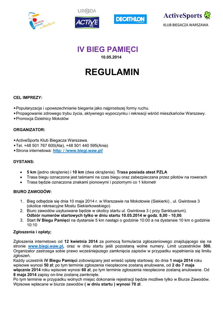 KLUB BIEGACZA WARSZAWA IV BIEG PAMIĘCI 10.05.2014 REGULAMIN CEL IMPREZY: • Popularyzacja i upowszechnianie biegania jako najprostszej formy ruchu. • Propagowanie zdrowego trybu życia, aktywnego wypoczynku i rekreacji wśród mieszkańców Warszawy. • Promocja Dzielnicy Mokotów ORGANIZATOR: • ActiveSports Klub Biegacza Warszawa. • Tel. +48 501 767 600(Ala), +48 501 440 595(Ania) • Strona internetowa: http: / /www.biegi.waw.pl/ DYSTANS: 5 km (jedno okrążenie) i 10 km (dwa okrążenia). Trasa posiada atest PZLA Trasa biegu oznaczona jest taśmami na czas biegu oraz zabezpieczana przez pilotów na rowerach Trasa będzie oznaczona znakami pionowymi i poziomymi co 1 kilometr BIURO ZAWODÓW: 1. Bieg odbędzie się dnia 10 maja 2014 r. w Warszawie na Mokotowie (Siekierki) , ul. Gwintowa 3 (okolice rekreacyjne Mostu Siekierkowskiego) 2. Biuro zawodów usytuowane będzie w okolicy startu ul. Gwintowa 3 ( przy Sanktuarium). Odbiór numerów startowych tylko w dniu startu 10.05.2014 w godz. 8,00 - 10,00. 3. Start IV Biegu Pamięci na dystansie 5 km nastąpi o godzinie 10:00 a na dystansie 10 km o godzinie 10:10 Zgłoszenia i opłaty; Zgłoszenia internetowo od 12 kwietnia 2014 za pomocą formularza zgłoszeniowego znajdującego się na stronie www.biegi.waw.pl, oraz w dniu startu jeśli pozostaną wolne numery. Limit uczestników 500. Organizator zastrzega sobie prawo wcześniejszego zamknięcia zapisów w przypadku wypełnienia się limitu zgłoszeń. Każdy uczestnik IV Biegu Pamięci zobowiązany jest wnieść opłatę startową: do dnia 1 maja 2014 roku wpisowe wynosi 50 zł; po tym terminie zgłoszenia nieopłacone zostaną anulowane, od 2 do 7 maja włącznie 2014 roku wpisowe wynosi 60 zł, po tym terminie zgłoszenia nieopłacone zostaną anulowane. Od 8 maja 2014 zapisy on-line zostaną zamknięte. Po tym terminie w przypadku wolnych miejsc dokonanie rejestracji będzie możliwe tylko w Biurze Zawodów. Wpisowe wpłacane w biurze zawodów ( w dniu startu ) wynosi 70 zł. Opłata startowa dla zawodników posiadających "Kartę Rabatową Festiwalu Biegowego" wynosi 20 % mniej odpowiednio: 40 zł, 48 zł, 56 zł. Przy wpłacie na konto, należy wpisać nr karty. O wysokości wpisowego decyduje termin wpłaty, a nie data zapisania się do biegu. Opłata raz uiszczona nie podlega zwrotowi. Jest możliwość przenoszenia raz wniesionej opłaty na rzecz innego zawodnika. Decyduje kolejność zgłoszeń wraz z opłatą na konto: W przypadku wniesienia opłaty startowej w niewystarczającej wysokości ( np. w wyniku przekroczenia terminu wpłaty określonego w niniejszym regulaminie ) zawodnik jest zobowiązany do dopłacenia różnicy do wysokości kwoty, jaką winien on był wnieść zgodnie z terminem w jakim dokonywał swojej pierwszej wpłaty. Opłatę należy wpłacać na konto bankowe: ActiveSports Alina Sakwa, Nr konta: 50 1020 5558 1111 1304 4560 0545 z dopiskiem „IV Bieg Pamięci", imię i nazwisko, dystans. Zawodniczki i zawodnicy urodzeni w roku 1949 lub wcześniej wnoszą opłatę startową w wysokości 50% stawek podanych . Prawo bezpłatnego startu mają osoby zaproszone przez Organizatora Biegu. W wyjątkowych sytuacjach, zwolnione z opłaty są osoby tylko te, które wcześniej uzgodniły to z organizatorem. Dowodem wpłynięcia opłaty jest pojawienie się TAK przy nazwisku zawodnika na liście startowej na stronie www.biegi.waw.pl Organizator nie odpowiada za zaginięcie zgłoszenia oraz przelewu bankowego z winy banku. W ramach wpisowego organizator zapewnia: medal dla każdego zawodnika który ukończy swój dystans pakiet startowy: okolicznościowa koszulka techniczna, kosmetyki firmy URODA, „napój”, batony energetyczne obsługę biura zawodów, obsługę sędziowską, zabezpieczenie medyczne i techniczne napoje, poczęstunek (catering) na mecie losowanie nagród wśród wszystkich zawodników komunikat z wynikami Organizator nie zwraca opłaty wpisowej osobom, które nie ukończyły zawodów PROGRAM ZAWODÓW: • Start godz.10:00 na dystansie 5 km. • Start godz.10:10 na dystansie 10 km. • ok. godz. 11:00 dekoracja zwycięzców na dystansie 5 km • ok. godz. 11:45 dekoracja zwycięzców na dystansie 10 km • ok. godz. 12:00 losowanie upominków wśród wszystkich zawodników Organizator ma prawo zmienić godzinę i miejsce startu oraz trasę powiadamiając o tym uprzednio zawodników. WARUNKI UCZESTNICTWA • Prawo uczestnictwa w biegu na dystansie 10 km mają osoby pełnoletnie oraz osoby w wieku 16-18 lat, jeśli mają pisemną zgodę rodziców. Impreza ma charakter otwarty. • Prawo uczestnictwa w biegu na dystansie 5 km mają osoby pełnoletnie oraz osoby w wieku 13-18 lat, jeśli mają pisemną zgodę rodziców. Impreza ma charakter otwarty. • Warunkiem dopuszczenia do biegu głównego jest przedstawienie przez uczestnika zaświadczenia lekarskiego o braku przeciwwskazań do udziału w biegu lub złożenie podpisanego własnoręcznie oświadczenia o zdolności do udziału w biegu /Dz. Ustaw nr 101, poz. 1095/. Każdy uczestnik startuje na własną odpowiedzialność (w przypadku zawodników niepełnoletnich na odpowiedzialność rodziców lub prawnych opiekunów). Oświadczenie do pobranie na stronie www.biegi.waw.pl Uczestnicy mają obowiązek zapoznania się z mapą trasy biegu NUMER STARTOWY • Każdy uczestnik ma obowiązek przymocować numer startowy z przodu tak, aby był bardzo dobrze widoczny podczas przekraczania linii mety. • Numer startowy, należy oddać niezwłocznie po przekroczeniu linii mety • Numeru nie wolno niszczyć, zgniatać i rolować • Zawodnicy bez widocznego numeru startowego nie będą sklasyfikowani. NAGRODY • Zdobywcy miejsc I - VI w klasyfikacji generalnej kobiet i mężczyzn biegu otrzymują puchary oraz nagrody rzeczowe. Losowanie nagród rzeczowych wśród wszystkich zawodników którzy ukończą bieg INFORMACJE DODATKOWE: Zawody odbywają się bez względu na pogodę, przy otwartym ruchu pieszym i 