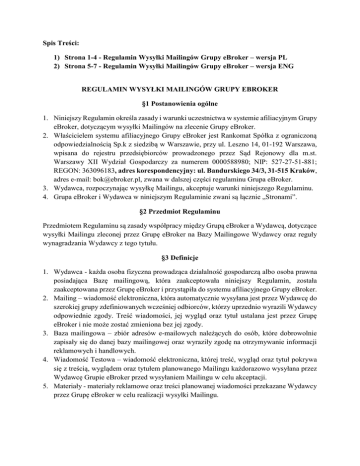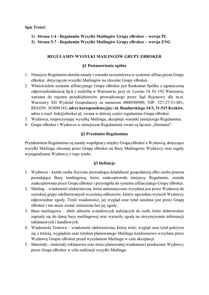 Spis Treści: 1) Strona 1-4 - Regulamin Wysyłki Mailingów Grupy eBroker – wersja PL 2) Strona 5-7 - Regulamin Wysyłki Mailingów Grupy eBroker – wersja ENG REGULAMIN WYSYŁKI MAILINGÓW GRUPY EBROKER §1 Postanowienia ogólne 1. Niniejszy Regulamin określa zasady i warunki uczestnictwa w systemie afiliacyjnym Grupy eBroker, dotyczącym wysyłki Mailingów na zlecenie Grupy eBroker. 2. Właścicielem systemu afiliacyjnego Grupy eBroker jest Rankomat Spółka z ograniczoną odpowiedzialnością Sp.k z siedzibą w Warszawie, przy ul. Leszno 14, 01-192 Warszawa, wpisana do rejestru przedsiębiorców prowadzonego przez Sąd Rejonowy dla m.st. Warszawy XII Wydział Gospodarczy za numerem 0000588980; NIP: 527-27-51-881; REGON: 363096183, adres korespondencyjny: ul. Bandurskiego 34/3, 31-515 Kraków, adres e-mail: [email protected], zwana w dalszej części regulaminu Grupa eBroker. 3. Wydawca, rozpoczynając wysyłkę Mailingu, akceptuje warunki niniejszego Regulaminu. 4. Grupa eBroker i Wydawca w niniejszym Regulaminie zwani są łącznie „Stronami”. §2 Przedmiot Regulaminu Przedmiotem Regulaminu są zasady współpracy między Grupą eBroker a Wydawcą, dotyczące wysyłki Mailingu zleconej przez Grupę eBroker na Bazy Mailingowe Wydawcy oraz reguły wynagradzania Wydawcy z tego tytułu. §3 Definicje 1. Wydawca - każda osoba fizyczna prowadząca działalność gospodarczą albo osoba prawna posiadająca Bazę mailingową, która zaakceptowała niniejszy Regulamin, została zaakceptowana przez Grupę eBroker i przystąpiła do systemu afiliacyjnego Grupy eBroker. 2. Mailing – wiadomość elektroniczna, która automatycznie wysyłana jest przez Wydawcę do szerokiej grupy zdefiniowanych wcześniej odbiorców, którzy uprzednio wyrazili Wydawcy odpowiednie zgody. Treść wiadomości, jej wygląd oraz tytuł ustalana jest przez Grupę eBroker i nie może zostać zmieniona bez jej zgody. 3. Baza mailingowa – zbiór adresów e-mailowych należących do osób, które dobrowolnie zapisały się do danej bazy mailingowej oraz wyraziły zgodę na otrzymywanie informacji reklamowych i handlowych. 4. Wiadomość Testowa – wiadomość elektroniczna, której treść, wygląd oraz tytuł pokrywa się z treścią, wyglądem oraz tytułem planowanego Mailingu każdorazowo wysyłana przez Wydawcę Grupie eBroker przed wysyłaniem Mailingu w celu akceptacji. 5. Materiały - materiały reklamowe oraz treści planowanej wiadomości przekazane Wydawcy przez Grupę eBroker w celu realizacji wysyłki Mailingu. §4 Zasady współpracy 1. W celu prawidłowego wykonania wysyłki Mailingu, Wydawca po otrzymaniu od Grupy eBroker Materiałów, wysyła Grupie eBroker na wskazane adresy mailowe (adresy testowe) wskazane przez Grupę eBroker Wiadomość Testową. 2. Grupa eBroker po otrzymaniu Wiadomości Testowej, informuje drogą mailową Wydawcę o zaakceptowaniu Wiadomości Testowej albo o konieczności wprowadzenia zmian w Wiadomości Testowej. 3. Po otrzymaniu informacji od Grupy eBroker o akceptacji Wiadomości Testowej, Wydawca dokonuje wysyłki Mailingu z zastrzeżeniem ustępu poniżej. 4. Wydawca wysyła Mailing o takiej treści, wyglądzie i tytule, jak zaakceptowana przez Grupę eBroker Wiadomość Testowa. §5 Prawa i obowiązki Grupy eBroker 1. Grupa eBroker oświadcza i gwarantuje Wydawcy, że posiada niezbędne zasoby i środki techniczne pozwalające na współpracę zgodnie z Regulaminem. 2. Grupa eBroker zobowiązuje się do zachowania najwyższej staranności w procesie zliczania statystyk wysyłki Mailingu. 3. Grupa eBroker będzie udostępniać Wydawcy Materiały niezbędne do wysyłki Mailingu zgodnie z niniejszym Regulaminem. §6 Oświadczenia Wydawcy 1. Wydawca oświadcza i gwarantuje Grupie eBroker, że posiada niezbędne zasoby i środki techniczne umożliwiające współpracę zgodnie z Regulaminem. 2. Wydawca oświadcza, że przysługują mu wszelkie prawa do użytkowania zadeklarowanych Grupie eBroker Baz mailingowych oraz prezentacji w ich obrębie Reklamy. 3. Wydawca oświadcza, iż wszelkie Bazy danych (Bazy mailingowe), z których korzysta powstały oraz są prowadzone zgodnie z obowiązującymi przepisami prawa, w tym w szczególności zgodnie z przepisami ustawy z 29 sierpnia 1997 r. o ochronie danych osobowych (Dz.U. 1997 nr 133 poz. 883 z późn. zm.) oraz Wydawca oświadcza, iż posiada oświadczenia osób fizycznych, których dane znajdują się w Bazie danych (Bazie mailingowej), iż wyrażają one zgodę na przetwarzanie ich danych w celach marketingowych, oraz zgodę na otrzymywanie informacji handlowych w myśl przepisów ustawy z dnia 18 lipca 2002 r. o świadczeniu usług drogą elektroniczną (Dz.U. 2002 nr 144 poz. 1204 z późn.zm.), a zgody te są ważne i nie zostały cofnięte. 4. Wydawca oświadcza, iż wszelkie podane przez niego dane dotyczące jego osoby są zgodne z prawdą oraz ze stanem faktycznym. §7 Prawa i obowiązki Wydawcy 1. Wydawca przed wysyłką Mailingu zobowiązany jest uprzednio szczegółowo uzgodnić warunki wysyłki z przedstawicielami Grupy eBroker. Ustalenia dotyczą w szczególności daty wysyłki, treści mailingu, testu poprawności technicznej mailingu, sposobu rozliczenia. 2. Wydawca nie ma prawa ingerować w treść Materiałów, przekazaną mu przez Grupę eBroker w celu realizacji wysyłki Mailingu. 3. Wydawca ma prawo wykorzystać Materiały, o których mowa w ust. powyżej wyłącznie w celu realizacji wysyłki Mailingu na zlecenie Grupy eBroker. 4. Wydawca zobowiązuje się nie podejmować działań niezgodnych z założeniami niniejszego Regulaminu, których celem jest sztuczne zawyżanie kwoty wynagrodzenia należnego Wydawcy. Przede wszystkim zabrania się wykorzystywania kontaktów do znajomych i bliskich, bądź namawianie ich do działań, które z założenia nie będą nastawione na skorzystanie z oferty zamieszczonej w Mailingu. 5. Wydawcę obowiązuje zakaz dostarczania treści o charakterze bezprawnym. 6. 