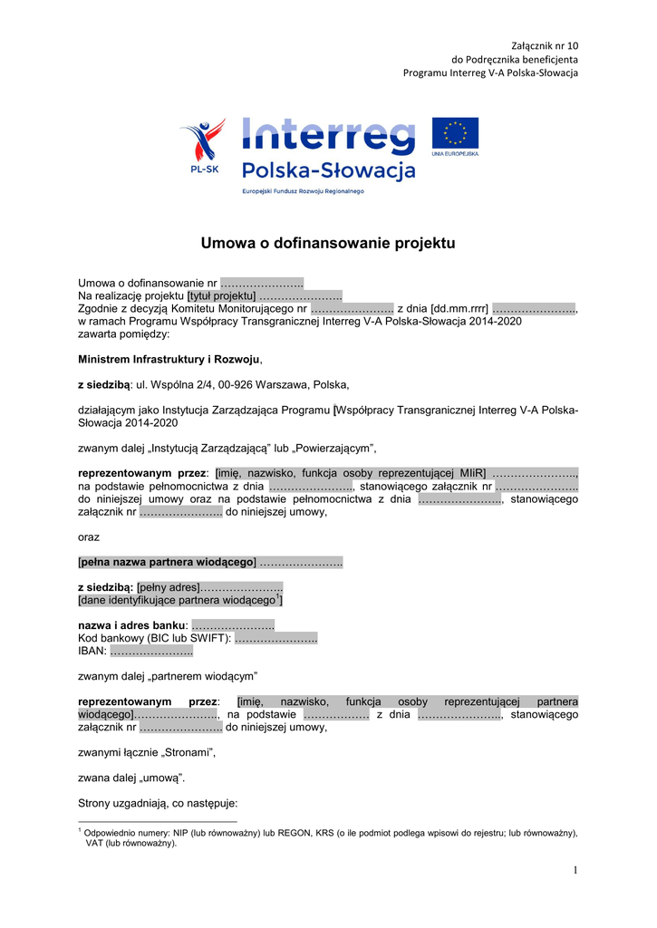 Załącznik nr 10 do Podręcznika beneficjenta Programu Interreg V-A Polska-Słowacja Umowa o dofinansowanie projektu Umowa o dofinansowanie nr ………………….. Na realizację projektu [tytuł projektu] ………………….. Zgodnie z decyzją Komitetu Monitorującego nr ………………….. z dnia [dd.mm.rrrr] ………………….., w ramach Programu Współpracy Transgranicznej Interreg V-A Polska-Słowacja 2014-2020 zawarta pomiędzy: Ministrem Infrastruktury i Rozwoju, z siedzibą: ul. Wspólna 2/4, 00-926 Warszawa, Polska, działającym jako Instytucja Zarządzająca Programu [Współpracy Transgranicznej Interreg V-A PolskaSłowacja 2014-2020 zwanym dalej „Instytucją Zarządzającą” lub „Powierzającym”, reprezentowanym przez: [imię, nazwisko, funkcja osoby reprezentującej MIiR] ………………….., na podstawie pełnomocnictwa z dnia ………………….., stanowiącego załącznik nr ………………….. do niniejszej umowy oraz na podstawie pełnomocnictwa z dnia ………………….., stanowiącego załącznik nr ………………….. do niniejszej umowy, oraz [pełna nazwa partnera wiodącego] ………………….. z siedzibą: [pełny adres]………………….. 1 [dane identyfikujące partnera wiodącego ] nazwa i adres banku: ………………….. Kod bankowy (BIC lub SWIFT): ………………….. IBAN: ………………….. zwanym dalej „partnerem wiodącym” reprezentowanym przez: [imię, nazwisko, funkcja osoby reprezentującej partnera wiodącego]………………….., na podstawie ……………… z dnia ………………….., stanowiącego załącznik nr ………………….. do niniejszej umowy, zwanymi łącznie „Stronami”, zwana dalej „umową”. Strony uzgadniają, co następuje: 1 Odpowiednio numery: NIP (lub równoważny) lub REGON, KRS (o ile podmiot podlega wpisowi do rejestru; lub równoważny), VAT (lub równoważny). 1 §1 DEFINICJE Ilekroć w umowie mowa jest o: 1. „Aktualnym Podręczniku beneficjenta” – należy przez to rozumieć dokument uchwalony przez Komitet Monitorujący, którego zmiany również zatwierdza Komitet Monitorujący, zawierający zasady przygotowania, realizacji, monitorowania i rozliczania projektu oraz jego trwałości. Partner wiodący ma dostęp do aktualnego Podręcznika beneficjenta i jest niezwłocznie informowany za pośrednictwem strony internetowej programu o jego zmianach oraz o terminie, od którego nowa wersja Podręcznika beneficjenta obowiązuje. 2. „Centralnym systemie teleinformatycznym” – należy przez to rozumieć system teleinformatyczny wspierający realizację programu, za którego budowę i funkcjonowanie odpowiada minister właściwy ds. rozwoju regionalnego; 3. „Częściowym wniosku o płatność” – należy przez to rozumieć wniosek o płatność przedkładany przez partnera wiodącego i partnera projektu do Kontrolera na zasadach określonych w aktualnym Podręczniku beneficjenta oraz w umowie, obrazujący postępy w realizacji części projektu realizowanej przez danego partnera projektu lub partnera wiodącego; 4. „Dofinansowaniu” – należy przez to rozumieć środki finansowe pochodzące z EFRR; 5. „Dokumentach programowych” – należy przez to rozumieć dokumenty zatwierdzone przez Instytucję Zarządzającą lub Komitet Monitorujący, mające zastosowanie do wdrażania programu; 6. „EFRR” – należy przez to rozumieć Europejski Fundusz Rozwoju Regionalnego; 7. „Elektronicznych wersjach dokumentów” – należy przez to rozumieć dokumenty istniejące wyłącznie w postaci elektronicznej lub ich kopie, oryginalne dokumenty elektroniczne posiadające także wersję papierową, jak również skany i fotokopie oryginalnych dokumentów papierowych, opisane przez partnera wiodącego lub partnera projektu zgodnie z wymaganiami określonymi w aktualnym Podręczniku beneficjenta; 8. „Komitecie Monitorującym” – należy przez to rozumieć Komitet Monitorujący, o którym mowa w art. 47 rozporządzenia ogólnego. 9. „Kontrolerze” – należy przez to rozumieć kontrolera, o którym mowa w art. 23 ust. 4 Rozporządzenia EWT) 10. „Korekcie finansowej” – należy przez to rozumieć kwotę, o jaką pomniejsza się dofinansowanie dla projektu w związku z nieprawidłowością stwierdzoną w zatwierdzonym częściowym wniosku o płatność lub wniosku o płatność dla projektu; 11. "Kosztach bezpośrednich personelu" - należy przez to rozumieć koszty personelu zaangażowanego bezpośrednio w realizację projektu, rozliczane w ramach linii budżetowej: Koszty Personelu; 12. „Kosztach pośrednich” – należy przez to rozumieć koszty niezbędne dla wdrażania projektu, ale niedotyczące bezpośrednio jego głównego przedmiotu, koszty te są określone w aktualnym Podręczniku beneficjenta w ramach linii budżetowej: koszty biurowe i administracyjne; 13. „Krajowym współfinansowaniu” – należy przez to rozumieć wkład partnera wiodącego oraz partnera projektu w całkowity koszt projektu, określony we wniosku o dofinansowanie, będący sumą środków krajowych – publicznych i prywatnych; 14. Należnym dofinansowaniu – środki EFRR, które kwalifikuje się do wypłaty partnerowi wiodącemu na podstawie przedstawionych i zatwierdzonych wydatków kwalifikowalnych; 15. ”Nieprawidłowości” – należy przez to rozumieć nieprawidłowość, o której mowa w art. 2 pkt 36 rozporządzenia ogólnego; 16. „Partnerze wiodącym” – należy przez to rozumieć podmiot wskazany we wniosku o dofinansowanie podpisujący umowę o dofinansowanie projektu i odpowiadający za finansową i rzeczową realizację projektu; 2 17. „Partnerze projektu” – należy przez to rozumieć podmiot wskazany we wniosku o dofinansowanie, który uczestniczy w projekcie i jest związany z partnerem wiodącym umową partnerską dotyczącą realizacji projektu; 18. „Programie” – należy przez to rozumieć