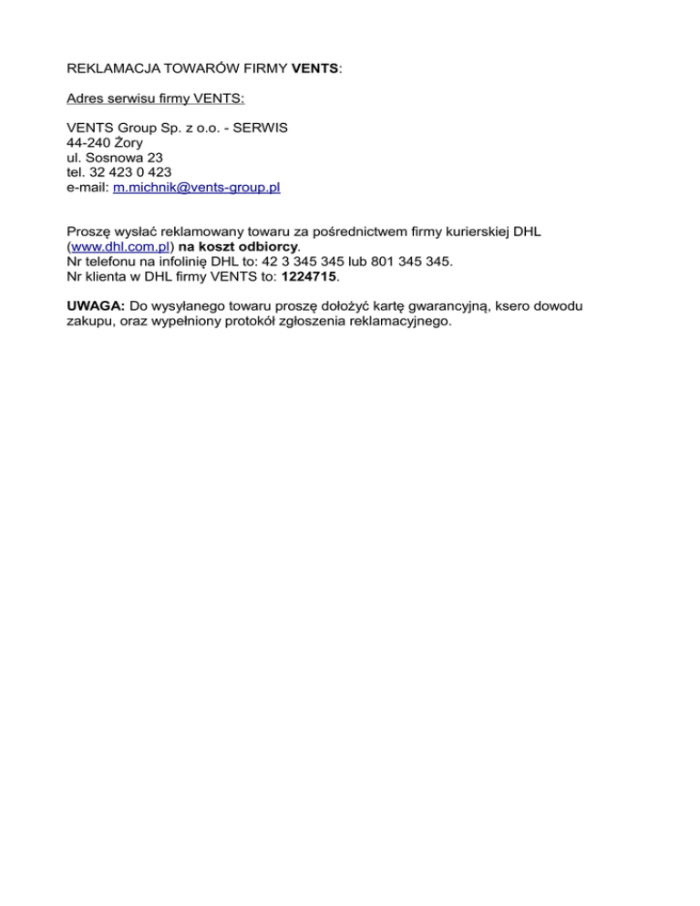 REKLAMACJA TOWARÓW FIRMY VENTS: Adres serwisu firmy VENTS: VENTS Group Sp. z o.o. - SERWIS 44-240 Żory ul. Sosnowa 23 tel. 32 423 0 423 e-mail: [email protected] Proszę wysłać reklamowany towaru za pośrednictwem firmy kurierskiej DHL (www.dhl.com.pl) na koszt odbiorcy. Nr telefonu na infolinię DHL to: 42 3 345 345 lub 801 345 345. Nr klienta w DHL firmy VENTS to: 1224715. UWAGA: Do wysyłanego towaru proszę dołożyć kartę gwarancyjną, ksero dowodu zakupu, oraz wypełniony protokół zgłoszenia reklamacyjnego.