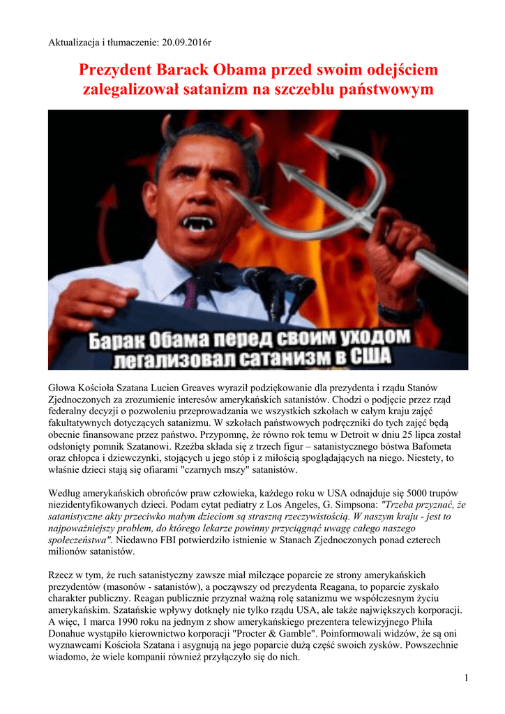 Aktualizacja i tłumaczenie: 20.09.2016r Prezydent Barack Obama przed swoim odejściem zalegalizował satanizm na szczeblu państwowym Głowa Kościoła Szatana Lucien Greaves wyraził podziękowanie dla prezydenta i rządu Stanów Zjednoczonych za zrozumienie interesów amerykańskich satanistów. Chodzi o podjęcie przez rząd federalny decyzji o pozwoleniu przeprowadzania we wszystkich szkołach w całym kraju zajęć fakultatywnych dotyczących satanizmu. W szkołach państwowych podręczniki do tych zajęć będą obecnie finansowane przez państwo. Przypomnę, że równo rok temu w Detroit w dniu 25 lipca został odsłonięty pomnik Szatanowi. Rzeźba składa się z trzech figur – satanistycznego bóstwa Bafometa oraz chłopca i dziewczynki, stojących u jego stóp i z miłością spoglądających na niego. Niestety, to właśnie dzieci stają się ofiarami "czarnych mszy" satanistów. Według amerykańskich obrońców praw człowieka, każdego roku w USA odnajduje się 5000 trupów niezidentyfikowanych dzieci. Podam cytat pediatry z Los Angeles, G. Simpsona: "Trzeba przyznać, że satanistyczne akty przeciwko małym dzieciom są straszną rzeczywistością. W naszym kraju - jest to najpoważniejszy problem, do którego lekarze powinny przyciągnąć uwagę całego naszego społeczeństwa". Niedawno FBI potwierdziło istnienie w Stanach Zjednoczonych ponad czterech milionów satanistów. Rzecz w tym, że ruch satanistyczny zawsze miał milczące poparcie ze strony amerykańskich prezydentów (masonów - satanistów), a począwszy od prezydenta Reagana, to poparcie zyskało charakter publiczny. Reagan publicznie przyznał ważną rolę satanizmu we współczesnym życiu amerykańskim. Szatańskie wpływy dotknęły nie tylko rządu USA, ale także największych korporacji. A więc, 1 marca 1990 roku na jednym z show amerykańskiego prezentera telewizyjnego Phila Donahue wystąpiło kierownictwo korporacji "Procter & Gamble". Poinformowali widzów, że są oni wyznawcami Kościoła Szatana i asygnują na jego poparcie dużą część swoich zysków. Powszechnie wiadomo, że wiele kompanii również przyłączyło się do nich. 1 Szczególną uwagę sataniści udzielają młodzieży. Dla większości młodych ludzi swego rodzaju wstępem do satanizmu jest święto "Halloween" (31 października), które przedstawia starożytny rytuał oddania kultu szatanowi, panu śmierci. Uczestniczy w tym święcie prawie cała populacja USA. Nic dziwnego, że amerykański Kościół Szatana jawnie ogłosił ten dzień swoim świętem, które, zgodnie z ich planami, powinno świadczyć o władzy szatana w świecie. Począwszy od lat 60-tych, sataniści postanowili wziąć edukację seksualną młodzieży w swoje ręce. "Poprzez seks posiądziemy ich duszę" powiedział przywódca satanistów i autor książki "Biblia Szatana" La Vey, który był także głównym doradcą w Hollywood. Tak zwana rewolucja seksualna dała pełną swobodę dla rozpusty i sodomii. Dziś nie jest tajemnicą, że USA i Wielka Brytania stały się międzynarodowym centrum satanizmu, rozprzestrzeniającym swoje wpływy na całym świecie. Według pani Diany Kor, szefowej organizacji «Childwatch» («Nadzór nad dziećmi"), tylko w jednej Anglii co roku cztery tysiące dzieci składanych jest w ofierze szatanowi. Wejście w związki homoseksualne z dziećmi płci męskiej, jest jednym z głównych sposobów wtajemniczenia ludzi w rytuały satanistyczne. Publiczne zdemaskowanie europejskich rodzin królewskich i szefów wielu krajów, oskarżonych o satanizm, ujawniają wieloletnią ropę tzw. "elity". W Rosji satanizm zaczął aktywnie działać za Gorbaczowa i był propagowany za Borysa Jelcyna. Główny pracownik naukowy Instytutu rosyjskiego MSW, wiceprezes rosyjskiego Kryminologicznego Stowarzyszenia, doktor filozofii, profesor I. J. Sundijew uważa, że "Ekstremizm religijny zwykle u nas łączy się z islamskim ekstremizmem, ale tak nie jest. Szczególne zagrożenie stanowią nie islamiści, a przedstawicieli satanistycznych sekt i podobnych organizacji." Według danych rosyjskiego Ministerstwa Spraw Wewnętrznych, tylko w samej Moskwie istnieje około dwudziestu kierunków sekt satanistycznych, obejmujących w sumie ponad 30 grup zorganizowanych. Z całą pewnością wiadomo, że sekty satanistyczne działają w następujących miastach Rosji: Astrachań, Biełgorod, Briańsk i region Briańska, Birobidżan i niektóre inne zamieszkałe punkty Żydowskiego Regionu Autonomicznego (ros.- ЕАО - Евреейская автоноемная оебласть), Władywostok, Wołogda i region Wołogdy, region Woroneża, Jekatierynburg, Krasnodarski Kraj i Krasnojarski Kraj, Republika Krym, Moskwa i region Moskwy, Republika Mordowia, Niżnij Nowgorod, Rostów nad Donem, Sankt - Petersburg i region Leningradzki, Sewastopol, Stawropolski Kraj, region Samary, Republika Tatarstan, Twer, region Tuły, Tiumeń, Chabarowski Kraj, Republika Chakasja, region Czelabińska, Jakuck, Jarosław i region Jarosławia. Znak satanizmu 2 Rosyjscy sataniści są dobrze sponsorowani. Wiadomo, na przykład, że miejscem lokalizacji centrów i miejscem zebrań satanistycznej sekty "Południowy Krzyż", jest trzykondygnacyjna świątynia kultowa w obszarze przemysłowym Miedwiedkowo (tam również znajduje się redakcja jej własnej gazety), mają oni swoją bazę na przedmieściach Moskwy i kawiarnię na moście Kuznieckim. Przez pewien czas Muzeum Politechniczne na Łubiance w Moskwie było jednym z miejsc zbiórki satanistów. Departament Stanu USA patronuje im. W 2009 roku Głowa Departamentu Stosunków Zewnętrznych Cerkwi Patriarchatu Moskiewskiego, abp Hilarion, wysłał list do ambasadora USA w Rosji Johna Beyrle, w którym skrytykował raport Departamentu Stanu USA, negatywnie oceniający ograniczenia satanistów w Rosji. Biorąc pod uwagę, że Stany Zjednoczone oficjalnie zalegalizowały satanizm na poziomie państwowym, nie jest wykl