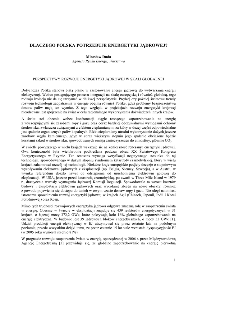 DLACZEGO POLSKA POTRZEBUJE ENERGETYKI JĄDROWEJ? Mirosław Duda Agencja Rynku Energii, Warszawa PERSPEKTYWY ROZWOJU ENERGETYKI JĄDROWEJ W SKALI GLOBALNEJ Dotychczas Polska stanowi białą plamę w zastosowaniu energii jądrowej do wytwarzania energii elektrycznej. Wobec postępującego procesu integracji na skalę europejską i równieŜ globalną, tego rodzaju izolacja nie da się utrzymać w dłuŜszej perspektywie. Prędzej czy później światowe trendy rozwoju technologii zaopatrzenia w energię obejmą równieŜ Polskę, gdyŜ problemy bezpieczeństwa dostaw paliw mają ten wymiar. Z tego względu w projekcjach rozwoju energetyki krajowej nieodzowne jest spojrzenie na świat w celu racjonalnego wykorzystania doświadczeń innych krajów. A świat stoi obecnie wobec konfrontacji ciągle rosnącego zapotrzebowania na energię z wyczerpującymi się zasobami ropy i gazu oraz coraz bardziej odczuwalnymi wymogami ochrony środowiska, zwłaszcza związanymi z efektem cieplarnianym, za który w duŜej części odpowiedzialne jest spalanie organicznych paliw kopalnych. Efekt cieplarniany utrudni wykorzystanie duŜych jeszcze zasobów węgla kamiennego, gdyŜ w coraz większym stopniu jego spalanie obciąŜone będzie kosztami szkód w środowisku, spowodowanych emisją zanieczyszczeń do atmosfery, głównie CO2. W świetle powyŜszego w wielu krajach wskazuje się na konieczność renesansu energetyki jądrowej. Owa konieczność była wielokrotnie podkreślana podczas obrad XX Światowego Kongresu Energetycznego w Rzymie. Ten renesans wymaga weryfikacji negatywnego stosunku do tej technologii, spowodowanego w duŜym stopniu syndromem katastrofy czarnobylskiej, który w wielu krajach zahamował rozwój tej technologii. Niektóre kraje europejskie podjęły decyzje o stopniowym wycofywaniu elektrowni jądrowych z eksploatacji (np. Belgia, Niemcy, Szwecja), a w Austrii, w wyniku referendum doszło nawet do odstąpienia od uruchomienia elektrowni gotowej do eksploatacji. W USA, jeszcze przed katastrofą czarnobylską, po awarii w Three Mile Island w 1979 r., drastycznie wzrosły wymagania Jądrowej Komisji Regulacji. Spowodowało to wzrost kosztów budowy i eksploatacji elektrowni jądrowych oraz wycofanie zleceń na nowe obiekty, równieŜ z powodu pojawienia się dostępu do tanich w owym czasie dostaw ropy i gazu. Nie uległ natomiast istotnemu spowolnieniu rozwój energetyki jądrowej w krajach Azji (Chinach, Japonii, Indii i Korei Południowej) oraz Rosji. Mimo tych trudności rozwojowych energetyka jądrowa odgrywa znaczną rolę w zaopatrzeniu świata w energię. Obecnie w świecie w eksploatacji znajduje się 439 reaktorów energetycznych w 31 krajach, o łącznej mocy 372,2 GWe, które pokrywają koło 16% globalnego zapotrzebowania na energię elektryczną. W budowie jest 39 jądrowych bloków energetycznych, o mocy 33 GWe [1]. Udział produkcji energii elektrycznej w EJ utrzymywał się przez ostatnie lata na podobnym poziomie, przede wszystkim dzięki temu, Ŝe przez ostatnie 15 lat stale wzrastała dyspozycyjność EJ (w 2005 roku wyniosła średnio 81%). W prognozie rozwoju zaopatrzenia świata w energię, sporządzonej w 2006 r. przez Międzynarodową Agencję Energetyczną [3] przewiduje się, Ŝe globalne zapotrzebowanie na energię pierwotną 1 wzrośnie do roku 2030 w scenariuszu referencyjnym o 53 %, natomiast w scenariuszu alternatywnym (tzw. efektywnościowym), o 9.9 % mniej. Zapotrzebowanie na energię elektryczną w skali globalnej w scenariuszu referencyjnym ma wzrastać ze średniorocznym tempem 2.6%. W krajach rozwijających się wzrost zapotrzebowania na energię elektryczną ma być znacznie wyŜszy. Najszybciej zuŜycie energii elektrycznej ma wzrastać w Indiach (5.4%) i w Chinach (4.9%). W scenariuszu alternatywnym wzrost zapotrzebowania globalnego na energię elektryczną ma być niŜszy o 12.2% dzięki przedsięwzięciom stymulującym wzrost efektywności uŜytkowania tej energii. Średnioroczny wzrost zapotrzebowania na energię elektryczną w scenariuszu alternatywnym wyniesie 2.1%. Ceny ropy naftowej i gazu na rynku światowym po odreagowaniu spadkiem na duŜy wzrost sprzed kilku lat będą istotnie wzrastać (rys. 1). 160 140 USD'2007/boe 120 100 80 60 40 20 0 2007 2009 2011 Ropa 2013 2015 2017 Gaz ziemny 2019 2021 2023 2025 2027 2029 Węgiel energetyczny Rys. 1. Historia i prognoza cen nośników energii pierwotnej importowanych do Europy wg EnergSys (2008). W skali globalnej wskaźnik zasobów ropy naftowej R/P1, wg renomowanych danych statystycznych BP [4] w ciągu ostatnich 30 lat utrzymywał się w granicach 27 – 43 lat. Obecnie wynosi on ok. 41 lat, co powinno być sygnałem ostrzegawczym, głównie dla polityków, zajmujących się zagadnieniami gospodarczymi. Międzynarodowa Agencja Energetyczna uspokaja wprawdzie, Ŝe nie powinno być problemów z dostawami ropy w perspektywie do 2030 r., gdyŜ przewidywany wzrost cen uruchomi środki na niezbędne inwestycje w tym zakresie. PowaŜnym problemem są jednak koszty pozyskania i ceny ropy w dłuŜszej perspektywie, gdyŜ wystąpi potrzeba sięgnięcia po znacznie trudniejsze i mniej wydajne złoŜa roponośne (piaski i łupki bitumiczne). Dla gazu ziemnego wskaźniki R/P są korzystniejsze niŜ dla ropy naftowej, aczkolwiek w ciągu ostatnich pięciu lat wartość R/P obniŜyła się z poziomu ok. 70 do ok. 64 lat. NaleŜy wziąć pod uwagę konieczność ponoszenia ogromnych nakładów na uruchomienie nowych złóŜ oraz budowę gazociągów transportowych przede wszystkim z Rosji do Europy i Azji. W okresie 1970-2007 nastąpił bardzo wysoki, ponad 4 krotny wzrost światowych rezerw gazu ziemnego - do ok. 80 bln m3 w 1980 r. i ok. 180 bln m3 w 2007 r. Skupienie większości światowych rezerw gazu ziemnego w 2 regionach: Rosji (ok. 28%) i krajach OPEC (ok. 50%) stanowi powaŜne zagroŜenie bezpieczeństwa dostaw tego nośnika dla państw, które nie mają wystarczających własnych rezerw i mus