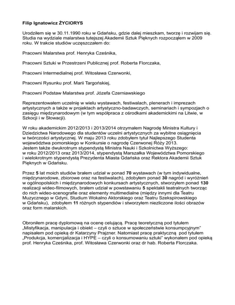 Filip Ignatowicz ŻYCIORYS Urodziłem się w 30.11.1990 roku w Gdańsku, gdzie dalej mieszkam, tworzę i rozwijam się. Studia na wydziale malarstwa tutejszej Akademii Sztuk Pięknych rozpocząłem w 2009 roku. W trakcie studiów uczęszczałem do: Pracowni Malarstwa prof. Henryka Cześnika, Pracowni Sztuki w Przestrzeni Publicznej prof. Roberta Florczaka, Pracowni Intermedialnej prof. Witosława Czerwonki, Pracowni Rysunku prof. Marii Targońskiej, Pracowni Podstaw Malarstwa prof. Józefa Czerniawskiego Reprezentowałem uczelnię w wielu wystawach, festiwalach, plenerach i imprezach artystycznych a także w projektach artystyczno-badawczych, seminariach i sympozjach o zasięgu międzynarodowym (w tym współpraca z ośrodkami akademickimi na Litwie, w Szkocji i w Słowacji). W roku akademickim 2012/2013 i 2013/2014 otrzymałem Nagrodę Ministra Kultury i Dziedzictwa Narodowego dla studentów uczelni artystycznych za wybitne osiągnięcia w twórczości artystycznej. W maju 2013 roku zdobyłem tytuł Najlepszego Studenta województwa pomorskiego w Konkursie o nagrodę Czerwonej Róży 2013. Jestem także dwukrotnym stypendystą Ministra Nauki i Szkolnictwa Wyższego: w roku 2012/2013 oraz 2013/2014, stypendystą Marszałka Województwa Pomorskiego i wielokrotnym stypendystą Prezydenta Miasta Gdańska oraz Rektora Akademii Sztuk Pięknych w Gdańsku. Przez 5 lat moich studiów brałem udział w ponad 70 wystawach (w tym indywidualne, międzynarodowe, zbiorowe oraz na festiwalach), zdobyłem ponad 30 nagród i wyróżnień w ogólnopolskich i międzynarodowych konkursach artystycznych, stworzyłem ponad 130 realizacji wideo-filmowych, brałem udział w powstawaniu 5 spektakli teatralnych tworząc do nich wideo-scenografie oraz elementy multimedialne (między innymi dla Teatru Muzycznego w Gdyni, Studium Wokalno Aktorskiego oraz Teatru Szekspirowskiego w Gdańsku), zdobyłem 11 różnych stypendiów i stworzyłem niezliczone ilości obrazów oraz form malarskich. Obroniłem pracę dyplomową na ocenę celującą. Pracę teoretyczną pod tytułem „Mistyfikacja, manipulacja i obiekt – czyli o sztuce w społeczeństwie konsumpcyjnym” napisałem pod opieką dr Katarzyny Prajzner. Natomiast pracę praktyczną pod tytułem „Produkcja, komercjalizacja i HYPE – czyli o konsumowaniu sztuki” wykonałem pod opieką prof. Henryka Cześnika, prof. Witosława Czerwonki oraz dr hab. Roberta Florczaka. Filip Ignatowicz BIO Urodziłem się w 1990 roku w Gdańsku, gdzie mieszkam, tworzę i rozwijam się. Studia na wydziale malarstwa na gdańskiej Akademii Sztuk Pięknych rozpocząłem w 2009 roku. Dyplom magisterski na wydziale malarstwa obroniłem na ocenę celującą w czerwcu 2014. W swoich działaniach nie ograniczam się jedynie do malarstwa i rysunku. Zajmuję się szeroko pojętą sztuką wizualną - od działań performatywnych, akcji w przestrzeni miejskiej oraz instalacji, przez fotografię do realizacji wideo, etiud filmowych i animacji. Fascynuje mnie produkt i wszelkie relacje z nim związane. Jestem laureatem wielu nagród w ogólnopolskich konkursach artystycznych oraz świadomym uczestnikiem życia kulturalnego. Wystawiałem swoje prace indywidualnie oraz na ekspozycjach zbiorowych, festiwalach międzynarodowych w wielu miastach w Polsce a także na Litwie, we Włoszech, w Argentynie i w Kanadzie. Raczej nie wierzę w rozwój sztuki, tylko w jej ciągłą zmienność. W 2013 roku zdobyłem nagrodę Stowarzyszenie Czerwonej Róży dla Najlepszego Studenta Pomorza. Jestem wielokrotnym stypendystą Ministra Kultury i Dziedzictwa Narodowego, Ministra Nauki i Szkolnictwa Wyższego, Prezydenta Miasta Gdańska oraz Rektor Akademii Sztuk Pięknych. OSIĄGNIĘCIA 2014: Udział w międzynarodowym festiwalu sztuki MORPHOS – Sustainable Empires w Palazzo Albrizzi, w Wenecji we Włoszech. Stworzenie wystawy dyplomowej pt. „Produkcja, komercjalizacja i HYPE – czyli o konsumowaniu sztuki” w przestrzeni pasażu Wielkiej Zbrojowni. Udział w międzynarodowej wystawie sztuki „Pixels of Identities „ w ramach International ArtExpo w Buenos Aires (Argentyna) – Galeria de Arte Laura Haber (Juncal). Udział w VI interdyscyplinarnej Ogólnopolskiej Wystawie Rysunku, Galeria Sztuki Wozownia, Toruń. Premiera oraz pokazy repertuarowe uaktualnionej wersji spektaklu „AŁA RZECZYWISTOŚĆ” w Teatrze Gdynia Główna. Udział w wystawie Dramat Wolności w przestrzeni miejskiej Krakowa, oraz ekspozycja na murze Aresztu Śledczego w Krakowie, projekt artystyczno-badawczy współtworzony przez prawie 100 uczestników, profesorów, doktorantów, studentów z uczelni artystycznych z Bonn, Krakowa, Łodzi, Ostrawy, Poznania, Rzeszowa, Warszawy i Wrocławia. WYBRANE OSIĄGNIĘCIA 2013: Udział w FESTIWALU ARTYSTYCZNYM MarketArt, prezentacja cyklu obrazów 2A0 podczas wystawy Market czy Art? oraz II miejsce w festiwalowym konkursie za instalację/performance GIFT SHOP - Stary Browar – SŁODOWNIA+1, Poznań. Udział w MUZEUM OSOBLIWOŚCI VOL. 5 – interdyscyplinarnej wystawie w ramach Europejskiej Nocy Muzeów, Willa Bergera, Sopot, nowa odsłona GIFT SHOP. Zdobycie Głównej Nagrody Stowarzyszenia Czerwonej Róży w konkursie na najlepszego studenta Pomorza. Dwór Artusa, Gdańsk. Stworzenie instalacji „był dach, był dom” na NARRACJE 2013 – międzynarodowy festiwal sztuki w przestrzeni publicznej, Instytut Kultury Miejskiej, Gdańsk. Udział w projekcie artystyczno-badawczym „DRAMAT WOLNOŚCI” - dwie wystawy w Gdańsku (Gdańska Galeria Miejska oraz Galeria ASP) oraz dwie wystawy w Krakowie (Małopolskie Centrum Dźwięku i Słowa oraz „Dworek Białoprądnicki”). Pokaz pierwszej wersji sztuki z wideo-scenografią oraz elementami multimedialnymi mojego autorstwa, pt. AŁA RZECZYWISTOŚĆ (w reżyserii Macieja Konopińskiego): pokazy w Teatrze Muzycznym w Gdyni, a także w Teatrze Rozrywki w Chorzowie. Udział w II edycji lubelskiego projektu SZTUKA NA GIEŁDZIE (vol. 2 - „na wscho