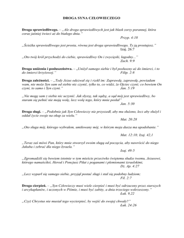 DROGA SYNA CZŁOWIECZEGO Droga sprawiedliwego. – „Ale droga sprawiedliwych jest jak blask zorzy porannej, która coraz jaśniej świeci aż do białego dnia.” Przyp. 4:18 „Ścieżka sprawiedliwego jest prosta, równa jest droga sprawiedliwego, Ty ją prostujesz.” Izaj. 26:7 „Oto twój król przychodzi do ciebie, sprawiedliwy On i zwycięski, łagodny...” Zach. 9:9 Droga uniżenia i posłuszeństwa. – „Uniżył samego siebie i był posłuszny aż do śmierci, i to do śmierci krzyżowej.” Filip. 2:8 Droga zależności. – „Tedy Jezus odezwał się i rzekł im: Zaprawdę, zaprawdę, powiadam wam, nie może Syn sam od siebie nic czynić, tylko to, co widzi, że Ojciec czyni; co bowiem On czyni, to samo i Syn czyni.” Jan. 5:19 „Nie mogę sam z siebie nic uczynić. Jak słyszę, tak sądzę, a sąd mój jest sprawiedliwy, bo staram się pełnić nie moją wolę, lecz wolę tego, który mnie posłał” Jan. 5:30 Droga sługi. – „Podobnie jak Syn Człowieczy nie przyszedł, aby mu służono, lecz aby służył i oddał życie swoje na okup za wielu.” Mat. 20:28 „Oto sługa mój, którego wybrałem, umiłowany mój, w którym moja dusza ma upodobanie.” Mat. 12:18; Izaj. 42,1 „Teraz zaś mówi Pan, który mnie stworzył swoim sługą od poczęcia, aby nawrócić do niego Jakuba i zebrać dla niego Izraela.” Izaj. 49:5 „Zgromadzili się bowiem istotnie w tym mieście przeciwko świętemu słudze twemu, Jezusowi, którego namaściłeś, Herod i Poncjusz Piłat z poganami i plemionami izraelskimi, Dz. Ap. 4:27 „Lecz wyparł się samego siebie, przyjął postać sługi i stał się podobny ludziom; Fil. 2:7 Droga cierpień. – „Syn Człowieczy musi wiele cierpieć i musi być odrzucony przez starszych i arcykapłanów, i uczonych w Piśmie, i musi być zabity, a dnia trzeciego wskrzeszony.” Łuk. 9,22 „Czyż Chrystus nie musiał tego wycierpieć, by wejść do swojej chwały?” Łuk. 24:26 „Przystało bowiem, aby Ten, dla którego i przez którego istnieje wszystko, który przywiódł do chwały wielu synów, sprawcę ich zbawienia uczynił doskonałym przez cierpienia” Hebr. 2:10 „Gdyż i Chrystus raz za grzechy cierpiał, sprawiedliwy za niesprawiedliwych, aby was przywieść do Boga; w ciele wprawdzie poniósł śmierć, lecz w duchu został przywrócony życiu.” 1 Piotr. 3:18 Droga na krzyż . – „I stało się, gdy dopełniały się dni, kiedy miał być wzięty do nieba i postanowił pójść do Jerozolimy,” Łuk. 9:51 „Teraz dusza moja jest zatrwożona, i cóż powiem? Ojcze, wybaw mnie teraz od tej godziny? Przecież dlatego przyszedłem na tę godzinę.” Jan. 12:27 „I w śmiertelnym boju jeszcze gorliwiej się modlił; i był pot jego jak krople krwi, spływające na ziemię.” Łuk. 22:44 „A On dźwigając krzyż swój, szedł na miejsce, zwane Trupią Czaszką, co po hebrajsku zwie się Golgota, gdzie go ukrzyżowali, a z nim innych dwóch, z jednej i z drugiej strony, a pośrodku Jezusa.” Jan. 19:17-18 „..., który dla wystawionej mu radości, wycierpiał krzyż...” Hebr. 12:2