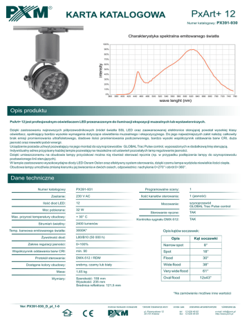 R PxArt+ 12 KARTA KATALOGOWA Numer katalogowy: PX391-930 intensity Charakterystyka spektralna emitowanego światła wave lenght (nm) Opis produktu PxArt+ 12 jest profesjonalnym oświetlaczem LED przeznaczonym do iluminacji ekspozycji muzealnych lub wystawienniczych. Dzięki zastosowaniu najnowszych półprzewodnikowych źródeł światła SSL LED oraz zaawansowanej elektronice sterującej powstał wysokiej klasy oświetlacz, spełniający bardzo wysokie wymagania dotyczące oświetlenia muzealnego i ekspozycyjnego. Do jego najważniejszych zalet należą: całkowity brak emisji promieniowania ultrafioletowego, śladowe ilości promieniowania podczerwonego, bardzo wysoki współczynnik oddawania barw CRI, duża jasność oraz niewielki pobór energii. Urządzenie posiada uchwyt pozwalający na jego montaż do szynoprzewodów GLOBAL Trac Pulse control, wyposażonych w dodatkową linię sterującą. Indywidualny adres przypisany każdej lampie pozwalają na niezależne od ustawień pozostałych lamp regulowanie jasności. Dzięki umieszczonemu na obudowie lampy przyciskowi można nią również sterować ręcznie (np. w przypadku podłączenia lampy do szynoprzewodu pozbawionego linii sterujących). W lampie zastosowano wysokowydajne diody LED Osram Oslon oraz efektywny system sterowania, dzięki czemu lampa wydziela niewielkie ilości ciepła. Obudowa lampy umożliwia zmianę kierunku jej świecenia w dwóch osiach, odpowiednio: nachylenie 0÷270° i obrót 0÷360°. Dane techniczne Numer katalogowy Zasilanie: PX391-931 230 V AC Ilość diod LED: 12 Moc pobierana: 32 W Max. przyrost temperatury obudowy: Strumień świetlny: Temp. barwowa emitowanego światła: Żywotność diod: Zakres regulacji jasności: Współczynnik oddawania barw CRI: Protokół sterowania: Dostępne kolory obudowy: Masa: Wymiary: 1 Programowalne sceny: 1 (jasność) Ilość kanałów sterowania: szynoprzewód GLOBAL Trac Pulse control Mocowanie: + 30° C Sterowanie ręczne: TAK Kontrolka sygnału DMX-512: TAK 2400 lumenów 3000K* Opis kątów soczewek: L80/B10 (50 000 h) Opis Kąt soczewki 0÷100% Narrow spot 8° min. 90 Spot 18° DMX-512 / RDM Flood 30° srebrny, czarny lub biały Wide flood 38° 1,65 kg Very wide flood 61° Szerokość: 159 mm Wysokość: 235 mm Średnica reflektora: 121,5 mm Oval flood 12x43° *Na zamówienie możliwe inne wartości Ver: PX391-930_D_pl_1-0 Konsole teatralne i estradowE Cyfrowe ściemniacze mocy ul. Przemysłowa 12 30-701 Kraków SYSTEM dmx Sterowniki ARCHITEKTONICZNE tel: 12 626 46 92 fax: 12 626 46 94 OŚWIETLENIE LED e-mail: [email protected] http://www.pxm.pl R PX391-930 Rysunek techniczny 61 Przyciski ręcznego sterowania i gniazdo programowania parametrów lampy. Regulacja jasności 235 213 (wersja WW-wallwasher) Złącze programowania parametrów (przy pomocy PX277) Ø121,5 159 Wymiary w milimetrach Schemat podłączenia 1 DMX+ GND 5 3 2 1 szynoprzewód 3-fazowy GLOBAL Trac Pulse control 2 końcówka zasilająca 3 przewód zasilania 4 przewód DMX (2 żyły w ekranie) 5 adapter GLOBAL Trac GAC 600 DMX- 4 Konsole teatralne i estradowE Cyfrowe ściemniacze mocy ul. Przemysłowa 12 30-701 Kraków SYSTEM dmx Sterowniki ARCHITEKTONICZNE tel: 12 626 46 92 fax: 12 626 46 94 OŚWIETLENIE LED e-mail: [email protected] http://www.pxm.pl