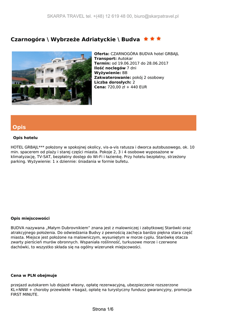SKARPA TRAVEL tel. +(48) 12 619 48 00, [email protected] Czarnogóra \ Wybrzeże Adriatyckie \ Budva Oferta: CZARNOGÓRA BUDVA hotel GRBAJL Transport: Autokar Termin: od 19.06.2017 do 28.06.2017 Ilość noclegów 7 dni Wyżywienie: BB Zakwaterowanie: pokój 2 osobowy Liczba dorosłych: 2 Cena: 720,00 zł + 440 EUR Opis Opis hotelu HOTEL GRBAJL*** położony w spokojnej okolicy, vis-a-vis ratusza i dworca autobusowego, ok. 10 min. spacerem od plaży i starej części miasta. Pokoje 2, 3 i 4 osobowe wyposażone w klimatyzację, TV-SAT, bezpłatny dostęp do Wi-Fi i łazienkę. Przy hotelu bezpłatny, strzeżony parking. Wyżywienie: 1 x dziennie: śniadania w formie bufetu. Opis miejscowości BUDVA nazywana „Małym Dubrovnikiem” znana jest z malowniczej i zabytkowej Starówki oraz atrakcyjnego położenia. Do odwiedzania Budvy z pewnością zachęca bardzo piękna stara część miasta. Miejsce jest położone na malowniczym, wysuniętym w morze cyplu. Starówkę otacza zwarty pierścień murów obronnych. Wspaniała roślinność, turkusowe morze i czerwone dachówki, to wszystko składa się na ogólny wizerunek miejscowości. Cena w PLN obejmuje przejazd autokarem lub dojazd własny, opłatę rezerwacyjną, ubezpieczenie rozszerzone KL+NNW + choroby przewlekłe +bagaż, opłatę na turystyczny fundusz gwarancyjny, promocja FIRST MINUTE. Strona 1/6 SKARPA TRAVEL tel. +(48) 12 619 48 00, [email protected] Cena w EUR obejmuje 7 lub 14 noclegów, wyżywienie 1 x dziennie. Dopłaty 1. Obowiązkowa taksa klimatyczna: osoba dorosła 1 EUR/ doba, osoby 12-18 lat płaca 50 %. 2. Do pokoju 1 osobowego 50% kwoty w EUR. 3. Do obiadokolacji 35 EUR / osoba / 7 dni. 4. Do obiadu i kolacji 70 EUR / osoba / 7 dni. Zniżki W cenie uwzględniona PROMOCJĘ FIRST MINUTE: przy dojeździe autokarem – 100 zł / osoba przy dojeździe własnym – 50 zł / osoba 1. Dziecko do 2 lat bez łóżka jako trzecia osoba w pokoju, płaci tylko 360 zł 2. Dziecko 2-7 lat jako 3 lub 4 osoba w pokoju bez łóżka płaci kwotę w zł+50% kwoty w EUR 3. Dziecko 2-10 lat jako 3,4 lub 5 osoba w pokoju z łóżkiem płaci kwotę w zł+70% kwoty EUR 4. STAŁY KLIENT: obejmuje osoby korzystające trzeci kolejny rok z naszej oferty ! Uwagi organizatora 1.Kwota w złotych płatna jest w Polsce, kwota w EUR płatna w Czarnogórze. 2.Przy dojeździe własnym i gdy potrzebna jest faktura na całość wtedy obowiązkowo równowartość kwoty w EUR płatna jest w Polsce. Kwota w EUR przeliczana jest na zł wg kursu NBP pieniądz sprzedaż z dnia ostatniej wpłaty. 3.W dniu wykupienia imprezy/ wpłaty zaliczki klient ma możliwość wykupienia dodatkowego ubezpieczenia od kosztów rezygnacji z imprezy zgodnie z Ogólnymi Warunkmi Ubezpieczenia KOSZTÓW IMPREZY TURYSTYCZNEJ w wysokości 3,3% jednak nie później niż 5 dni od dnia podpisania umowy. Strona 2/6 SKARPA TRAVEL tel. +(48) 12 619 48 00, [email protected] 4. Wycieczki fakultatywne organizowane są przez lokalne biura podróży. 5.Doba hotelowa rozpoczyna się o godz 14 i kończy o godz 9. 6. Miejsca i godziny odjazdów autokarów podano w rozkładzie jazdy 7. Potrzebny DOWÓD OSOBISTY lub PASZPORT ! Prosze pamiętać również o dokumencie dla dzieci. Uwagi przewoźnika Transport na trasach antenowych w Polsce możliwy jest mikrobusem, autokarem klasy turystycznej lub samochodem osobowym. Przy małej ilości osób organizator zastrzega sobie zmianę środka lokomocji np. na PKP, PKS lub zmianę godzin odjazdów najpóźniej na 24 godziny przed odjazdem. Trasa połączeń na terenie kraju zależy od zgłoszeń z poszczególnych miast, co może spowodować, ze przejazd nie będzie realizowany najkrótszą z możliwych tras. Na trasach poza granicami Polski transport odbywa się autokarami wyposażonymi w siedzenia uchylne, klimatyzacją, toalety, video i nagłośnienie. Przy mniejszej ilości osób, możliwość przewozu uczestników małym autobusem bez WC i mini baru. W autokarze obowiązuje całkowity zakaz palenia papierosów oraz spożywania alkoholu. Prosimy o przybycie na miejsce zbiórki najpóźniej 15 minut przed planowaną godziną odjazdu. Podane godziny wyjazdów i przyjazdów mogą ulec nieznacznemu przeniesieniu z przyczyn niezależnych od przewoźnika np.: złe warunki drogowe i atmosferyczne oraz zwiększanie ruchu na drogach w szczycie sezonu letniego itp. Miejsca w autokarze są przydzielane w kolejności podpisania umowy, a klienci o miejscach informowani są przez pilota na miejscu zbiórki. Osoby korzystają z samego przejazdu, powinny obowiązkowo ubezpieczyć się na czas pobytu. Przewoźnik gwarantuje tylko ubezpieczenie komunikacyjne na czas przejazdu. UWAGA: dla osób dojeżdżających do Krakowa we własnym zakresie SKARPA TRAVEL może także zarezerwować nocleg w hotelu, pensjonacie w cenie od 80 zł. Ramowy program imprezy (klasyczny 7 noclegowy) 1 dzień Wyjazd z Polski zgodnie z rozkładem jazdy, przejazd przez Słowację (dla chętnych posiłek w cenie ok.5 EUR), Węgry i Bośnię. 2 dzień Dalsza jazda przez Chorwację i Czarnogórę, przyjazd na miejsce wypoczynku ok. godz. południowych, zakwaterowanie od 14, obiadokolacja, nocleg. 3 – 8 dzień WYPOCZYNEK. Możliwość wykupienia wycieczek fakultatywnych. 9 dzień Po śniadaniu wykwaterowanie z pokoi do godz. 9, czas wolny, wyjazd w drogę powrotną ok. godz. południowych. Przejazd przez Czarnogórę, Bośnię i Chorwację. 10 dzień Przejazd przez Węgry i Słowację (dla chętnych posiłek w cenie ok.5 EUR). Przyjazd do Polski, orientacyjny przyjazd do Krakowa ok. godziny 17. Praktyczne informacje Najbliższa placówka dyplomatyczna: Ambasada RPul.Kozaracka 79, 81000 Podgorica tel.(00382) 20 608320, tel dyżurny (00382) 20608321 fax (00382) 20 658 581 Strona 3/6 SKARPA TRAVEL tel. +(48) 12 619 48 00, [email protected] Obowiązująca waluta: EUR Wycieczki fakultatywne organizowane przez lokalne 1.REJS STATKIEM PO ZATOCE KOTORSKIEJ ok.30 EUR 2. DUBROWNIK ok. 35 EUR 3.CETINJE-LOVCEN-NJE