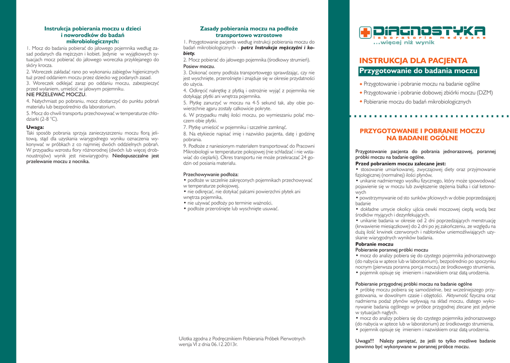 Instrukcja pobierania moczu u dzieci i noworodków do badań mikrobiologicznych: 1. Mocz do badania pobierać do jałowego pojemnika według zasad podanych dla mężczyzn i kobiet. Jedynie w wyjątkowych sytuacjach mocz pobierać do jałowego woreczka przyklejanego do skóry krocza. 2. Woreczek zakładać rano po wykonaniu zabiegów higienicznych tuż przed oddaniem moczu przez dziecko wg podanych zasad. 3. Woreczek odklejać zaraz po oddaniu moczu, zabezpieczyć przed wylaniem, umieścić w jałowym pojemniku. NIE PRZELEWAĆ MOCZU. 4. Natychmiast po pobraniu, mocz dostarczyć do punktu pobrań materiału lub bezpośrednio dla laboratorium. 5. Mocz do chwili transportu przechowywać w temperaturze chłodziarki (2-8 °C). Uwaga: Taki sposób pobrania sprzyja zanieczyszczeniu moczu florą jelitową, stąd dla uzyskania wiarygodnego wyniku oznaczenia wykonywać w próbkach z co najmniej dwóch oddzielnych pobrań. W przypadku wzrostu flory różnorodnej (dwóch lub więcej drobnoustrojów) wynik jest niewiarygodny. Niedopuszczalne jest przelewanie moczu z nocnika. Zasady pobierania moczu na podłoże transportowo wzrostowe 1. Przygotowanie pacjenta według instrukcji pobierania moczu do badań mikrobiologicznych - patrz Instrukcja mężczyźni i kobiety. 2. Mocz pobierać do jałowego pojemnika (środkowy strumień). Posiew moczu. 3. Dokonać oceny podłoża transportowego sprawdzając, czy nie jest wyschnięte, przerośnięte i znajduje się w okresie przydatności do użycia. 4. Odkręcić nakrętkę z płytką i ostrożnie wyjąć z pojemnika nie dotykając płytki ani wnętrza pojemnika. 5. Płytkę zanurzyć w moczu na 4-5 sekund tak, aby obie powierzchnie agaru zostały całkowicie pokryte. 6. W przypadku małej ilości moczu, po wymieszaniu polać moczem obie płytki. 7. Płytkę umieścić w pojemniku i szczelnie zamknąć. 8. Na etykiecie napisać imię i nazwisko pacjenta, datę i godzinę pobrania. 9. Podłoże z naniesionym materiałem transportować do Pracowni Mikrobiologii w temperaturze pokojowej (nie schładzać i nie wstawiać do cieplarki). Okres transportu nie może przekraczać 24 godzin od posiania materiału. Przechowywanie podłoża: • podłoże w szczelnie zakręconych pojemnikach przechowywać w temperaturze pokojowej, • nie odkręcać, nie dotykać palcami powierzchni płytek ani wnętrza pojemnika, • nie używać podłoży po terminie ważności, • podłoże przerośnięte lub wyschnięte usuwać. INSTRUKCJA DLA PACJENTA Przygotowanie do badania moczu Przygotowanie i pobranie moczu na badanie ogólne Przygotowanie i pobranie dobowej zbiórki moczu (DZM) Pobieranie moczu do badań mikrobiologicznych PRZYGOTOWANIE I POBRANIE MOCZU NA BADANIE OGÓLNE Przygotowanie pacjenta do pobrania jednorazowej, porannej próbki moczu na badanie ogólne. Przed pobraniem moczu zalecane jest: • stosowanie umiarkowanej, zwyczajowej diety oraz przyjmowanie fizjologicznej (normalnej) ilości płynów, • unikanie nadmiernego wysiłku fizycznego, który może spowodować pojawienie się w moczu lub zwiększenie stężenia białka i ciał ketonowych • powstrzymywanie od sto¬sunków płciowych w dobie poprzedzającej badanie • dokładne umycie okolicy ujścia cewki moczowej ciepłą wodą bez środków myjących i dezynfekujących, • unikanie badania w okresie od 2 dni poprzedzających menstruację (krwawienie miesiączkowe) do 2 dni po jej zakończeniu, ze względu na dużą ilość krwinek czerwonych i nabłonków uniemożliwiających uzyskanie wiarygodnych wyników badania. Pobranie moczu Pobieranie porannej próbki moczu • mocz do analizy pobiera się do czystego pojemnika jednorazowego (do nabycia w aptece lub w laboratorium), bezpośrednio po spoczynku nocnym (pierwsza poranna porcja moczu) ze środkowego strumienia, • pojemnik opisuje się imieniem i nazwiskiem oraz datą urodzenia. Pobieranie przygodnej próbki moczu na badanie ogólne • próbkę moczu pobiera się samodzielnie, bez wcześniejszego przygotowania, w dowolnym czasie i objętości. Aktywność fizyczna oraz nadmierna podaż płynów wpływają na skład moczu, dlatego wykonywanie badania ogólnego w próbce przygodnej zlecane jest jedynie w sytuacjach nagłych. • mocz do analizy pobiera się do czystego pojemnika jednorazowego (do nabycia w aptece lub w laboratorium) ze środkowego strumienia, • pojemnik opisuje się imieniem i nazwiskiem oraz datą urodzenia. Ulotka zgodna z Podręcznikiem Pobierania Próbek Pierwotnych wersja VI z dnia 06.12.2013r. Uwaga!!! Należy pamiętać, że jeśli to tylko możliwe badanie powinno być wykonywane w porannej próbce moczu. Przygotowanie noworodka lub małego dziecka do pobrania jednorazowej porannej próbki moczu na badanie ogólne • osoba przygotowująca się do pobrania próbki moczu od noworodka lub małego dziecka powinna zaopatrzyć się w jednorazowe woreczki do zbierania moczu (apteka), • po uprzednim umyciu i wysuszeniu okolic krocza dziecka należy przykleić woreczek do skóry, • po uzyskaniu odpowiedniej ilości moczu woreczek jak najszybciej odkleić, • mocz w woreczku dostarczyć do laboratorium. Transport moczu: Próbkę moczu dostarczyć jak najszybciej do laboratorium. Zaleca się, aby transport moczu w temperaturze pokojowej trwał krócej niż 2 godziny. W przypadku utrzymani próbki temperaturze 2-8 °C czas transportu może wydłużyć się do 4 godzin. PRZYGOTOWANIE I POBRANIE DOBOWEJ ZBIÓRKI MOCZU Przed przystąpieniem do dobowej zbiórki moczu: • przygotować czysty, 2-3 litrowy pojemnik • w laboratorium uzyskać informację o ewentualnej konieczności dodanie do pojemnika na zbierany mocz odpowiedniego stabilizatora i w razie konieczności zaopatrzyć się w taki stabilizator. • w dniu rozpoczęcia zbiórki dobowej pierwszą poranną porcję moczu należy oddać do muszli klozetowej. Przeprowadzanie dobowej zbiórki moczu • zbiórkę przeprowadza się w okresie 24 godzin (12 godzin w przy¬padku klirensu kr