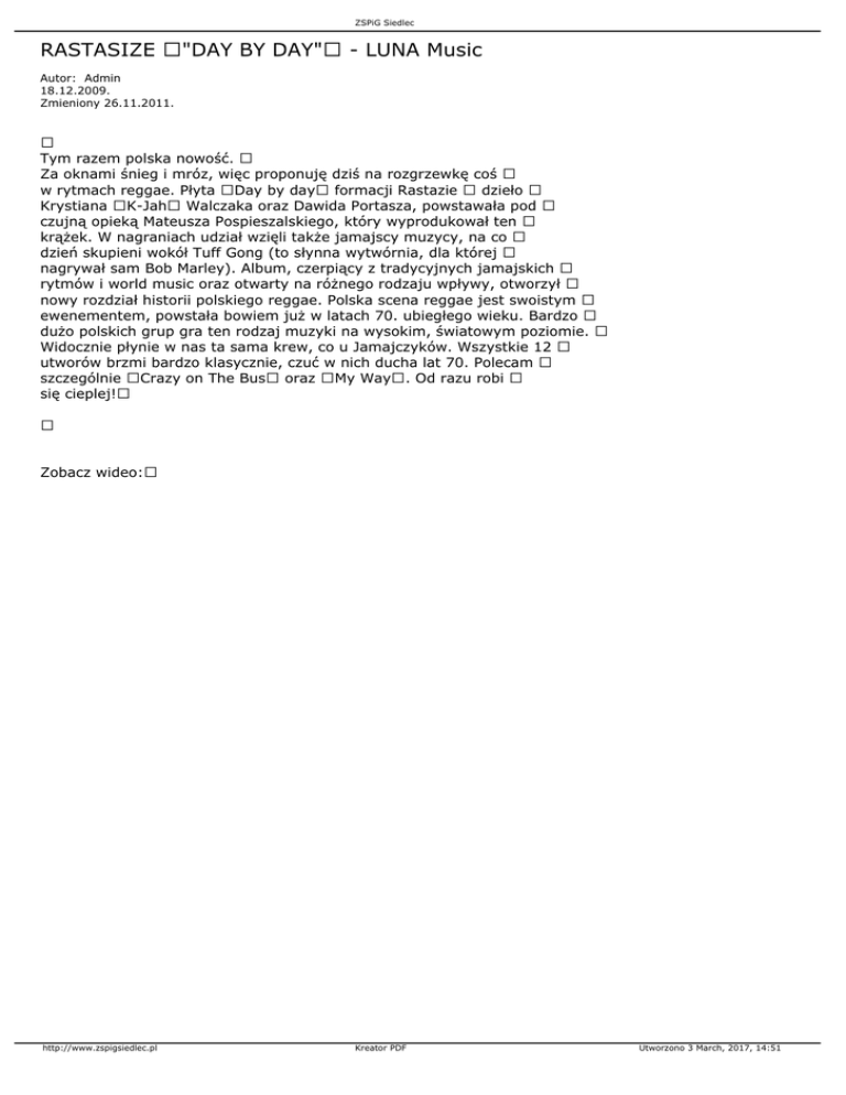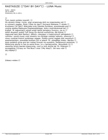 ZSPiG Siedlec RASTASIZE "DAY BY DAY" - LUNA Music Autor: Admin 18.12.2009. Zmieniony 26.11.2011. Tym razem polska nowość. Za oknami śnieg i mróz, więc proponuję dziś na rozgrzewkę coś w rytmach reggae. Płyta Day by day formacji Rastazie dzieło Krystiana K-Jah Walczaka oraz Dawida Portasza, powstawała pod czujną opieką Mateusza Pospieszalskiego, który wyprodukował ten krążek. W nagraniach udział wzięli także jamajscy muzycy, na co dzień skupieni wokół Tuff Gong (to słynna wytwórnia, dla której nagrywał sam Bob Marley). Album, czerpiący z tradycyjnych jamajskich rytmów i world music oraz otwarty na różnego rodzaju wpływy, otworzył nowy rozdział historii polskiego reggae. Polska scena reggae jest swoistym ewenementem, powstała bowiem już w latach 70. ubiegłego wieku. Bardzo dużo polskich grup gra ten rodzaj muzyki na wysokim, światowym poziomie. Widocznie płynie w nas ta sama krew, co u Jamajczyków. Wszystkie 12 utworów brzmi bardzo klasycznie, czuć w nich ducha lat 70. Polecam szczególnie Crazy on The Bus oraz My Way. Od razu robi się cieplej! Zobacz wideo: http://www.zspigsiedlec.pl Kreator PDF Utworzono 3 March, 2017, 14:51