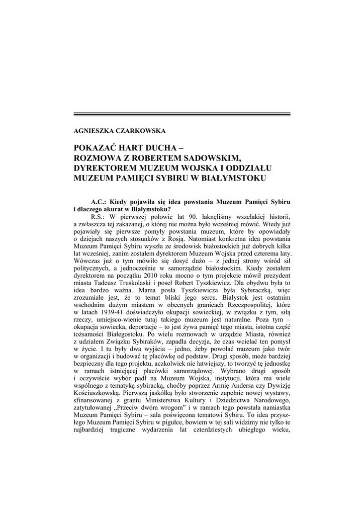 AGNIESZKA CZARKOWSKA POKAZAĆ HART DUCHA – ROZMOWA Z ROBERTEM SADOWSKIM, DYREKTOREM MUZEUM WOJSKA I ODDZIAŁU MUZEUM PAMIĘCI SYBIRU W BIAŁYMSTOKU A.C.: Kiedy pojawiła się idea powstania Muzeum Pamięci Sybiru i dlaczego akurat w Białymstoku? R.S.: W pierwszej połowie lat 90. łaknęliśmy wszelakiej historii, a zwłaszcza tej zakazanej, o której nie można było wcześniej mówić. Wtedy już pojawiały się pierwsze pomyły powstania muzeum, które by opowiadały o dziejach naszych stosunków z Rosją. Natomiast konkretna idea powstania Muzeum Pamięci Sybiru wyszła ze środowisk białostockich już dobrych kilka lat wcześniej, zanim zostałem dyrektorem Muzeum Wojska przed czterema laty. Wówczas już o tym mówiło się dosyć dużo – z jednej strony wśród sił politycznych, a jednocześnie w samorządzie białostockim. Kiedy zostałem dyrektorem na początku 2010 roku mocno o tym projekcie mówił prezydent miasta Tadeusz Truskolaski i poseł Robert Tyszkiewicz. Dla obydwu była to idea bardzo ważna. Mama posła Tyszkiewicza była Sybiraczką, więc zrozumiałe jest, że to temat bliski jego sercu. Białystok jest ostatnim wschodnim dużym miastem w obecnych granicach Rzeczpospolitej, które w latach 1939-41 doświadczyło okupacji sowieckiej, w związku z tym, siłą rzeczy, umiejsco-wienie tutaj takiego muzeum jest naturalne. Poza tym – okupacja sowiecka, deportacje – to jest żywa pamięć tego miasta, istotna część tożsamości Białegostoku. Po wielu rozmowach w urzędzie Miasta, również z udziałem Związku Sybiraków, zapadła decyzja, że czas wcielać ten pomysł w życie. I tu były dwa wyjścia – jedno, żeby powołać muzeum jako twór w organizacji i budować tę placówkę od podstaw. Drugi sposób, może bardziej bezpieczny dla tego projektu, aczkolwiek nie łatwiejszy, to tworzyć tę jednostkę w ramach istniejącej placówki samorządowej. Wybrano drugi sposób i oczywiście wybór padł na Muzeum Wojska, instytucji, która ma wiele wspólnego z tematyką sybiracką, choćby poprzez Armię Andersa czy Dywizję Kościuszkowską. Pierwszą jaskółką było stworzenie zupełnie nowej wystawy, sfinansowanej z grantu Ministerstwa Kultury i Dziedzictwa Narodowego, zatytułowanej „Przeciw dwóm wrogom” i w ramach tego powstała namiastka Muzeum Pamięci Sybiru – sala poświęcona tematowi Sybiru. To idea przyszłego Muzeum Pamięci Sybiru w pigułce, bowiem w tej sali widzimy nie tylko te najbardziej tragiczne wydarzenia lat czterdziestych ubiegłego wieku, 4 AGNIESZKA CZARKOWSKA ale również proces wcześniejszych zesłań, aż do roku 1956, czyli fali ostatnich powrotów z deportacji. Posługujemy się określeniem Sybir, tak też brzmi nazwa muzeum. Jak rozumieć to pojęcie? Sybir jako idea, oczywiście, nie chodzi tu o geograficzne określenie Syberii. Sybir jako miejsce zesłań, deportacji, ale i dobrowolnych wyjazdów. Geograficznie to rejon bardzo szeroki – i sama Syberia właściwa, i Kazachstan, i Daleki Wschód, jak również europejska część Rosji czy Związku Sowieckiego. Zakres chronologiczny szeroki – od Jermaka, historycznego zdobywcy Syberii dla państwa moskiewskiego w drugiej połowie XVI wieku, poprzez powolną wewnętrzną kolonizację tych ziem i oczywiście udział w tym procesie Polaków. Następnie już z dużym naciskiem na koniec wieku XVIII, czyli wywózki z okresu insurekcji kościuszkowskiej, potem oczywiście wiek XIX i deportacje popowstaniowe. Niesamowicie ciekawy wątek, który musi się na stałej ekspozycji znaleźć, to dobrowolne przesiedlenia na przełomie XIX i XX wieku. Takimi sztandarowymi przykładami są powstałe wówczas polskie wsie jak Wierszyna czy syberyjski Białystok, które istnieją do dziś. Ważnym elementem będzie też praca na Syberii polskich naukowców, badaczy przyrody, inżynierów, budowniczych mostów i dróg oraz tych wszystkich, którzy pojechali tam robić kariery finansowe. Takich ludzi było sporo. Może to stanowić pewne zaskoczenie dla zwiedzających, bo większość będzie nastawiona tylko na martyrologię. To też oczywiście pokażemy, nie chcę by mnie źle zrozumiano, że będzie tylko piękna, wspaniała, wyidealizowana Syberia. Chcemy pokazać różne odcienie Sybiru – i duża część wystawy poświęcona będzie tragicznym deportacjom lat czterdziestych, jak i czystkom z lat trzydziestych, które dotknęły Polaków za granicą ryską. Ale obok tych tragicznych okresów był też czas, kiedy Syberia była swoistym eldorado, dzikim wschodem, ziemią obiecaną i Polacy wyjeżdżali tam z własnej woli w poszukiwaniu lepszego życia. Będzie też wątek poświęcony geografii, etnografii, rdzennym ludom Syberii, bo pamiętajmy, że to co dla zesłańców było krainą przeklętą, to dla Buriatów, Jakutów czy Kazachów było ziemią ojczystą. Nasza wystawa będzie piętnowała system carski czy sowiecki aparat represji, ale oddamy honor zwykłym ludziom, którzy – a przewija się to w setkach relacji Sybiraków - bardzo często nieśli pomoc naszym zesłańcom. Czasami bez ich pomocy przeżycie byłoby niemożliwe. Jest idea, zaczyna być wcielana w życie i pojawia się pytanie – dla kogo? Kto ma być głównym adresatem tej placówki? Najprostsza odpowiedź, jaka się ciśnie na usta, to oczywiście świadkowie wydarzeń, czyli Sybiracy. Natomiast to byłoby zbyt duże uproszczenie. Mówiąc górnolotnie – oczywiście wszyscy Polacy. Ale jak ja o tym myślę, to widzę przede wszystkim ludzi młodych. Chciałbym, żeby zacząć o tym Sybirze mówić do młodych i mówić w sposób trochę inny. Rozumiem, dlaczego tak się stało, że Sybir jest dziś kojarzony jako jedna wielka trauma narodowa. Mam na myśli przekaz powszechny, nie mówię o specjalistach, którzy się tym zajmują. Dla przeciętnego Polaka Sybir to łańcuchy, kraty i powrozy. Kapitalnym przykładem takiego podejścia był konkurs, który ogłosiliśmy w zeszłym roku na 