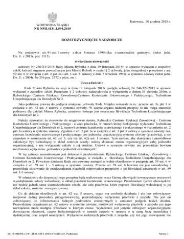 Katowice, 30 grudnia 2015 r. WOJEWODA ŚLĄSKI NR NPII.4131.1.594.2015 ROZSTRZYGNIĘCIE NADZORCZE Na podstawie art. 91 ust. 1 ustawy z dnia 8 marca 1990 roku o samorządzie gminnym (tekst jedn. Dz. U. z 2015r. poz. 1515) stwierdzam nieważność uchwały Nr 246/XV/2015 Rady Miasta Rybnika z dnia 19 listopada 2015r. w sprawie wyłączeń z zespołów szkół, których organem prowadzącym jest Miasto Rybnik w części § 2 uchwały, jako niezgodnej z przepisem z art. 59 ust. 6 w związku z art. 2 pkt 3a i art. 3 ust. 3 ustawy z dnia 7 września 1991r. o systemie oświaty (tekst jedn. Dz. U. z 2004r. Nr 256 poz. 2572 z późn. zm.). Uzasadnienie Rada Miasta Rybnika na sesji w dniu 19 listopada 2015r. podjęła uchwałę Nr 246/XV/2015 w sprawie wyłączeń z zespołów szkół. Przepisem § 2 uchwały zadecydowała o wyłączeniu z dniem 31 sierpnia 2016r. z Rybnickiego Centrum Edukacji Zawodowej-Centrum Kształcenia Ustawicznego i Praktycznego, Technikum Uzupełniającego dla Dorosłych Nr 2. Jako podstawę prawną do podjęcia niniejszej uchwały Rada Miejska wskazała m.in.: przepis art. 5c pkt 1 w związku z art. 62 ust. 5 ustawy o systemie oświaty. W ocenie organu nadzoru przepisy te nie mogą stanowić podstawy dla działań Miasta Rybnika, zamiarem którego jest ostateczna likwidacja Technikum Uzupełniającego dla Dorosłych nr 2. Należy zauważyć, że stosownie do uregulowań statutu, Rybnickie Centrum Edukacji Zawodowej - Centrum Kształcenia Ustawicznego i Praktycznego - a więc placówka, w ramach której funkcjonuje wyłączane Technikum Uzupełniającego dla Dorosłych nr 2, stanowi centrum kształcenia ustawicznego i praktycznego w rozumieniu art. 2 pkt 3a ustawy o systemie oświaty. Zgodnie z art. 2 pkt 3a w związku z art. 3 pkt 3 ustawy o systemie oświaty zaś, centrum kształcenia ustawicznego i praktycznego jest jednostką organizacyjną systemu oświaty (placówką), a nie zespołem w rozumieniu art. 62 ust. 5, czy też art. 62a ust. 1 ustawy. Tym samym, aby skutecznie i prawidłowo zakończyć byt wchodzącej w skład centrum szkoły, należy dokonać zmian organizacyjnych całej jednostki organizacyjnej, a nie wyłączenia szkoły z jej struktur. Ustawa o systemie oświaty nie przewiduje bowiem możliwości wyłączania „jednostek z jednostek oświatowych”. W tej sytuacji uzasadnionym jest dokonanie przekształcenia Rybnickiego Centrum Edukacji Zawodowej Centrum Kształcenia Ustawicznego i Praktycznego, w związku z likwidacją Technikum Uzupełniającego dla Dorosłych nr 2. Powyższe działania Rady zaś powinny nastąpić w trybie określonym w przepisie art. 59 ust. 6 w związku z art. 59 ust. 1 – 5 ustawy o systemie oświaty. Przepis art. 59 ust. 6 bowiem nie jest samodzielny i przewiduje stosowanie do przekształcenia placówki odpowiednio przepisów o jej likwidacji zawartych w art. 59 ust. 1-5 ustawy. W odniesieniu do dyspozycji tego przepisu będą realizowane przez Gminę obowiązki towarzyszące procesowi wyodrębnienia szkoły wchodzącej w skład placówki kształcenia ustawicznego. Przedmiotem tychże obowiązków nie będzie jednak sama usamodzielniana szkoła, ale cała placówka, która poprzez likwidację wchodzącej w jej skład szkoły, zostanie zreorganizowana. Co do działań określonych w art. 62 ust. 5 ustawy, organ ma swobodę działania i nie jest zobowiązany inicjować żadnej procedury przygotowawczej, poprzedzającej wyłączenie placówki z zespołu. Nie jest on zobowiązany do informowania żadnych podmiotów zewnętrznych o zamiarze podjęcia takich działań. Przewidziana przepisami art. 62 ustawy o systemie oświaty, możliwość wyłączenia placówki z zespołu czy jego rozwiązania może nastąpić właściwie w każdym czasie. Wyłączenie jest jedynie zabiegiem organizacyjnym, dotyczącym placówek, często funkcjonujących w ramach zespołu w oparciu o tę samą bazę materialną i dydaktyczną oraz zespół nauczycieli. Wyłączenie niektórych placówek z zespołu, czy też jego rozwiązanie nie Id: 1F58B09E-CF81-4E96-83F3-D9DDF161D3D5. Podpisany Strona 1 mają również znaczenia dla ich istnienia, poza przeprowadzanymi działaniami administracyjno-technicznymi. Przepis art. 62 ust. 5 ustawy o systemie oświaty jednoznacznie wskazuje, że przy rozwiązywaniu zespołu szkół (wyłączaniu szkoły z zespołu) nie stosuje się nie tylko przepisów art. 59 (dotyczącego likwidacji szkoły), ale również art. 58 cyt. ustawy (m.in. w zakresie aktu założycielskiego, nadawania statutu). Ustawodawca zrezygnował też z uzyskiwania w tym zakresie zgody kuratora oświaty. Jednakże, zdaniem organu nadzoru, w przedmiotowej sprawie przepisy te nie znajdą zastosowania, gdyż Rybnickiego Centrum Edukacji Zawodowej-Centrum Kształcenia Ustawicznego i Praktycznego jest placówką, a nie zespołem szkół. Należy zatem kategorycznie stwierdzić, że tryby przewidziane w art. 59 i art. 62 ustawy regulują zupełnie inne kwestie. Każdy z tych przepisów dotyczy innej sytuacji i przewiduje wdrażanie odmiennych procedur. Tym samym nie jest możliwe ani dopuszczalne utożsamianie tych instytucji prawnych i posługiwanie się zamiennie obu trybami reorganizacyjnymi. Mając na uwadze powyższe należy stwierdzić, że przedmiotowa uchwała w zakresie, w jakim nieprawidłowo zastosowała tryb prowadzący do zakończeniu bytu organizacyjnego Technikum Uzupełniającego dla Dorosłych Nr 2 istotnie naruszyła prawo. Tym samym stwierdzenie nieważności przedmiotowej uchwały jest uzasadnione i konieczne. Stwierdzenie nieważności uchwały, zgodnie z art. 92 ust. 1 ustawy o samorządzie gminnym, wstrzymuje jej wykonanie z mocy prawa w zakresie objętym stwierdzeniem nieważności, z dniem doręczenia rozstrzygnięcia nadzorczego. Na niniejsze rozstrzygnięcie nadzorcze służy skarga do Wojewódzkiego Sądu Administracyjnego w Gliwicach, za pośrednictwem Wojewody Śląskiego, w terminie 30 dni od dnia doręczenia rozstrzygnięcia. 