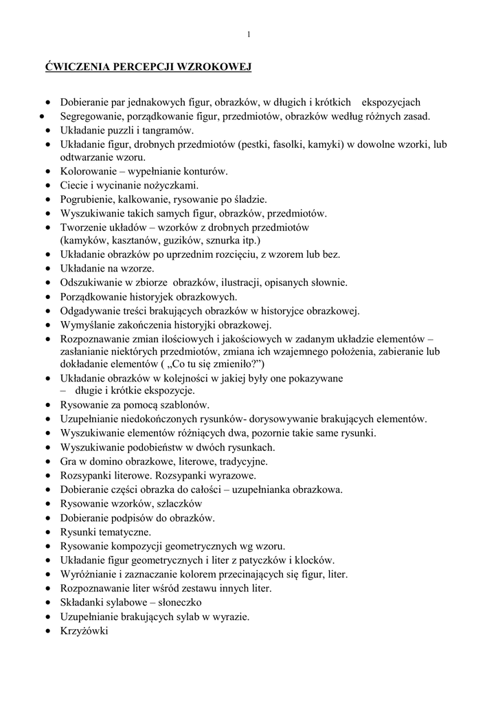 1 ĆWICZENIA PERCEPCJI WZROKOWEJ Dobieranie par jednakowych figur, obrazków, w długich i krótkich ekspozycjach Segregowanie, porządkowanie figur, przedmiotów, obrazków według różnych zasad. Układanie puzzli i tangramów. Układanie figur, drobnych przedmiotów (pestki, fasolki, kamyki) w dowolne wzorki, lub odtwarzanie wzoru. Kolorowanie – wypełnianie konturów. Ciecie i wycinanie nożyczkami. Pogrubienie, kalkowanie, rysowanie po śladzie. Wyszukiwanie takich samych figur, obrazków, przedmiotów. Tworzenie układów – wzorków z drobnych przedmiotów (kamyków, kasztanów, guzików, sznurka itp.) Układanie obrazków po uprzednim rozcięciu, z wzorem lub bez. Układanie na wzorze. Odszukiwanie w zbiorze obrazków, ilustracji, opisanych słownie. Porządkowanie historyjek obrazkowych. Odgadywanie treści brakujących obrazków w historyjce obrazkowej. Wymyślanie zakończenia historyjki obrazkowej. Rozpoznawanie zmian ilościowych i jakościowych w zadanym układzie elementów – zasłanianie niektórych przedmiotów, zmiana ich wzajemnego położenia, zabieranie lub dokładanie elementów ( „Co tu się zmieniło?”) Układanie obrazków w kolejności w jakiej były one pokazywane – długie i krótkie ekspozycje. Rysowanie za pomocą szablonów. Uzupełnianie niedokończonych rysunków- dorysowywanie brakujących elementów. Wyszukiwanie elementów różniących dwa, pozornie takie same rysunki. Wyszukiwanie podobieństw w dwóch rysunkach. Gra w domino obrazkowe, literowe, tradycyjne. Rozsypanki literowe. Rozsypanki wyrazowe. Dobieranie części obrazka do całości – uzupełnianka obrazkowa. Rysowanie wzorków, szlaczków Dobieranie podpisów do obrazków. Rysunki tematyczne. Rysowanie kompozycji geometrycznych wg wzoru. Układanie figur geometrycznych i liter z patyczków i klocków. Wyróżnianie i zaznaczanie kolorem przecinających się figur, liter. Rozpoznawanie liter wśród zestawu innych liter. Składanki sylabowe – słoneczko Uzupełnianie brakujących sylab w wyrazie. Krzyżówki 2 Rebusy. Szukanie krótszych wyrazów w dłuższych. Czytanie wyrazów wspak. Wyszukiwanie wyrazów ukrytych w tabelach literowych. Dyktanda graficzne. Rysowanie na siatce kwadratowej. Rozpoznawanie liter, wyrazów w krótkich, lub dłuższych ekspozycjach. Gry typu „memory” – rozpoznawanie par odpowiadających sobie elementów, ćwiczenie to doskonali również pamięć wzrokową. Wyszukiwanie w tekście, np. z gazety, określonej litery, lub grupy liter i zakreślenie jej kredką. Wyszukiwanie i wycinanie z tytułów z gazet tej samej litery drukowanej różnymi czcionkami. Odtwarzanie z pamięci eksponowanych przedmiotów i wskazywanie miejsca, w którym się znajdowały. Rozpoznawanie płaskich figur : koło, kwadrat, prostokąt, trójkąt. Dzielenie większej figury na mniejsze elementy i układanie nowej całości. Odtwarzanie kształtów. Dorysowywanie brakujących elementów na obrazkach. Układanie różnych kompozycji i budowli wg wzoru ; klocki. mozaiki geometryczne, układanki. Układanie pociętych na części liter wg wzoru. Segregowanie liter. Szukanie w wyrazach, w tekstach określonej litery. Wycinanie, wydzieranie, lepienie liter, nazywanie ich. Układanie wyrazów z rozsypanek sylabowych, literowych. Dobieranie podpisów do obrazków. Łańcuchy sylabowe Wyszukiwanie wyrazów ukrytych w ciągach literowych