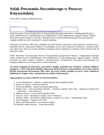 Szlak Powstania Styczniowego w Puszczy Knyszyńskiej 14.05.2014 | Katarzyna Błahuszewska Szlakiem Powstania Styczniowego.JPG Szlak Powstania Styczniowego Puszczy Knyszyńskiej przygotowali leśnicy z Regionalnej Dyrekcji Lasów Państwowych w Białymstoku oraz Nadleśnictwa Czarna Białostocka, Supraśl, Żednia i Waliły. Prowadzi on przez miejsca związane z dramatycznymi wydarzeniami Powstania Styczniowego nie omijając jednak też tych związanych z innymi epokami. Powstanie Styczniowe 1863 roku, podobnie jak wiele innych wydarzeń w naszej historii, związane jest w ogromnej mierze z obszarami leśnymi. Nie poddając się tak łatwo naporowi cywilizacji i zmianom jakie ona niesie lasy stały się swoistą skarbnicą pamiątek dawno minionych wydarzeń, które przechowały do naszych czasów. Szlak Powstania Styczniowego Puszczy Knyszyńskiej przygotowali leśnicy z Regionalnej Dyrekcji Lasów Państwowych w Białymstoku oraz Nadleśnictwa Czarna Białostocka, Supraśl, Żednia i Waliły. Prowadzi on przez miejsca związane z dramatycznymi wydarzeniami Powstania Styczniowego nie omijając jednak też tych związanych z innymi epokami. Na trasie znajdują się pola bitew, powstańcze mogiły, pomniki oraz cmentarz wojenny żołnierzy poległych w 1831 roku pod Sokołdą, ekspozycja historii Puszczy Knyszyńskiej oraz Leśna Galeria Rzeźby poświęcona Powstańcom 1863 roku. Na trasie ścieżki znajduje się m.in. wieża widokowa, kładka przez bagna, wiaty i zadaszenia oraz tablice informacyjne. Opis punktów na ścieżce (MAPA W ZAŁĄCZNIKU): 1. 2. 3. 4. Czarna Białostocka – historia i współczesność puszczańskiej kolejki Rezerwat Taboły – Góra Powstańców Rezerwat Budzisk – miejsce powstańczego obozu Kopna Góra – dwie powstańcze historie – cmentarz wojenny 1831 roku – ekspozycja historyczna – arboretum – wiata rekreacyj 5. Miejsce straceń – Leśna Galeria Rzeźby 1863 6. Góra św. Jana – powstańcza mogiła, wieża widokowa 7. Królowy Most – powstańczy punkt zborny w kaplicy św. Anny – Napoleoński Trakt 8. Wieś Popówka – tragiczny rok 1943 9. Bitwa pod Piereciosami – powstańcza mogiła 10.Zbiornik wodny Wyżary – wiata rekreacyjna Zapraszamy do pobierania aplikacji mobilnej, dzięki której będą Państwo mogli Podążać Szlakiem Powstania Styczniowego zagubionym w dziewiczych lasach Puszczy Knyszyńskiej, poznać losy powstańców, którzy w puszczańskich lasach szukali swojej drogi do wolnej ojczyzny. Aplikacja działa na telefonach komórkowych z systemem operacyjnym Adnroid. Jest to mobilny przewodnik prowadzący po ścieżce Szlakiem Powstania Styczniowego Puszczy Knyszyńskiej. Przy pierwszym uruchomieniu nastąpi pobranie aktualnych informacji o ścieżce oraz znajdujących się na niej punktach (min. kilkanaście MB). Dzięki temu podczas korzystania z aplikacji nie będzie potrzebne połączenie z internetem. Mapa Szlaku Powstania Styczniowego w Puszczy Knyszyńskiej na telefony komórkowe z systemem operacyjnym Android do pobrania, hasło do wyszukiwania: "szlak powstania". Ścieżka przeznaczona jest dla turystyki pieszej i rowerowej. Jej długość wynosi 71km. Można ją pokonać w całości w ciągu kilku dni jak też odwiedzić tylko wybrane, interesujące turystę fragmenty lub punkty.