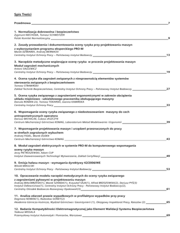 Spis Treści Przedmowa 7 1. Normalizacja dobrowolna i bezpieczeństwo Zygmunt NIECHODA, Tomasz SCHWEITZER Polski Komitet Normalizacyjny 9 2. Zasady prowadzenia i dokumentowania oceny ryzyka przy projektowaniu maszyn z wykorzystaniem programu eksperckiego PRO-M Marek DŹWIAREK, Andrzej BIERNACKI Centralny Instytut Ochrony Pracy – Państwowy instytut Badawczy 13 3. Narzędzie metodyczne wspierające ocenę ryzyka w procesie projektowania maszyn Moduł zagrożeń mechanicznych Antoni SAULEWICZ Centralny Instytut Ochrony Pracy – Państwowy Instytut Badawczy 19 4. Ocena ryzyka dla zagrożeń związanych z niesprawnością elementów systemów sterowania związanych z bezpieczeństwem Tomasz STRAWIŃSKI Zakład Techniki Bezpieczeństwa, Centralny Instytut Ochrony Pracy – Państwowy Instytut Badawczy 27 5. Ocena ryzyka związanego z zagrożeniami ergonomicznymi w zakresie obciążenia układu mięśniowo - szkieletowego pracownika obsługującego maszyny Danuta ROMAN-LIU, Tomasz TOKARSKI, Joanna KAMIŃSKA Centralny Instytut Ochrony Pracy 33 6. Wspomaganie oceny ryzyka związanego z niedostosowaniem maszyny do cech antropometrycznych operatora Dariusz MICHALAK, Łukasz JASZCZYK Centrum Mechanizacji Górnictwa KOMAG, Laboratorium Metod Modelowania i Ergonomii 39 7. Wspomaganie projektowania maszyn i urządzeń przeznaczonych do pracy w strefach zagrożonych wybuchem Andrzej FIGIEL, Marek DUDEK Centrum Mechanizacji Górnictwa KOMAG 43 8. Moduł zagrożeń elektrycznych w systemie PRO-M do komputerowego wspomagania oceny ryzyka maszyn Jerzy PIETRUSZEWSKI, Adam CUP Instytut Zaawansowanych Technologii Wytwarzania, Zakład Certyfikacji 49 9. Emisja hałasu maszyn - wymagania dyrektywy 42/2006/WE Witold MIKULSKI Centralny Instytut Ochrony Pracy - Państwowy Instytut Badawczy 53 10. Opracowanie modelu narzędzi metodycznych do oceny ryzyka związanego z zagrożeniami pyłowymi w projektowaniu maszyn Andrzej BIAŁOBRZESKI(1), Marek SZANDA(1), Krzysztof SAJA(1), Alfred BRZOZOWSKI(2), Dariusz PYŚ(3) Instytut Odlewnictwa(1), Centralny Instytut Ochrony Pracy - Państwowy Instytut Badawczy(2), Centralny Ośrodek Badawczo-Rozwojowy Opakowań(3) 61 11. Analiza zdarzeń prawie wypadkowych w profilaktyce wypadków przy pracy Dagmara NOWAK(1), Radosław GONET(2) Akademia Górniczo-Hutnicza, Wydział Górnictwa i Geoinżynierii (1), Okręgowy Inspektorat Pracy, Rzeszów (2) 65 12. Badanie Kompatybilności Elektromagnetycznej jako Element Walidacji Systemu Bezpieczeństwa Tadeusz MISSALA Przemysłowy Instytut Automatyki i Pomiarów, Warszawa 69 13. Oszacowanie niezawodności elektronicznych układów bezpieczeństwa funkcjonalnego wpływ doboru komponentów elektronicznych Janusz SAMUŁA Urząd Dozoru Technicznego 75 14. Ryzyko w działalności przedsiębiorstw przemysłowych Grażyna WIETESKA Katedra Zarządzania Jakością, Uniwersytet Łódzki 81 15. Certyfikowany system zarządzania bezpieczeństwem i higieną pracy – wartość dodana czy zbędny koszt? Anna KRAWCZYK Uniwersytet Łódzki, Wydział Zarządzania 91 16. System awaryjnego odstawienia instalacji na przykładzie morskiej platformy wydobywczej Marek KRYGER, Kazimierz KOSMOWSKI Politechnika Gdańska, Wydział Elektrotechniki i Automatyki, Katedra Automatyki 95 17. Zarządzanie bezpieczeństwem informacji – przegląd aktualnych standardów i metodyk T. Bartosz KALINOWSKI Uniwersytet Łódzki, Wydział Zarządzania, Katedra Zarządzania Jakością 101 18. Wypadki przy pracy – przyczyny techniczne Andrzej MIDERA Państwowa Inspekcja Pracy – Okręgowy Inspektorat Pracy w Krakowie 105 19. Pełne śledzenie procesu produkcji części samochodowych dzięki SIMATIC IT MES Tomasz CWOŁEK ASKOM Sp z o.o. 109 20. Ergonomia systemów sterowania nadrzędnego jako składowa bezpieczeństwa systemu Wacław BYLINA ASKOM sp z o.o. 113 21. Osłony w systemie bezpieczeństwa maszyny Marek TRAJDOS(1), Wiesław MONKIEWICZ(2) T-System Projekt Sp. z o.o. (1), SIEMENS Sp. z o.o. (2) 117 22. Metody badań palności kabli Ireneusz SOSNOWSKI Zakłady Kablowe BITNER 125 23. Uwarunkowania związane z wdrażaniem systemów zarządzania bezpieczeństwem i higieną pracy Maciej URBANIAK Uniwersytet Łódzki, Wydział Zarządzania 129
