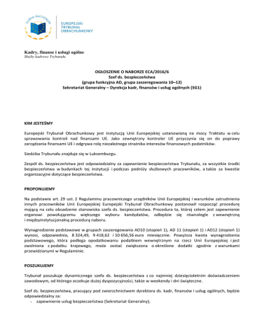 Kadry, finanse i usługi ogólne Służby kadrowe Trybunału OGŁOSZENIE O NABORZE ECA/2016/6 Szef ds. bezpieczeństwa (grupa funkcyjna AD, grupa zaszeregowania 10–12) Sekretariat Generalny – Dyrekcja kadr, finansów i usług ogólnych (SG1) KIM JESTEŚMY Europejski Trybunał Obrachunkowy jest instytucją Unii Europejskiej ustanowioną na mocy Traktatu w celu sprawowania kontroli nad finansami UE. Jako zewnętrzny kontroler UE przyczynia się on do poprawy zarządzania finansami UE i odgrywa rolę niezależnego strażnika interesów finansowych podatników. Siedziba Trybunału znajduje się w Luksemburgu. Zespół ds. bezpieczeństwa jest odpowiedzialny za zapewnienie bezpieczeństwa Trybunału, za wszystkie środki bezpieczeństwa w budynkach tej instytucji i podczas podróży służbowych pracowników, a także za kwestie organizacyjne dotyczące bezpieczeństwa. PROPONUJEMY Na podstawie art. 29 ust. 2 Regulaminu pracowniczego urzędników Unii Europejskiej i warunków zatrudnienia innych pracowników Unii Europejskiej Europejski Trybunał Obrachunkowy postanowił rozpocząć procedurę mającą na celu obsadzenie stanowiska szefa ds. bezpieczeństwa. Procedura ta, której celem jest zapewnienie organowi powołującemu większego wyboru kandydatów, odbędzie się równolegle z wewnętrzną i międzyinstytucjonalną procedurą naboru. Wynagrodzenie podstawowe w grupach zaszeregowania AD10 (stopień 1), AD 11 (stopień 1) i AD12 (stopień 1) wynosi, odpowiednio, 8 324,49, 9 418,62 i 10 656,56 euro miesięcznie. Powyższa kwota wynagrodzenia podstawowego, która podlega opodatkowaniu podatkiem wewnętrznym na rzecz Unii Europejskiej i jest zwolniona z podatku krajowego, może zostać zwiększona o określone dodatki zgodnie z warunkami przewidzianymi w Regulaminie. POSZUKUJEMY Trybunał poszukuje dynamicznego szefa ds. bezpieczeństwa z co najmniej dziesięcioletnim doświadczeniem zawodowym, od którego oczekuje dużej dyspozycyjności, także w weekendy i dni świąteczne. Szef ds. bezpieczeństwa, pracujący pod zwierzchnictwem dyrektora ds. kadr, finansów i usług ogólnych, będzie odpowiedzialny za: - zapewnienie usług bezpieczeństwa (Sekretariat Generalny); - przeprowadzanie ocen zagrożenia w celu zapewnienia skutecznego i terminowego wdrożenia odpowiednich środków w zakresie urządzeń i procedur zarządzania kryzysowego, z uwzględnieniem aspektów dotyczących ewakuacji; - regularne przeprowadzanie analiz sytuacji i stosowanie uznanych narzędzi do analizy ryzyka; - koordynowanie i rozwój kontaktów zawodowych z lokalną policją i jednostkami ds. bezpieczeństwa, urzędnikami pełniącymi analogiczne funkcje w innych instytucjach UE, a także departamentami ds. bezpieczeństwa w państwach członkowskich. Niniejsza procedura naboru jest otwarta dla kandydatów, którzy w dniu, w którym upływa termin składania kandydatur, spełniają następujące warunki: zgodnie z art. 5 Regulaminu pracowniczego: * posiadają wykształcenie odpowiadające pełnemu cyklowi studiów uniwersyteckich, potwierdzone uzyskaniem dyplomu, w przypadku gdy normalny czas trwania wspomnianych studiów wynosi co najmniej cztery lata, lub * posiadają wykształcenie odpowiadające pełnemu cyklowi studiów uniwersyteckich, potwierdzone uzyskaniem dyplomu, oraz odpowiednie doświadczenie zawodowe w wymiarze co najmniej jednego roku, w przypadku gdy normalny czas trwania wspomnianych studiów wynosi co najmniej trzy lata, lub * w przypadku gdy jest to uzasadnione interesem służby – posiadają wykształcenie zawodowe na równoważnym poziomie. Ze względu na charakter obowiązków wymagana jest dobra znajomość języka angielskiego i francuskiego, a znajomość innych języków będzie dodatkowym atutem. Kandydaci muszą także posiadać: udokumentowane doświadczenie zawodowe wysokiego szczebla w siłach bezpieczeństwa, policji lub wojsku (oficer wysokiej rangi), zdobyte w jednym z krajów członkowskich UE po uzyskaniu wyżej wymienionych kwalifikacji. Doświadczenie musi obejmować co najmniej 10 lat w przypadku grupy zaszeregowania AD10, 12 lat – w przypadku AD11 i 15 lat – w przypadku AD12; doświadczenie operacyjne w kierowaniu zespołem odpowiedzialnym za ochronę pracowników, budynków, ich otoczenia lub przetwarzanych informacji; doświadczenie zawodowe w sporządzaniu analiz zagrożenia i sprawozdań; zdolność nawiązywania kontaktów zawodowych z siłami policji i departamentami ds. bezpieczeństwa; umiejętność pracy w trudnych okolicznościach i w warunkach stresu. Dodatkowym atutem będą także: udokumentowane doświadczenie zawodowe związane z obszarami wysokiego ryzyka (ambasady, konsulaty, organizacje międzynarodowe itd.); doświadczenie w prowadzeniu spraw poufnych; umiejętność działania na rzecz rozwoju strategii i procedur bezpieczeństwa; specjalistyczne przeszkolenie techniczne w dziedzinie bezpieczeństwa; podstawowe (medyczne) przeszkolenie ratownicze. POLITYKA REKRUTACJI W polityce zatrudnienia Trybunał kieruje się zasadą równych szans i rozpatruje kandydatury wszystkich osób o odpowiednich kwalifikacjach pochodzących z państw członkowskich UE z uwzględnieniem możliwie najszerszego zasięgu geograficznego i z wykluczeniem wszelkiej dyskryminacji. Trybunał oferuje swoim pracownikom rozwiązania pozwalające godzić pracę z życiem prywatnym i może zapewnić odpowiednie udogodnienia w miejscu pracy dla osób niepełnosprawnych. WARUNKI REKRUTACJI Zgodnie z art. 28 Regulaminu pracowniczego kandydat musi w szczególności: posiadać obywatelstwo jednego z państw członkowskich Unii Europejskiej; 2 - korzystać z pełni praw cywilnych i obywatelskich; mieć uregulowany stosunek do służby wojskowej; posiadać cechy charakteru odpowiednie do wykonywania odnośnych obowiązków służbowych. PROCEDURA WYBORU Komisja rekrutacyjna przeanalizuje kandydatury spełniające warunki wyboru, w wyniku czego zostanie wyłonionych maksymalnie 10 najwy