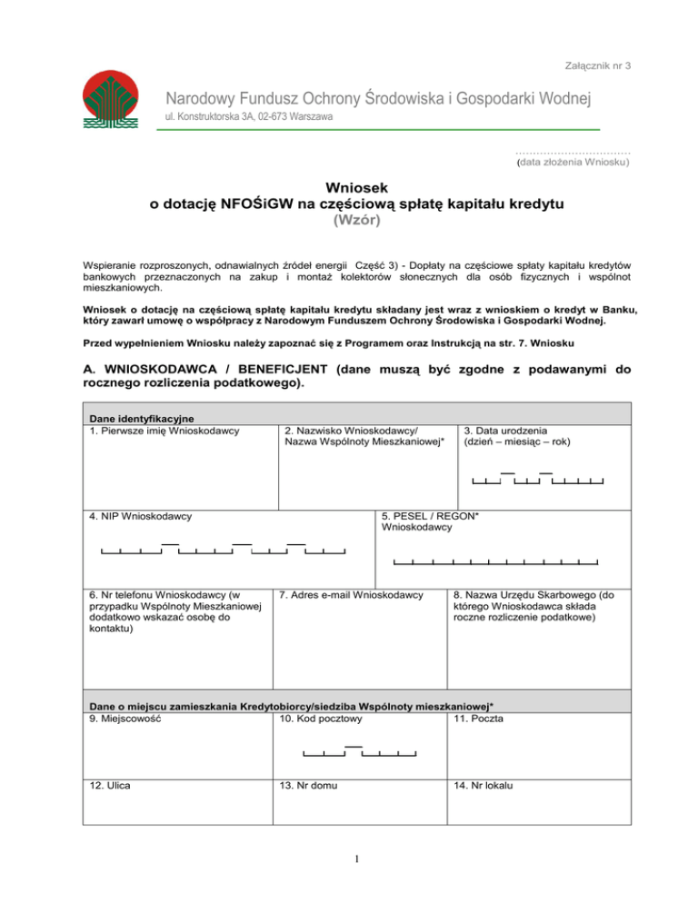 Załącznik nr 3 Narodowy Fundusz Ochrony Środowiska i Gospodarki Wodnej ul. Konstruktorska 3A, 02-673 Warszawa …………………………… (data złożenia Wniosku) Wniosek o dotację NFOŚiGW na częściową spłatę kapitału kredytu (Wzór) Wspieranie rozproszonych, odnawialnych źródeł energii Część 3) - Dopłaty na częściowe spłaty kapitału kredytów bankowych przeznaczonych na zakup i montaż kolektorów słonecznych dla osób fizycznych i wspólnot mieszkaniowych. Wniosek o dotację na częściową spłatę kapitału kredytu składany jest wraz z wnioskiem o kredyt w Banku, który zawarł umowę o współpracy z Narodowym Funduszem Ochrony Środowiska i Gospodarki Wodnej. Przed wypełnieniem Wniosku należy zapoznać się z Programem oraz Instrukcją na str. 7. Wniosku A. WNIOSKODAWCA / BENEFICJENT (dane muszą być zgodne z podawanymi do rocznego rozliczenia podatkowego). Dane identyfikacyjne 1. Pierwsze imię Wnioskodawcy 2. Nazwisko Wnioskodawcy/ Nazwa Wspólnoty Mieszkaniowej* 4. NIP Wnioskodawcy 6. Nr telefonu Wnioskodawcy (w przypadku Wspólnoty Mieszkaniowej dodatkowo wskazać osobę do kontaktu) 3. Data urodzenia (dzień – miesiąc – rok) 5. PESEL / REGON* Wnioskodawcy 7. Adres e-mail Wnioskodawcy 8. Nazwa Urzędu Skarbowego (do którego Wnioskodawca składa roczne rozliczenie podatkowe) Dane o miejscu zamieszkania Kredytobiorcy/siedziba Wspólnoty mieszkaniowej* 9. Miejscowość 10. Kod pocztowy 11. Poczta 12. Ulica 13. Nr domu 14. Nr lokalu 1 B. PRZEDSIĘWZIĘCIE - zakup i montaż kolektorów słonecznych do ogrzewania wody użytkowej albo do ogrzewania wody użytkowej i wspomagania zasilania w energię innych odbiorników ciepła. I. ADRES REALIZACJI PRZEDSIĘWZIĘCIA A. Czy adres realizacji przedsięwzięcia jest tożsamy z adresem zamieszkania wskazanym w pkt. 9 - 14 TAK* / NIE* B. Jeżeli skreślono TAK, to należy wypełnić punkty 15 – 20 15. Miejscowość 16. Kod pocztowy 17. Ulica 18. Nr domu 19. Nr lokalu 20. Nr działki (wpisać w przypadku budynku mieszkalnego w budowie, gdzie brak ulicy, nr domu) II. POZOSTAŁE DANE 21. Powierzchnia całkowita budynku mieszkalnego, dla którego zostaną zainstalowane kolektory 2 słoneczne (w m ) 22. Czy w budynku mieszkalnym, którego dotyczy przedsięwzięcie jest / będzie (dotyczy budynku mieszkalnego w budowie) prowadzona działalność gospodarcza lub najem. 23. Powierzchnia budynku mieszkalnego wykorzystywana/ planowana do wykorzystania do działalności gospodarczej 2 lub pod wynajem (w m ) TAK* / NIE* 2 24. Udział powierzchni wykorzystywanej/ planowanej do wykorzystania do działalności gospodarczej lub pod wynajem w powierzchni całkowitej budynku mieszkalnego (23/21) w % 25. Powierzchnia apertury kolektorów słonecznych (w m ) 26. Rodzaj zastępowanego / uzupełniającego* nośnika energii - energia elektryczna / gaz ziemny / gaz płynny/węgiel kamienny / węgiel brunatny /olej opałowy / biomasa* 27. Tytuł prawny do budynku mieszkalnego / budynku mieszkalnego w budowie* III. KOSZTY PRZEDSIĘWZIĘCIA 28. Planowane koszty kwalifikowane przedsięwzięcia ogółem (zgodnie z kosztorysem zawartym w ofercie/ projekcie/projekcie budowlanowykonawczym*) w zł: 29. Planowane koszty kwalifikowane przedsięwzięcia w zł: (uwzględniające pomniejszenia wynikające z prowadzenia działalności gospodarczej oraz ograniczenia jednostkowym kosztem kwalifikowanym). 2 30. Jednostkowy koszt kwalifikowany 2 1 m kolektora słonecznego w zł. (nie może być wyższy niż 2.250 zł/m2) 32.Kwota wnioskowanej dotacji NFOŚiGW na częściową spłatę kapitału kredytu (45% x poz. 31b.) w zł. 31. Wnioskowana kwota kredytu na finansowanie: a. kosztów kwalifikowanych w zł: b. kosztów kwalifikowanych objętych dotacją w zł: IV.HARMONOGRAM RZECZOWO-FINANSOWY PRZEDSIĘWZIĘCIA Wyszczególnienie 1 33. Planowane koszty kwalifikowane przedsięwzięcia (zgodnie z kosztorysem zawartym w ofercie/projekcie/projekcie budowlano-wykonawczym*), w tym: 33.1. - Koszt projektu instalacji kolektorów słonecznych do ogrzewania wody użytkowej / do ogrzewania wody użytkowej i wspomagania zasilania w energię innych odbiorników ciepła* Ogółem w zł: Kwota kredytu w zł: 2 3 Pkt 28 - Koszt projektu budowlano - wykonawczego rozwiązania technologicznego dotyczącego montażu instalacji do ogrzewania wody użytkowej / do ogrzewania wody użytkowej i wspomagania zasilania w energię innych odbiorników ciepła.* 33.2. Koszt nabycia nowych instalacji kolektorów słonecznych, w tym: 1/ 33.2.1 Kolektor słoneczny szt. ……………… łączna powierzchnia całkowita kolektorów ………… m łączna powierzchnia apertury 1/ ………… m 33.2.2. Zasobnik o pojemności ……………dm 2 2 3 33.2.3. Przewody instalacyjne. 1/ 33.2.4. Aparatura kontrolno-pomiarowa i automatyka . 33.2.5. Inne materiały i urządzenia (wskazać jakie). 33.3. Koszt zakupu ciepłomierza spełniającego normy PN EN 1434. 33.4. Koszt montażu instalacji kolektora słonecznego. 1/ urządzenie powinno posiadać gwarancję producenta na okres nie krótszy niż 5 lat; 3 Pkt 31a Planowany termin wypłaty kredytu 4 Planowany termin rozpoczęcia przedsięwzięcia Planowany termin osiągnięcia efektu ekologicznego tożsamego z efektem rzeczowym rozumiany jako planowany termin zrealizowania całego przedsięwzięcia i jego uruchomienia, a w przypadku budynków mieszkalnych w budowie zamieszkanie w budynku. ………….. - …………. - ………………. r. ………….. - …………. - ………………. r. Oświadczam, że(**): nie mam prawnej możliwości odzyskania lub odliczenia poniesionego ostatecznie kosztu podatku VAT. Jednocześnie zobowiązuję się, że nie będę w przyszłości wnioskować o refundację jakiejkolwiek części poniesionego w ramach przedsięwzięcia podatku VAT; będę mógł odzyskać lub odliczyć koszt podatku VAT poniesionego w związku z realizacją przedsięwzięcia objętego niniejszym wnioskiem. Oświadczam, 