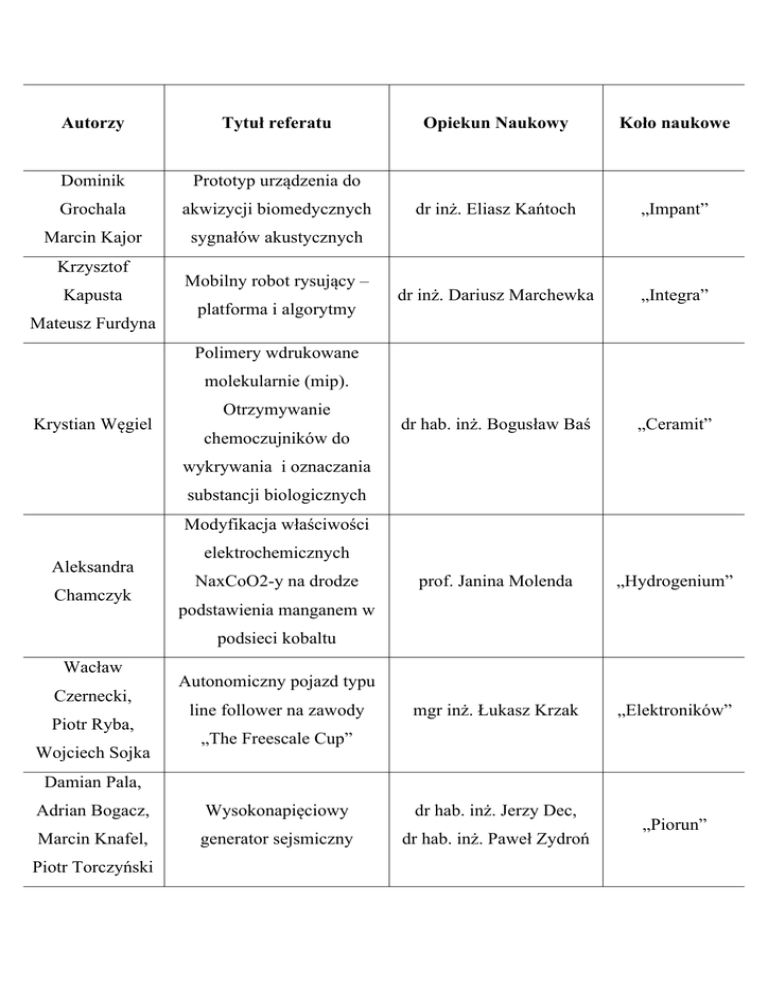 Autorzy Tytuł referatu Opiekun Naukowy Koło naukowe