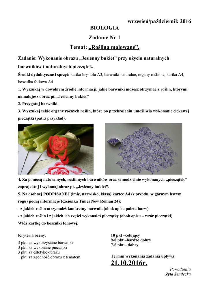 wrzesień/październik 2016 BIOLOGIA Zadanie Nr 1 Temat: „Rośliną malowane”. Zadanie: Wykonanie obrazu „Jesienny bukiet” przy użyciu naturalnych barwników i naturalnych pieczątek. Środki dydaktyczne i sprzęt: kartka brystolu A3, barwniki naturalne, organy roślinne, kartka A4, koszulka foliowa A4 1. Wyszukaj w dowolnym źródle informacji, jakie barwniki możesz otrzymać z roślin, którymi namalujesz obraz pt. „Jesienny bukiet” 2. Przygotuj barwniki. 3. Wyszukaj takie organy różnych roślin, które po przekrojeniu umożliwią wykonanie ciekawej pieczątki (patrz przykład). 4. Za pomocą naturalnych, roślinnych barwników oraz samodzielnie wykonanych „pieczątek” zaprojektuj i wykonaj obraz pt. „Jesienny bukiet”. 5. Na osobnej PODPISANEJ (imię, nazwisko, klasa) kartce A4 (z przodu, w górnym lewym rogu) podaj informacje (czcionka Times New Roman 24): - z jakich roślin otrzymałeś konkretny barwnik (obok opisu paleta barw) - z jakich roślin i z jakich ich części wykonałeś pieczątkę (obok opisu – wzór pieczątki) Włóż kartkę do koszulki foliowej. Kryteria oceny: 3 pkt. za wykorzystane barwniki 3 pkt. za wykonane pieczątki 3 pkt. za estetykę obrazu 1 pkt. za zgodność obrazu z tematem 10 pkt –celujący 9-8 pkt –bardzo dobry 7-6 pkt – dobry Termin wykonania zadania upływa 21.10.2016r. Powodzenia Zyta Sendecka