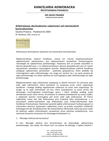 KANCELARIA ADWOKACKA RECHTSANWALTSKANZLEI DR JACEK FRANEK MAGISTER LEGUM EUROPAE Arbitrażowe dochodzenie należności od niemieckich kontrahentów Gazeta Prawna - Październik 2003 Nr Wydania: 205, strona 21 Arbitrażowe dochodzenie należności od niemieckich kontrahentów Międzynarodowy arbitraż handlowy, zwany też inaczej międzynarodowym sądownictwem polubownym, jest sądownictwem prywatnym funkcjonującym równolegle do sądownictwa państwowego. Popularny jest on przede wszystkim w obrocie gospodarczym, a w międzynarodowym obrocie gospodarczym jest on nawet najczęstszym sposobem rozstrzygania sporów. Międzynarodowy arbitraż handlowy zastępuje sądownictwo państwowe - podmioty gospodarcze, które poddały się rozstrzygnięciu sądu arbitrażowego, nie mogą ani zwrócić się z tą samą sprawą do sądu państwowego ani złożyć apelacji od rozstrzygnięcia sądu arbitrażowego do sądu państwowego. Międzynarodowe sądy arbitrażowe występują w dwóch formach. Po pierwsze jako stałe sądy arbitrażowe, które powołane są zazwyczaj przez różne organizacje handlowe i działają według regulaminów nadanych im przez owe organizacje. Po drugie są to sądy arbitrażowe ad hoc, które powoływane są przez strony dla doraźnego rozstrzygnięcia konkretnego sporu i które działają według zasad określonych przez same strony. W praktyce te ostatnie powoływane są raczej rzadko, a większość sporów rozstrzygana jest przez stałe sądy arbitrażowe. W Polsce najbardziej znany jest Sąd Arbitrażowy przy Krajowej Izbie Gospodarczej, a w stosunkach polsko-niemieckich Sąd Arbitrażowy przy Polsko-Niemieckiej Izbie Handlowo-Przemysłowej. Natomiast spośród sądów arbitrażowych funkcjonujących w niemieckim obszarze językowym najbardziej znane są przede wszystkim wiedeński Schiedsgericht der Bundeskammer der Gewerblichen Wirtschaft, który był przez wiele lat jedynym sądem arbitrażowym uznawanym przez państwa socjalistyczne, oraz niemiecki Deutsche Institution für Schiedsgerichtsbarkeit e.V. 1. Dlaczego arbitraż jest korzystny? O tym, dlaczego arbitraż jest korzystniejszy od opieszałego sądownictwa państwowego, wie każdy, kto złożył choć raz pozew do jednego z sądów polskich i tel.: + 48 22 622 95 96 fax: +48 22 622 12 85 mobile: +48 508 191 289 e-mail: [email protected] czekał na wyznaczenie pierwszej (!) rozprawy dwa lata, nie mówiąc już o otrzymaniu ostatecznego wyroku, podczas gdy po złożeniu pozwu do sądu arbitrażowego, najczęściej już po 12 miesiącach ma się w ręku ostateczne i niezaskarżalne do drugiej instancji rozstrzygnięcie. W przypadku nieskomplikowanych spraw postępowanie przed sądem arbitrażowym może trwać nawet jeszcze krócej. Także koszty postępowania arbitrażowego są zazwyczaj niższe aniżeli koszty postępowania w sądach państwowych. Ponadto samo postępowanie nie jest tak sformalizowane jak postępowanie przed sądem państwowym. Sędziowie zasiadający w sądach arbitrażowych są poza tym z reguły bardziej kompetentni aniżeli sędziowie państwowi, zarówno pod względem wykształcenia prawniczego jak i pod względem doświadczenia dotyczącego życia gospodarczego. Ponadto, co bardzo istotne, na podstawie konwencji międzynarodowych zapewnione jest bezproblemowe uznanie i wykonywanie rozstrzygnięć sądu arbitrażowego w innych państwach. Przykładowo wyrok sądu arbitrażowego mającego siedzibę w Polsce podlega po zaopatrzeniu go w niemiecką klauzulę wykonalności bezpośredniej egzekucji w Niemczech. 2. Jak poddać się arbitrażowi? Poddanie się międzynarodowemu arbitrażowi handlowemu następuje poprzez zawarcie umowy o arbitraż między kontrahentami. W praktyce gospodarczej w umowach takich wskazywany jest najczęściej konkretny sąd arbitrażowy, który ma być właściwy do rozstrzygania sporów między kontrahentami. Możliwe jest jednak także pozostawienie tej kwestii otwartej poprzez dokonanie ustalenia, że konkretni sędziowie arbitrażowi, czyli tzw. arbitrzy, zostaną powołani dopiero w wypadku powstania konkretnego sporu. Umowy o poddanie się międzynarodowemu arbitrażowi handlowemu zawierane są zazwyczaj przy okazji podpisywania generalnego kontraktu z kontrahentem (dostawy, kupna-sprzedaży, o współpracy itp.) i dotyczą zazwyczaj rozstrzygania sporów mogących wyniknąć w przyszłości z owego kontraktu. Możliwe jest jednak także zawarcie umowy o poddanie się arbitrażowi handlowemu już po powstaniu konkretnego sporu dotyczącego wykonania zobowiązań z danej umowy. 3. Ogólne zasady postępowania arbitrażowego Postępowanie przed sądami arbitrażowymi jest o wiele mniej sformalizowane aniżeli postępowanie przed sądami państwowymi. Sąd arbitrażowy stosuje albo takie reguły postępowania, które w jego ocenie doprowadzą do jak najszybszego rozwiązania sporu albo też reguły postępowania ustanowione przez same strony. Ponadto strony mogą same wybrać arbitrów, którzy rozstrzygną ich spór - zazwyczaj odbywa się w ten sposób, że każda ze stron wybiera po jednym arbitrze, a przewodniczącego ciała sędziowskiego czyli tzw. superarbitra, wybierają oni albo wspólnie albo ustanawiany jest on przez prezesa sądu arbitrażowego. Ponadto strony mają wolny wybór co do języka, w którym toczy się postępowanie przed sądem arbitrażowym. tel.: + 48 22 622 95 96 fax: +48 22 622 12 85 mobile: +48 508 191 289 e-mail: [email protected] Wolny wybór strony mają także co do prawa, według którego ma zostać rozstrzygnięty spór, tzn. mogą one zarówno wybrać prawo, które jest związane z przedmiotem sporu, np. polskie lub niemieckie, ale mogą także wybrać prawo, które zupełnie nie jest związane ani z siedzibą strony ani z przedmiotem sporu, np. pakistańskie lub balijskie. Co więcej, strony mogą zazwyczaj upoważnić sąd do rozstrzygania nie na podstawie określonego prawa lecz na podstawie zasad słuszności. Sąd feruj