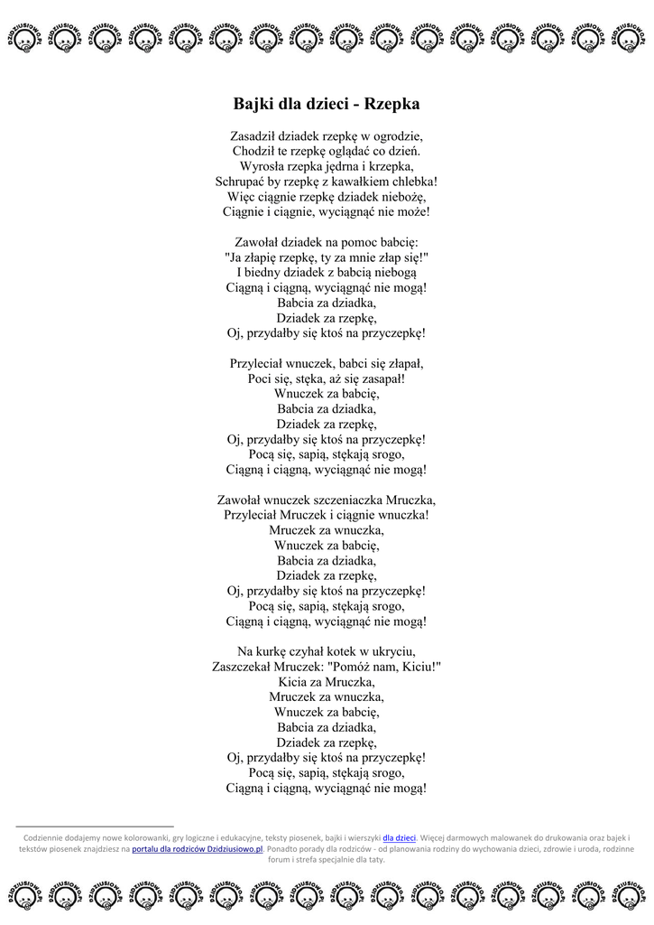 1 Bajki dla dzieci - Rzepka Zasadził dziadek rzepkę w ogrodzie, Chodził te rzepkę oglądać co dzień. Wyrosła rzepka jędrna i krzepka, Schrupać by rzepkę z kawałkiem chlebka! Więc ciągnie rzepkę dziadek niebożę, Ciągnie i ciągnie, wyciągnąć nie może! Zawołał dziadek na pomoc babcię: "Ja złapię rzepkę, ty za mnie złap się!" I biedny dziadek z babcią niebogą Ciągną i ciągną, wyciągnąć nie mogą! Babcia za dziadka, Dziadek za rzepkę, Oj, przydałby się ktoś na przyczepkę! Przyleciał wnuczek, babci się złapał, Poci się, stęka, aż się zasapał! Wnuczek za babcię, Babcia za dziadka, Dziadek za rzepkę, Oj, przydałby się ktoś na przyczepkę! Pocą się, sapią, stękają srogo, Ciągną i ciągną, wyciągnąć nie mogą! Zawołał wnuczek szczeniaczka Mruczka, Przyleciał Mruczek i ciągnie wnuczka! Mruczek za wnuczka, Wnuczek za babcię, Babcia za dziadka, Dziadek za rzepkę, Oj, przydałby się ktoś na przyczepkę! Pocą się, sapią, stękają srogo, Ciągną i ciągną, wyciągnąć nie mogą! Na kurkę czyhał kotek w ukryciu, Zaszczekał Mruczek: "Pomóż nam, Kiciu!" Kicia za Mruczka, Mruczek za wnuczka, Wnuczek za babcię, Babcia za dziadka, Dziadek za rzepkę, Oj, przydałby się ktoś na przyczepkę! Pocą się, sapią, stękają srogo, Ciągną i ciągną, wyciągnąć nie mogą! Codziennie dodajemy nowe kolorowanki, gry logiczne i edukacyjne, teksty piosenek, bajki i wierszyki dla dzieci. Więcej darmowych malowanek do drukowania oraz bajek i tekstów piosenek znajdziesz na portalu dla rodziców Dzidziusiowo.pl. Ponadto porady dla rodziców - od planowania rodziny do wychowania dzieci, zdrowie i uroda, rodzinne forum i strefa specjalnie dla taty. Więc woła Kicia kurkę z podwórka, Wnet przyleciała usłużna kurka. Kurka za Kicię, Kicia za Mruczka, Mruczek za wnuczka, Wnuczek za babcię, Babcia za dziadka, Dziadek za rzepkę, Oj, przydałby się ktoś na przyczepkę! Pocą się, sapią, stękają srogo, Ciągną i ciągną, wyciągnąć nie mogą! Szła sobie gąska ścieżynką wąską, Krzyknęła kurka: "Chodź no tu gąsko!" Gąska za kurkę, Kurka za Kicię, Kicia za Mruczka, Mruczek za wnuczka, Wnuczek za babcię, Babcia za dziadka, Dziadek za rzepkę, Oj, przydałby się ktoś na przyczepkę! Pocą się, sapią, stękają srogo, Ciągną i ciągną, wyciągnąć nie mogą! Leciał wysoko bocian-długonos, "Fruńże tu, boćku, do nas na pomoc!" Bociek za gąskę, Gąska za kurkę, Kurka za Kicię, Kicia za Mruczka, Mruczek za wnuczka, Wnuczek za babcię, Babcia za dziadka, Dziadek za rzepkę, Oj, przydałby się ktoś na przyczepkę! Pocą się, sapią, stękają srogo, Ciągną i ciągną, wyciągnąć nie mogą! Skakała drogą zielona żabka, Złapała boćka - rzadka to gradka! Żabka za boćka, Bociek za gąskę, Gąska za kurkę, Kurka za Kicię, Kicia za Mruczka, Mruczek za wnuczka, Wnuczek za babcię, Babcia za dziadka, Dziadek za rzepkę, A na przyczepkę Kawka za żabkę Bo na tę rzepkę Też miała chrapkę. Tak się zawzięli, Tak się nadęli, Ze nagle rzepkę Trrrach!! - wyciągnęli! Aż wstyd powiedzieć, Co było dalej! Wszyscy na siebie Poupadali: Rzepka na dziadka, Dziadek na babcię, Babcia na wnuczka, Wnuczek na Mruczka, Mruczek na Kicię, Kicia na kurkę, Kurka na gąskę, Gąska na boćka, Bociek na żabkę, Żabka na kawkę I na ostatku Kawka na trawkę. Autor: Julian Tuwim
