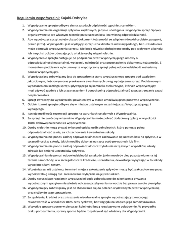 Regulamin wypożyczalni: Kajaki-Dobrylas 1. Wypożyczanie sprzętu odbywa się na zasadach odpłatności zgodnie z cennikiem. 2. Wypożyczalnia nie organizuje spływów kajakowych, jedynie udostępnia i wypożycza sprzęt. Spływy organizowane są we własnym zakresie przez uczestników i na własną odpowiedzialność. 3. Aby wypożyczyć sprzęt należy okazać dokument tożsamości ze zdjęciem (dowód osobisty, paszport, prawo jazdy). W przypadku jeśli wydający sprzęt uzna klienta za niewiarygodnego, bez uzasadnienia może odmówić wypożyczenia sprzętu. Nie będą również obsługiwane osoby pod wpływem alkoholu lub innych środków odurzających, a także osoby niepełnoletnie. 4. Wypożyczenie sprzętu następuje po podpisaniu przez Wypożyczającego umowy o odpowiedzialności materialnej, wpłaceniu należności oraz pozostawieniu dokumentu tożsamości. Z momentem podpisania w/w umowy za wypożyczony sprzęt pełną odpowiedzialność materialną ponosi Wypożyczający. 5. Wypożyczający zobowiązany jest do sprawdzenia stanu wypożyczanego sprzętu pod względem jakościowym, ilościowym oraz przekazania ewentualnych uwag wydającemu sprzęt. Podstawowym wyposażeniem każdego sprzętu pływającego są kamizelki asekuracyjne, których wypożyczający musi używać zgodnie z ich przeznaczeniem i ponosi pełną odpowiedzialność za przestrzeganie zasad bezpieczeństwa. 6. Sprzęt zwracany do wypożyczalni powinien być w stanie umożliwiającym ponowne wypożyczenie. 7. Odbiór i zwrot sprzętu odbywa się w miejscu ustalonym wcześniej przez Wypożyczającego i wydającego. 8. Istnieje możliwość rezerwacji sprzętu na warunkach ustalonych z Wypożyczalnią. 9. Za sprzęt nie zwrócony w terminie Wypożyczalnia może pobrać dodatkową opłatę w wysokości 100% dobowej należności za wypożyczenie. 10. Osoby nieletnie mogą pływać tylko pod opieką osób pełnoletnich, które ponoszą pełną odpowiedzialność za nie, za ich zachowanie i ewentualne szkody. 11. Wypożyczalnia nie ponosi żadnej odpowiedzialności za zachowanie się uczestników na spływie, a w szczególności za szkody, jakich mogliby dokonać na rzecz osób prywatnych lub firm. 12. Wypożyczalnia nie ponosi żadnej odpowiedzialności z tytułu nieszczęśliwych wypadków, utraty zdrowia lub śmierci uczestników spływów. 13. Wypożyczalnia nie ponosi odpowiedzialności za szkody, jakim mogłyby ulec pozostawione na jej terenie samochody, a w szczególności za kradzieże, uszkodzenia, dewastacje wyłączając w to szkody wywołane siłami natury. 14. Wcześniejsze, niż ustalono, terminy i miejsca zakończenia spływów muszą być zaakceptowane przez wypożyczalnię i mogą być zrealizowane wyłącznie na jej warunkach. 15. Osoby naruszające regulamin wypożyczalni będą zobowiązane do zakończenia pływania wypożyczonym sprzętem niezależnie od czasu przebywania na wodzie bez prawa zwrotu pieniędzy. 16. Wypożyczający zobowiązany jest do stosowania się do poleceń wydawanych przez Wypożyczalnię oraz służby do tego uprawnione. 17. Za zgubienie, kradzież oraz zniszczenia nieodwracalne sprzętu wypożyczający zwraca jego równowartość w wysokości 100% ceny rynkowej bez względu na stopień jego zamortyzowania. 18. Wszystkie sprawy sporne w pierwszej kolejności będą rozwiązywane polubownie. W przypadku braku porozumienia, sprawy sporne będzie rozpatrywał sąd właściwy dla Wypożyczalni.