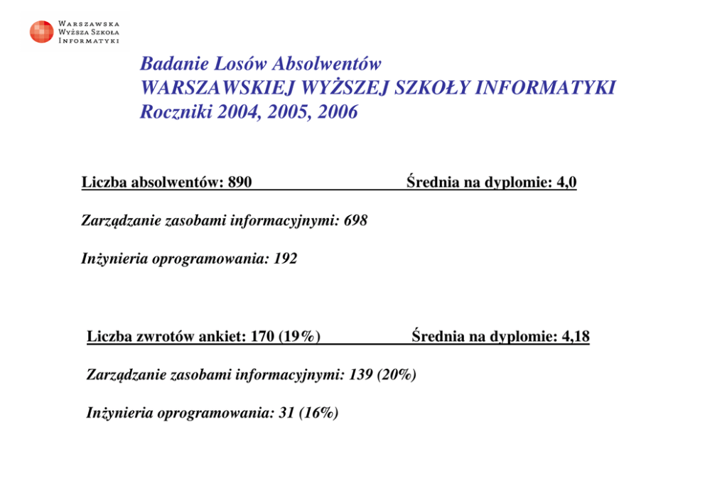 Badanie Losów Absolwentów WARSZAWSKIEJ WYŻSZEJ SZKOŁY INFORMATYKI Roczniki 2004, 2005, 2006 Liczba absolwentów: 890 Średnia na dyplomie: 4,0 Zarządzanie zasobami informacyjnymi: 698 Inżynieria oprogramowania: 192 Liczba zwrotów ankiet: 170 (19%) Średnia na dyplomie: 4,18 Zarządzanie zasobami informacyjnymi: 139 (20%) Inżynieria oprogramowania: 31 (16%) Rodzaj ukończonej przez absolwentów szkoły średniej oraz miejscowość: Inna (Liceum Zawodowe, Technikum) 51% Liceum Ogólnokształcące 49% 51% studentów ukończyło licea zawodowe i technika 49% studentów ukończyło licea ogólnokształcące Inne 17% Województwo mazowieckie 22% Warszawa 61% Większość studentów ukończyło szkołę średnią w Warszawie – 61% 22 % w województwie mazowieckim 17% poza województwem mazowieckim Skąd absolwenci uzyskali informacje o WWSI: 31% od studentów lub absolwentów WWSI 23% od znajomych 21% z informatora 8% z prasy 5% z internetu z ulotki reklamowej inny (np. akcja promocyjna w szkole średniej, Targi Edukacyjne) 3% 9% Podstawowym Podstawowymźródłem źródłem informacji o WWSI dla informacji o WWSI dla przyszłych przyszłychstudentów studentówsą są obecni studenci i absolwenci obecni studenci i absolwenci Szkoły. Szkoły. Ważną Ważnąrolę rolęwwprocesie procesie rekrutacji rekrutacjiodgrywają odgrywająopinie opinie znajomych oraz prezentacja znajomych oraz prezentacja Szkoły Szkołyzawarta zawartaww informatorach informatorachooszkołach szkołach wyższych. wyższych. Mniejszą Mniejsząrolę rolęodgrywają odgrywają ogłoszenia ogłoszeniawwprasie, prasie,ulotki ulotki reklamowe, Internet. reklamowe, Internet. Co zadecydowało o wyborze WWSI: 67% Zdecydowana Zdecydowanawiększość większość studentów (80%) WWSI studentów (80%) WWSIwybrała wybrała informatykę – jako swój kierunek informatykę – jako swój kierunek studiów studiów, ,aby abyrozwijać rozwijaćzainteresowania. zainteresowania. Tylko część osób (13%) Tylko część osób (13%)podkreśla, podkreśla, żeżenie dostała się na uczelnie nie dostała się na uczelnie państwowe, państwowe,natomiast natomiast9% 9%absolwentów absolwentów podjęło decyzję, ze względu podjęło decyzję, ze względuna na perspektywę szybkiego uzyskania perspektywę szybkiego uzyskania zawodu. zawodu. 13% 9% 2% 4% 3% 2% ) inny powód renoma szkoły niskie opłaty chęć zmiany zawodu perspektywa szybkiego uzyskania zawodu nie dostałam się na uczelnię państwową moje zainteresowania Czym absolwenci zajmują się obecnie: pracuję 65% pracuję i studiuję 24% poszukuję pracy inne 3% studiuję 3% 5% Absolwentów cechuje bardzo wysoki poziom aktywności zawodowej ( wskaźnik zatrudnienia – ponad 90%). Tylko 5% absolwentów poszukuje pracy! Czy absolwenci pracowali przed ukończeniem WWSI: Nie 16% Tak 84% 25% Absolwenci studiów dziennych Absolwenci studiów zaocznych 59% 16% Absolwenci studiów wieczorowych Większość absolwentów (84%) pracowała już przed ukończeniem studiów. Wskaźnik zatrudnienia nie oddaje więc w pełni zmian w losach absolwentów po uzyskaniu dyplomu (ze względu na znaczny odsetek studentów pracujących zarówno na studiach dziennych, jaki wieczorowych i zaocznych). W związku z tym, należałoby mierzyć poprawę sytuacji zawodowej absolwentów! Czy absolwenci po ukończeniu WWSI otrzymali nową ofertę pracy: 30% absolwentów otrzymało nową propozycję pracy po ukończeniu studiów. Tak 30% Nie 70% 25% Absolwenci studiów dziennych Absolwenci studiów zaocznych 59% 16% Absolwenci studiów wieczorowych Sposób znalezienia pracy przez respondentów: w inny sposób; 6% przez Biuro Pośrednictwa Pracy; 4% poprzez praktyki; 7% przez internet; 8% poprzez samodzielne złożenie oferty; 20% z ogłoszenia; 26% przez znajomości; 29% Czy Dyplom WWSI ułatwia przyjęcie do pracy? nie zauważyłam wpływu; 42% 31% absolwentów uważa, że dyplom WWSI ułatwia przyjęcie do pracy. tak; 31% Pozostali absolwenci uznali, że zdobycie dyplomu WWSI nie ma wpływu na przyjęcie do pracy (42%) lub go nie ułatwia (27%) nie ; 27% Czy uzyskane w WWSI kwalifikacje pomagają w znalezieniu pracy? tak; 33% 76% absolwentów uważa, że kwalifikacje zdobyte w WWSI a nie sam dyplom WWSI pomagają w znalezieniu pracy! Można uznać więc, że kwalifikacje zdobyte w czasie studiów mają duży wpływ na karierę zawodową absolwentów. niewiele; 29% nie ; 24% tak,w dużym stopniu; 14% Czy absolwenci WWSI pracują w wyuczonym zawodzie: nie (ale wykorzystuję niektóre umiejętności zdobyte w WWSI) 34% Zdecydowana większość absolwentów (60%) pracuje w wyuczonym zawodzie lub (34%) wykorzystuje w pracy umiejętności zdobyte w WWSI nie 6% tak 60% Można uznać, iż oferta edukacyjna WWSI uwzględnia zarówno zainteresowania studentów, jak i wymagania rynku pracy! Branża, w której pracują absolwenci, to: 46% 14% 7% 6% usługi informatyczne administracja publiczna i obrona narodowa usługi finansowe handel 4% edukacja 4% przemysł 3% ochrona zdrowia 3% usługi telekomunikacyjne 3% 3% usługi ubezpieczeniowe usługi transportowe 2% budownictwo 5% inna Gdzie pracują absolwenci WWSI: w firmie prywatnej w zagranicznej firmie prywatnej w przedsiębiorstwie państwowym w urzędzie lub instytucji posiadają własną firmę w innej firmie (spółka akcyjna) 41% 21% 16% 16% 5% 2% Zajmowane stanowisko: urzędnik 2%2% 2% 2% informatyk nauczyciel grafik / webmaster technik pracownik ds. techniczno informatycznych analityk administrator artysta technik komputerowy administrator sieci korporacyjnej specjalista od dostępności pracownik fizyczny referent 17% 35% asystent stanowisko kierownicze 19% inne 21% pracownik umysłowy specjalista Wykonywany zawód: • • • • • • • • • • • • • • • • • • • • • • informatyk wdrożeniowiec administrator baz danych programista informatyk analityk-programista administrator sieci teleinformatycznej informatyk-admini