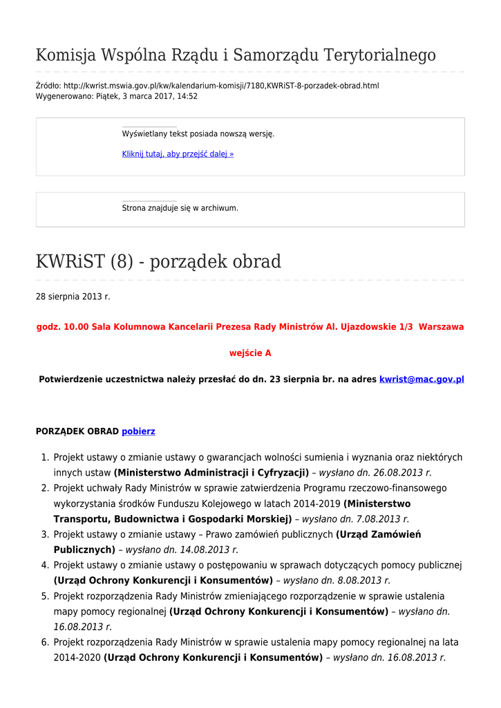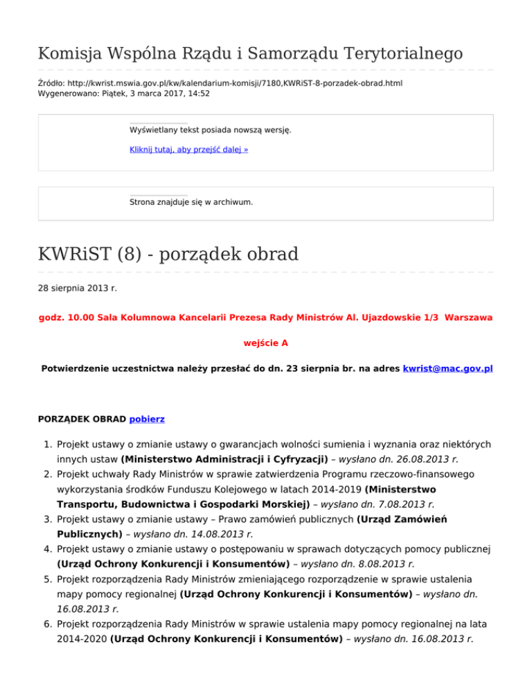 Komisja Wspólna Rządu i Samorządu Terytorialnego Źródło: http://kwrist.mswia.gov.pl/kw/kalendarium-komisji/7180,KWRiST-8-porzadek-obrad.html Wygenerowano: Piątek, 3 marca 2017, 14:52 Wyświetlany tekst posiada nowszą wersję. Kliknij tutaj, aby przejść dalej » Strona znajduje się w archiwum. KWRiST (8) - porządek obrad 28 sierpnia 2013 r. godz. 10.00 Sala Kolumnowa Kancelarii Prezesa Rady Ministrów Al. Ujazdowskie 1/3 Warszawa wejście A Potwierdzenie uczestnictwa należy przesłać do dn. 23 sierpnia br. na adres [email protected] PORZĄDEK OBRAD pobierz 1. Projekt ustawy o zmianie ustawy o gwarancjach wolności sumienia i wyznania oraz niektórych innych ustaw (Ministerstwo Administracji i Cyfryzacji) – wysłano dn. 26.08.2013 r. 2. Projekt uchwały Rady Ministrów w sprawie zatwierdzenia Programu rzeczowo-finansowego wykorzystania środków Funduszu Kolejowego w latach 2014-2019 (Ministerstwo Transportu, Budownictwa i Gospodarki Morskiej) – wysłano dn. 7.08.2013 r. 3. Projekt ustawy o zmianie ustawy – Prawo zamówień publicznych (Urząd Zamówień Publicznych) – wysłano dn. 14.08.2013 r. 4. Projekt ustawy o zmianie ustawy o postępowaniu w sprawach dotyczących pomocy publicznej (Urząd Ochrony Konkurencji i Konsumentów) – wysłano dn. 8.08.2013 r. 5. Projekt rozporządzenia Rady Ministrów zmieniającego rozporządzenie w sprawie ustalenia mapy pomocy regionalnej (Urząd Ochrony Konkurencji i Konsumentów) – wysłano dn. 16.08.2013 r. 6. Projekt rozporządzenia Rady Ministrów w sprawie ustalenia mapy pomocy regionalnej na lata 2014-2020 (Urząd Ochrony Konkurencji i Konsumentów) – wysłano dn. 16.08.2013 r. 7. Projekt rozporządzenia Ministra Gospodarki zmieniającego rozporządzenie w sprawie szczegółowego przeznaczenia, warunków i trybu udzielania pomocy finansowej na udział przedsiębiorców w programach promocji w ramach poddziałania 6.5.2. Programu Operacyjnego Innowacyjna Gospodarka, 2007-2013 – wysłano dn. 6.08.2013 r. 8. Projekt ustawy o standaryzacji niektórych wzorów pism w procedurach administracyjnych (Ministerstwo Gospodarki) – wysłano dn. 13.08.2013 r. 9. Projekt ustawy o zmianie ustawy o dochodach jednostek samorządu terytorialnego (Ministerstwo Finansów) – wysłano dn. 21.08.2013 r. 10. Projekt ustawy o zmianie ustawy o finansach publicznych oraz niektórych innych ustaw /dp/ (Ministerstwo Finansów) – wysłano 26.07.2013 r. 11. Projekt ustawy o zmianie ustawy o finansach publicznych oraz niektórych innych ustaw /pf/ (Ministerstwo Finansów) – wysłano dn. 16.08.2013 r. 12. Projekt rozporządzenia Ministra Finansów w sprawie wyznaczenia organu podatkowego do przekazywania informacji, wniosków o udzielenie informacji oraz wniosków o doręczenie – wysłano dn. 16.08.2013 r. 13. Projekt ustawy o zmianie ustawy o systemie informacji oświatowej (Ministerstwo Edukacji Narodowej) – wysłano dn. 14.08.2013 r. 14. Projekt ustawy o zmianie ustawy o promocji zatrudnienia i instytucjach rynku pracy oraz niektórych innych ustaw (Ministra Pracy i Polityki Społecznej) – wysłano dn. 01.08..2013 r. oraz 23.08.2013 r. 15. Projekt rozporządzenia Rady Ministrów w sprawie wysokości minimalnego wynagrodzenia za pracę w 2014 r. (Ministra Pracy i Polityki Społecznej) – wysłano dn.19.07.2013 r. 16. Projekt Krajowego Programu Przeciwdziałania Ubóstwu i Wykluczeniu Społecznemu 2020. Nowy wymiar aktywnej integracji (Ministra Pracy i Polityki Społecznej) – wysłano 29.07.2013 r. 17. Projekt rozporządzenia Ministra Pracy i Polityki Społecznej w sprawie dofinansowania ze środków Funduszu Pracy kosztów szkolenia pracowników objętych szczególnymi rozwiązaniami na rzecz ochrony miejsc pracy – wysłano 19.072013 r. 18. Projekt rozporządzenia Ministra Pracy i Polityki Społecznej w sprawie przyznawania świadczeń na rzecz ochrony miejsc pracy – wysłano 19.07.2013 r. 19. Projekt rozporządzenia Ministra Pracy i Polityki Społecznej zmieniające rozporządzenie w sprawie wydawania zezwolenia na pracę cudzoziemca – wysłano dn. 8.08.2013 r. 20. Projekt rozporządzenia Ministra Pracy i Polityki Społecznej zmieniającego rozporządzenie w sprawie określenia przypadków, w których zezwolenie na pracę cudzoziemca jest wydawane bez względu na szczegółowe warunki wydawania zezwoleń na pracę cudzoziemców – wysłano dn. 8.08.2013 r. 21. Projekt rozporządzenia Ministra Pracy i Polityki Społecznej zmieniającego rozporządzenie w sprawie przypadków, w których powierzenie wykonywania pracy cudzoziemcowi na terytorium RP jest dopuszczalne bez konieczności uzyskania zezwolenia na pracę – wysłano dn. 8.08.2013 r. 22. Projekt rozporządzenia Ministra Pracy i Polityki Społecznej w sprawie wysokości wpłaty dokonywanej w związku ze złożeniem wniosku o wydanie zezwolenia na pracę cudzoziemca – wysłano dn. 8.08.2013 r. 23. Projekt Programu Fundusz Inicjatyw Obywatelskich na lata 2014-2020 (Ministra Pracy i Polityki Społecznej) – wysłano 12.08.2013 r. 24. Projekt rozporządzenia Ministra Zdrowia w sprawie badań psychologicznych osób ubiegających się o uprawnienia do kierowania pojazdami, kierowców oraz osób wykonujących pracę na stanowisku kierowcy – wysłano dn. 31.07.2013 r. i 8.08.2013 r. 25. Projekt rozporządzenia Ministra Zdrowia w sprawie badań lekarskich osób ubiegających się o uprawnienia do kierowania pojazdami, kierowców oraz osób wykonujących pracę na stanowisku kierowcy – wysłano dn. 31.07.2013 r. i 8.08.2013 r. 26. Sprawy różne. Starsze wersje dokumentu Wstecz Drukuj Generuj PDF Powiadom znajomego