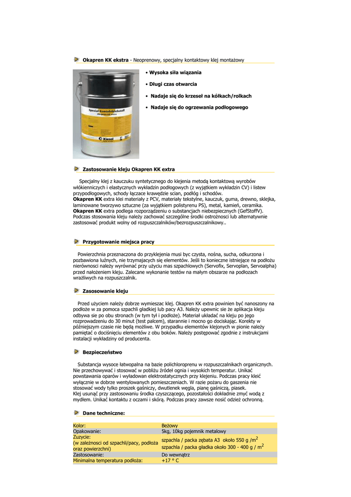 Okapren KK ekstra - Neoprenowy, specjalny kontaktowy klej montażowy • Wysoka siła wiązania • Długi czas otwarcia • Nadaje się do krzeseł na kółkach/rolkach • Nadaje się do ogrzewania podłogowego Zastosowanie kleju Okapren KK extra Specjalny klej z kauczuku syntetycznego do klejenia metodą kontaktową wyrobów włókienniczych i elastycznych wykładzin podłogowych (z wyjątkiem wykładzin CV) i listew przypodłogowych, schody łączace krawędzie scian, podłóg i schodów. Okapren KK extra klei materiały z PCV, materiały tekstylne, kauczuk, guma, drewno, sklejka, laminowane tworzywo sztuczne (za wyjątkiem polistyrenu PS), metal, kamień, ceramika. Okapren KK extra podlega rozporządzeniu o substancjach niebezpiecznych (GefStoffV). Podczas stosowania kleju należy zachować szczególne środki ostrożnosci lub alternatywnie zastosować produkt wolny od rozpuszczalników/bezrozpuszczalnikowy.. Przygotowanie miejsca pracy Powierzchnia przeznaczona do przyklejenia musi byc czysta, nośna, sucha, odkurzona i pozbawiona luźnych, nie trzymajacych się elementów. Jeśli to konieczne istniejące na podłożu nierównosci należy wyrównać przy użyciu mas szpachlowych (Servofix, Servoplan, Servoalpha) przed nałożeniem kleju. Zalecane wykonanie testów na małym obszarze na podłozach wrażliwych na rozpuszczalnik. Zasosowanie kleju Przed użyciem należy dobrze wymieszac klej. Okapren KK extra powinien być nanoszony na podłoże w za pomoca szpachli gładkiej lub pacy A3. Należy upewnic sie że aplikacja kleju odbywa sie po obu stronach (w tym tył i podłoże). Materiał układać na kleju po jego rozprowadzeniu do 30 minut (test palcem), starannie i mocno go dociskając. Korekty w późniejszym czasie nie będą możliwe. W przypadku elementów klejonych w pionie należy pamiętać o dociśnięciu elementów z obu boków. Należy postępować zgodnie z instrukcjami instalacji wykładziny od producenta. Bezpieczeństwo Substancja wysoce łatwopalna na bazie polichloroprenu w rozpuszczalnikach organicznych. Nie przechowywać i stosować w pobliżu źródeł ognia i wysokich temperatur. Unikać powstawania oparów i wyładowan elektrostatycznych przy klejeniu. Podczas pracy kleić wyłącznie w dobrze wentylowanych pomieszczeniach. W razie pożaru do gaszenia nie stosować wody tylko proszek gaśniczy, dwutlenek węgla, pianę gaśniczą, piasek. Klej usunąć przy zastosowaniu środka czyszczącego, pozostałości dokładnie zmyć wodą z mydłem. Unikać kontaktu z oczami i skórą. Podczas pracy zawsze nosić odzież ochronną. Dane techniczne: Kolor: Opakowanie: Zuzycie: (w zależnosci od szpachli/pacy, podłoża oraz powierzchni) Zastosowanie: Minimalna temperatura podłoża: Beżowy 5kg, 10kg pojemnik metalowy szpachla / packa zębata A3 około 550 g /m2 szpachla / packa gładka około 300 - 400 g / m2 Do wewnątrz +17 ° C Czas wstępnego odparowania (okres od nałożenia kleju do momentu kiedy klej osiągnie swoją pierwszą siłę wiążąca): Czas reakcji kleju (czas po którym klejenie nie będzie możliwe): Obciążalność (czas po którym wyłożona może być wstępnie użytkowana): Trwałość końcowa (czas po którym klej w pełni związał, a powierzchnia może być w pełni wykorzystana): Pelna wytrzymalosc: Przystosowany pod obciażenia krzesłami na kółkach 5 minut ok. 30minut ok. 24 godziny ok. 24 godziny po ok. 72 godzinach odpowiedni wg normy DIN EN 12 529 Magazynowanie: magazynować w dodatniej temperaturze, ok. 12 miesięcy Przystosowany do ogrzewania podłogowego Tak Magazynowanie: magazynować w dodatniej temperaturze, ok. 12 miesięcy w szczelnie zamkniętych pojemnikach Oznakowanie według rozporządzenia GefStoffV GISCODE łatwopalny S 1 wg TRGS 610 * Dane przy 20° C i wilgotności powietrza 65 %, wyższe temp. skracaja, niższe wydłużaja czas reakcji. Narzedzia szpachla / packa obustronnie gładka szpachla / packa zebata A3 Czyszczenie narzędzi Po zakończeniu pracy narzędzia czyścic rozpuszczalnikiem OKAPREN. Paletowanie 75x5kg pojemnik metalowy (Kod: 60131) 45x10kg pojemnik metalowy (Kod: 60130) Powyższe dane, przygotowanie i zastosowanie produktu oparto na naszej wiedzy i doświadczeniu. Z powodu różnych niezależnych od nas czynników, np. nietypowe podłoża, warunki zewnętrzne, zalecamy przeprowadzenie własnych prób, aby stwierdzić, czy nasz produkt nadaje się do danego postępowania. Firma Kiesel Polska nie ponosi odpowiedzialności z tego powodu. Przed użyciem koniecznie należy zapoznać się z kartą charakterystyki produktu.