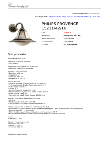 Dane aktualne na dzień: 03-03-2017 14:52 Link do produktu: http://www.twoje-lampy.pl/philips-provence-152114216-p-42646.html PHILIPS PROVENCE 15211/42/16 Cena 229,00 zł Dostępność Dostępność do 3 dni Numer katalogowy 15211/42/16 Kod producenta 152114216 Kod EAN 8718291443704 Opis produktu Stylistyka i wykończenie •Materiał: aluminium, syntetyk •Kolor: czarny Dodatkowe funkcje/akcesoria w zestawie •Odporność na warunki pogodowe Wymiary i waga produktu •Wysokość: 30,6 cm •Długość: 32 cm •Szerokość: 38,2 cm •Waga netto: 1,200 kg Dane techniczne •Zasilanie sieciowe: Przedział 220–240 V, 50–60 Hz •Technologia źródła światła: fluorescencyjne, 230 V •Liczba źródeł światła: 1 •Trzonek: E27 •Moc źródła światła w zestawie: 23 W •Maksymalna moc wymiennego źródła światła: 100 W •Barwa światła: ciepła biel •Maksymalna trwałość źródła światła: 10 000 godz. •Oprawa z możliwością przyciemniania: Nie •LED: Nie •Wbudowane źródło światła LED: NIE •Klasa energetyczna dołączonego źródła światła: A •Oprawa jest zgodna ze źródłami światła klasy: A+ do E •Współczynnik IP: IP44, ochrona przed przedmiotami powyżej 1 mm, ochrona przed rozchlapaną wodą •Klasa ochronności: I — uziemienie •Źródło światła odpowiadające tradycyjnej żarówce o mocy: 110 W •Moc strumienia świetlnego dołączonego źródła światła w lumenach: 1570 lm Serwis •Gwarancja: 2 lata Wymiary i waga opakowania •Wysokość: 26,1 cm •Długość: 39,5 cm •Szerokość: 31,5 cm wygenerowano w programie shopGold •Waga: 1,870 kg Różne •Opracowano z myślą o: Ogród i patio •Styl: Tradycyjny •Typ: Kinkiet wygenerowano w programie shopGold Powered by TCPDF (www.tcpdf.org)