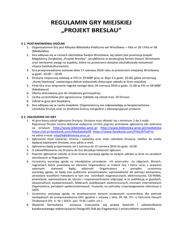 REGULAMIN GRY MIEJSKIEJ „PROJEKT BRESLAU” § 1. POSTANOWIENIA OGÓLNE 1. Organizatorem Gry jest Miejska Biblioteka Publiczna we Wrocławiu – Filia nr 29 i Filia nr 58 (Mediateka) 2. Gra odbywa się w ramach obchodów Święta Wrocławia. Jej celem jest promocja książki Magdaleny Zarębskiej „Projekt Breslau”, przybliżenie w atrakcyjnej formie historii Wrocławia oraz zwrócenie uwagi na aspekty, które na przestrzeni dziejów ukształtowały tożsamość miasta (wielokulturowość). 3. Gra przeprowadzona zostanie dnia 17 czerwca 2016 roku w przestrzeni miejskiej Wrocławia, w godz. 10.00 – 18.00 4. Drużyny rozpoczną zabawę w Filii nr 29 MBP przy ul. Reja 1 o godz. 10.00, gdzie otrzymają „Kartę Startową” zawierającą dalsze wskazówki dotyczące udziału w Grze miejskiej. 5. Finał Gry oraz wręczenie nagród nastąpi dnia 18 czerwca 2016 o godz. 11.00 w Filii nr 58 MBP (Mediatece) 6. Oferta skierowana jest do młodzieży gimnazjalnej. 7. Liczba uczestników jest ograniczona. Zakłada się udział max. 20 Drużyn. 8. Udział w grze jest bezpłatny. 9. Gra odbywa się w ruchu miejskim. Organizatorzy nie odpowiadają za bezpieczeństwo członków Drużyn oraz za działania Graczy niezgodne z obowiązującym prawem. § 2. ZGŁOSZENIE DO GRY 1. W grze biorą udział zgłoszone Drużyny. Drużyna musi składać się z minimum 2 do 3 osób. Rejestracji Drużyn można dokonać wyłącznie on-line poprzez przesłanie zgłoszenia (do pobrania na stronach http://www.biblioteka.wroc.pl http://www.biblioteka.wroc.pl/mediateka https://pl-pl.facebook.com/Mediateka58 https://www.facebook.com/Filia29?ref=ts na adres e-mail [email protected] 2. Zgłoszenie musi zawierać: imiona i nazwiska oraz wiek członków Drużyny, telefon do osoby będącej kapitanem Drużyny, oraz adres e-mail. 3. Zgłoszenia będą przyjmowane od 1 czerwca do 15 czerwca 2016 do godz. 10.00. 4. O zakwalifikowaniu się Drużyny do Gry decyduje kolejność zgłoszeń. 5. Poprzez zgłoszenie udziału w Grze Gracze wyrażają zgodę na wzięcie udziału w Grze na zasadach określonych w Regulaminie. 6. Uczestnicy wyrażają zgodę na nieodpłatne utrwalenie ich wizerunku na zdjęciach, filmach, nagraniach które powstaną na zlecenie Organizatora w trakcie Gry i które wraz z prawami zależnymi stanowić będą własność Organizatora a ponadto uczestnicy wyrażają zgodę, że będą one publicznie prezentowane, wprowadzenie do pamięci komputera, utrwalane wszelkimi metodami w tym (na nośnikach magnetycznych, elektronicznie, CD-ROM), powielanie, wprowadzane do obrotu i rozpowszechnienie włączając w to publikację w gazetach, okazjonalnych wydawnictwach, folderach, publikacjach elektronicznych, stronach internetowych Organizatora, portalach społecznościowych, Youtoub, na potrzeby rozpropagowania informacji o GRZE. 7. Uczestnicy wyrażają zgodę na przetwarzanie danych osobowych uczestników dla potrzeb niezbędnych do przeprowadzenia GRY zgodnie z ustawą z dnia 29. 08. 97r. o Ochronie Danych Osobowych (Dz. U. Nr z 2015r. poz. 3135 z późn. zm.). 8. Złożenie formularza oznacza zrzeczenie się prawa kontroli i zatwierdzania każdorazowego wykorzystania fotografii (lub jej fragmentu) z wizerunkiem uczestnika. § 3. PRZEBIEG GRY 1. Drużyny rozpoczną zabawę w Filii nr 29 MBP z siedzibą przy ul. Reja 1 o godz. 10.00, gdzie otrzymają „Kartę Startową” zawierającą dalsze wskazówki dotyczące udziału w Grze. 2. Na karcie należy wpisać imiona i nazwiska wszystkich członków Drużyny. 3. Poprzez odbiór materiałów do Gry członkowie Drużyn: akceptują regulamin Gry wyrażają zgodę na przetwarzanie przez Organizatorów danych osobowych członków drużyny w zakresie niezbędnym dla przeprowadzenia gry (zgodnie z ustawą o ochronie danych osobowych z dnia 29.09.1997) wyrażają zgodę na opublikowanie na łamach prasy i w mediach oraz na stronach internetowych Organizatorów zdjęć oraz relacji z gry. 4. Do godz. 18.00 Zespoły będą musiały odwiedzić określone miejsca (zlokalizować je na podstawie podanego adresu), odebrać tam kolejne karty gry i na miejscu wykonać przygotowane zadania. Kolejność wykonywanych zadań jest dowolna. 5. Warunkiem ukończenia Gry jest dostarczenie do godz. 18.00 dnia 17.czerwca 2016 roku do Mediateki z siedzibą przy pl. Teatralnym 5 wszystkich kart z poprawnie wypełnionymi zadaniami. Po godz. 18.00 karty nie będą przyjmowane. 6. Trzy zespoły, które jako pierwsze oddadzą poprawnie rozwiązane karty odpowiedzi, otrzymają nagrody rzeczowe, pozostali - drobne upominki i dyplomy uczestnictwa. 7. Finał Gry – ogłoszenie wyników oraz wręczenie nagród nastąpi dnia 18 czerwca 2016 o godz. 11.00 w Filii nr 58 MBP (Mediatece) § 5. POSTANOWIENIA KOŃCOWE 1. Złamanie regulaminu Gry jest jednoznaczne z dyskwalifikacją. W przypadku dyskwalifikacji Drużyna otrzymuje 0 punktów za całą Grę. 2. Regulamin znajduje się do wglądu na stronie http://www.biblioteka.wroc.pl/mediateka http://www.biblioteka.wroc.pl 3. W kwestiach dotyczących przebiegu Gry, nieprzewidzianych niniejszym regulaminem, głos rozstrzygający należy do Organizatorów. 4. Organizatorzy zastrzegają sobie prawo wprowadzenia zmian w regulaminie w przypadku zajścia ważnych i nieprzewidzianych zdarzeń, które takie zmiany mogłyby wywołać.