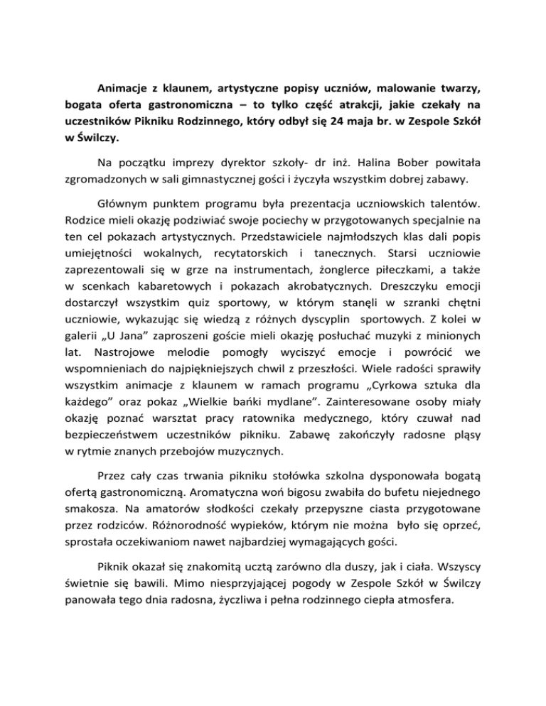 Animacje z klaunem, artystyczne popisy uczniów, malowanie twarzy, bogata oferta gastronomiczna – to tylko część atrakcji, jakie czekały na uczestników Pikniku Rodzinnego, który odbył się 24 maja br. w Zespole Szkół w Świlczy. Na początku imprezy dyrektor szkoły- dr inż. Halina Bober powitała zgromadzonych w sali gimnastycznej gości i życzyła wszystkim dobrej zabawy. Głównym punktem programu była prezentacja uczniowskich talentów. Rodzice mieli okazję podziwiać swoje pociechy w przygotowanych specjalnie na ten cel pokazach artystycznych. Przedstawiciele najmłodszych klas dali popis umiejętności wokalnych, recytatorskich i tanecznych. Starsi uczniowie zaprezentowali się w grze na instrumentach, żonglerce piłeczkami, a także w scenkach kabaretowych i pokazach akrobatycznych. Dreszczyku emocji dostarczył wszystkim quiz sportowy, w którym stanęli w szranki chętni uczniowie, wykazując się wiedzą z różnych dyscyplin sportowych. Z kolei w galerii „U Jana” zaproszeni goście mieli okazję posłuchać muzyki z minionych lat. Nastrojowe melodie pomogły wyciszyć emocje i powrócić we wspomnieniach do najpiękniejszych chwil z przeszłości. Wiele radości sprawiły wszystkim animacje z klaunem w ramach programu „Cyrkowa sztuka dla każdego” oraz pokaz „Wielkie bańki mydlane”. Zainteresowane osoby miały okazję poznać warsztat pracy ratownika medycznego, który czuwał nad bezpieczeństwem uczestników pikniku. Zabawę zakończyły radosne pląsy w rytmie znanych przebojów muzycznych. Przez cały czas trwania pikniku stołówka szkolna dysponowała bogatą ofertą gastronomiczną. Aromatyczna woń bigosu zwabiła do bufetu niejednego smakosza. Na amatorów słodkości czekały przepyszne ciasta przygotowane przez rodziców. Różnorodność wypieków, którym nie można było się oprzeć, sprostała oczekiwaniom nawet najbardziej wymagających gości. Piknik okazał się znakomitą ucztą zarówno dla duszy, jak i ciała. Wszyscy świetnie się bawili. Mimo niesprzyjającej pogody w Zespole Szkół w Świlczy panowała tego dnia radosna, życzliwa i pełna rodzinnego ciepła atmosfera. Szczególne podziękowania należą się rodzicom, którzy od samego początku angażowali się w przygotowanie pikniku, stali się sponsorami wielu nagród, chętnie służyli pomocą i poświęcili nam swój wolny czas. Bez ich udziału ta impreza nie nabrałaby tak niepowtarzalnego uroku. Serdecznie dziękujemy!